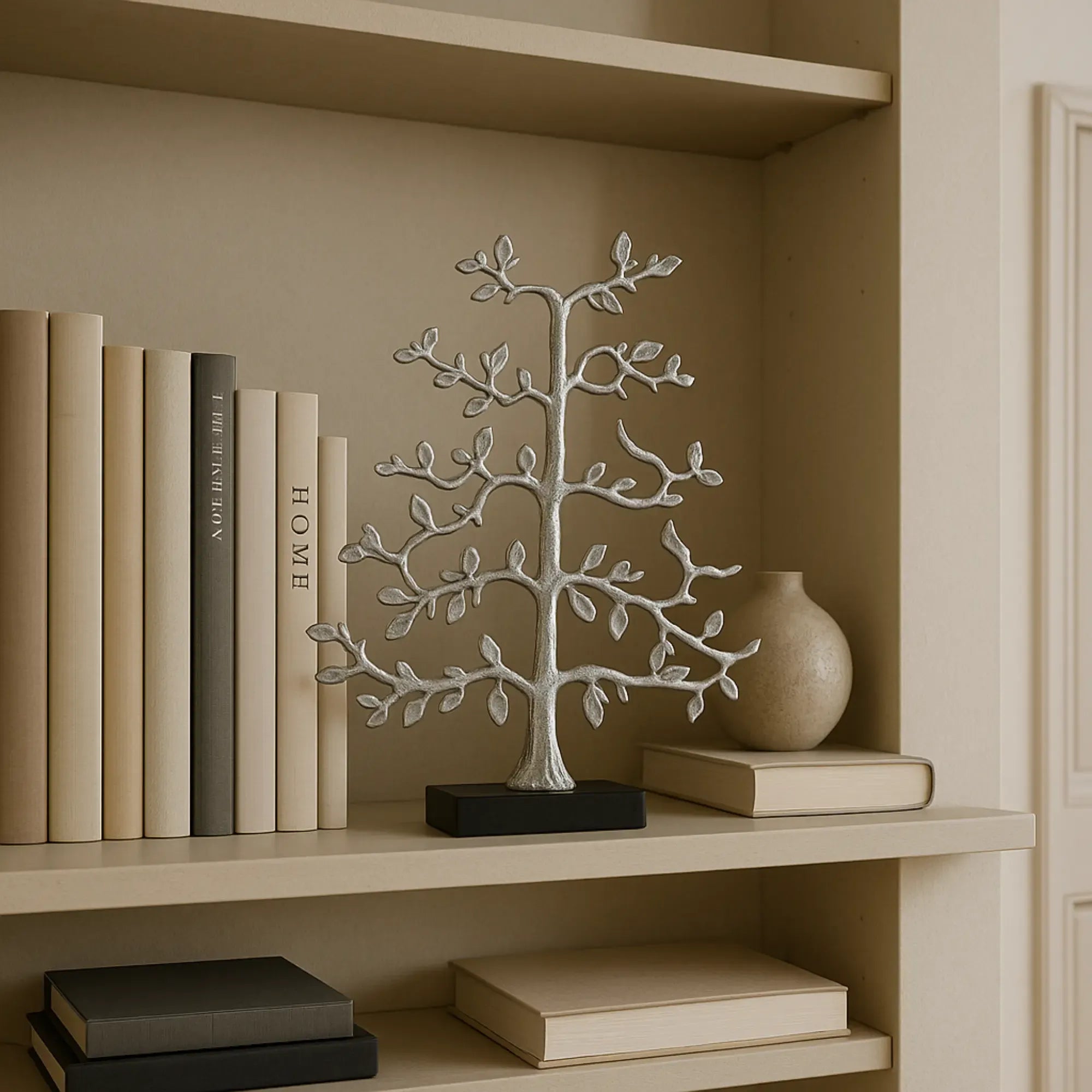 Modern und gleichzeitig symbolisch – der Lebensbaum steht für Ruhe, Wachstum und Ausgeglichenheit. Die silberne Oberfläche verleiht ihm eine luxuriöse, spirituelle Ausstrahlung.
