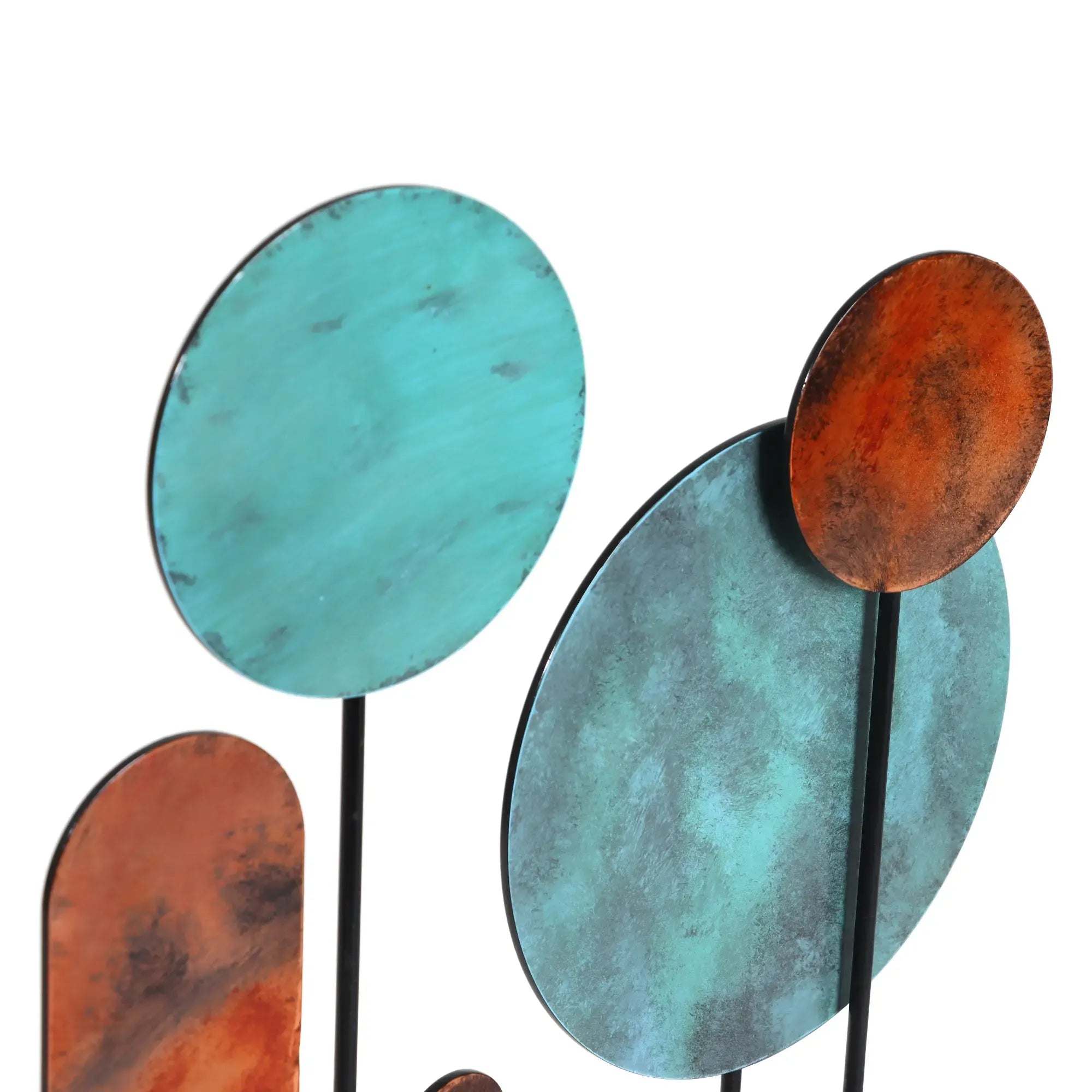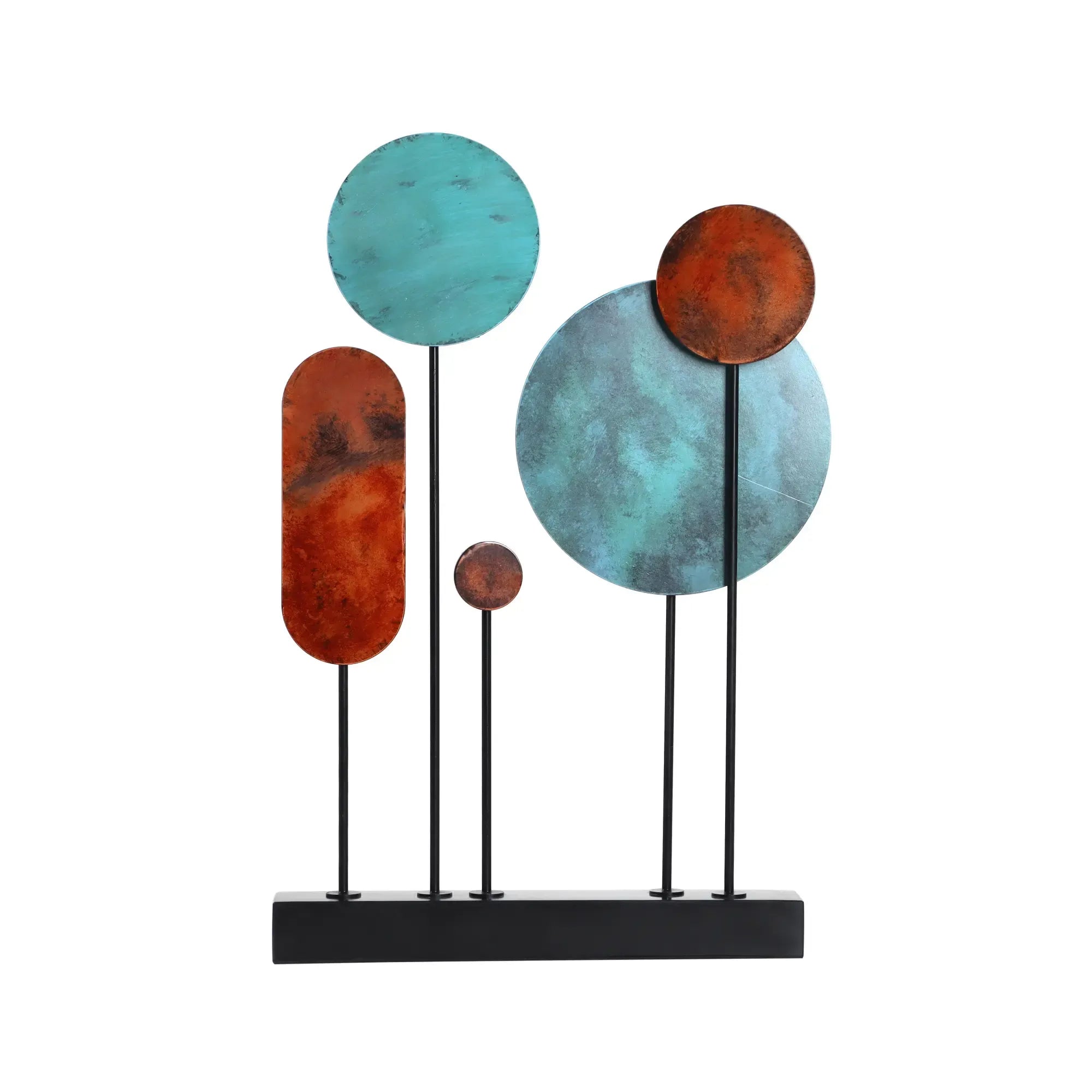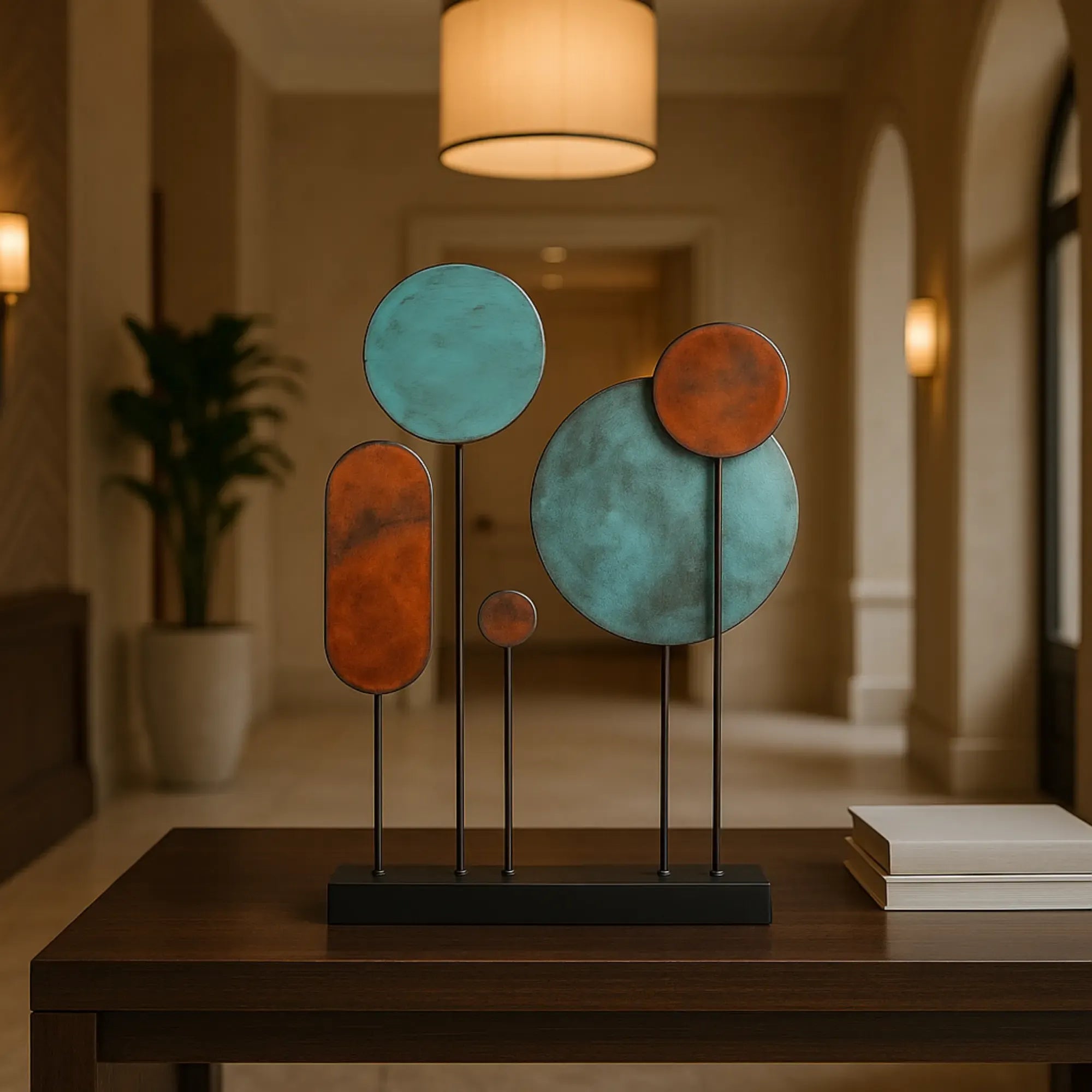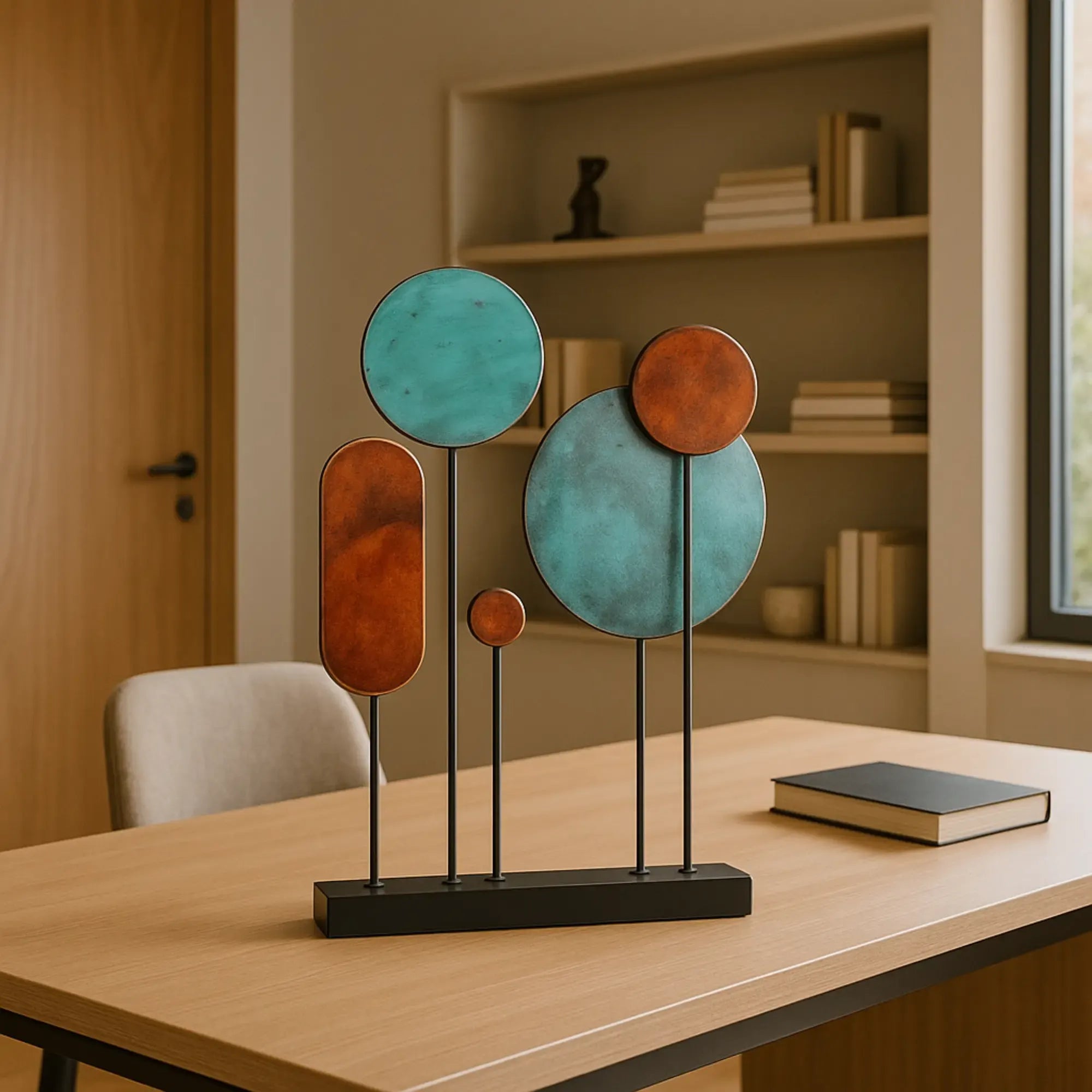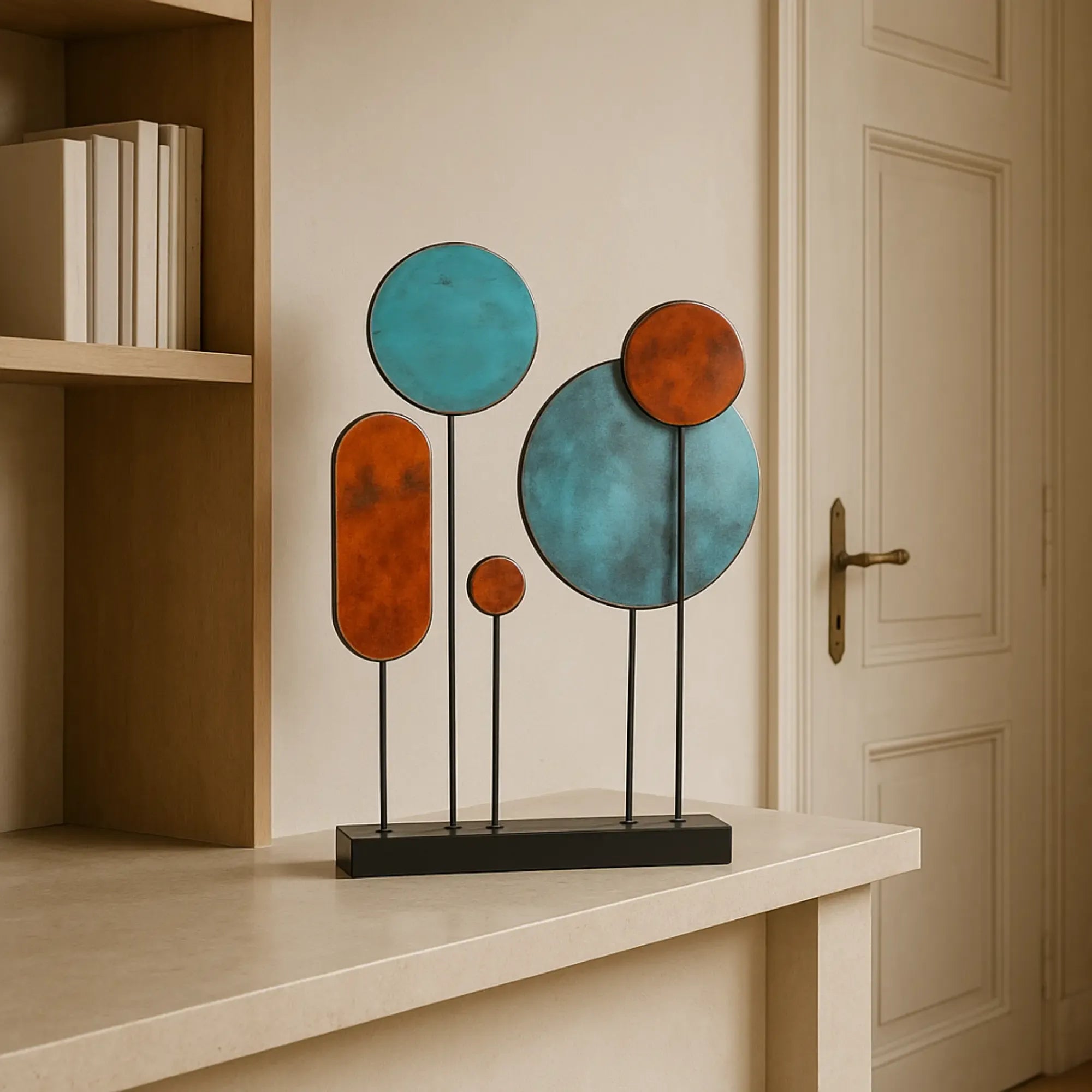 Moderne Metallskulptur in Türkis und Kupfer – das Arte Astratta verbindet geometrische Klarheit mit künstlerischer Tiefe im Stil norwegischer Abstraktion. Die abstrakte Skulptur besteht aus oxidierten Stahlflächen in Antikblau und Antikrot, die in verschiedenen Höhen auf einem eleganten Marmorsockel angeordnet sind. Die Komposition erinnert an ein Bild im Raum – ein dreidimensionaler Bildersatz für die Wand, der durch Farbe, Material und Form beeindruckt. Die Patina-Optik sorgt für Charakter, während die starke Farbgebung Mut und Präsenz in den Raum bringt. Inspiriert von Industrial Chic, abstrakter Kunst und einem norwegischen, sehr modernen Stil, eignet sich dieses Kunstobjekt perfekt für Wohnzimmer, Sideboards, Büros, Empfangsbereiche oder Designhotels. Es wirkt als architektonischer Akzent mit skulpturaler Leichtigkeit. Ein hochwertiges und mutiges Geschenk zur Einweihung – für alle, die moderne Kunst, geometrische Formen und ausdrucksstarke Wohnaccessoires schätzen.