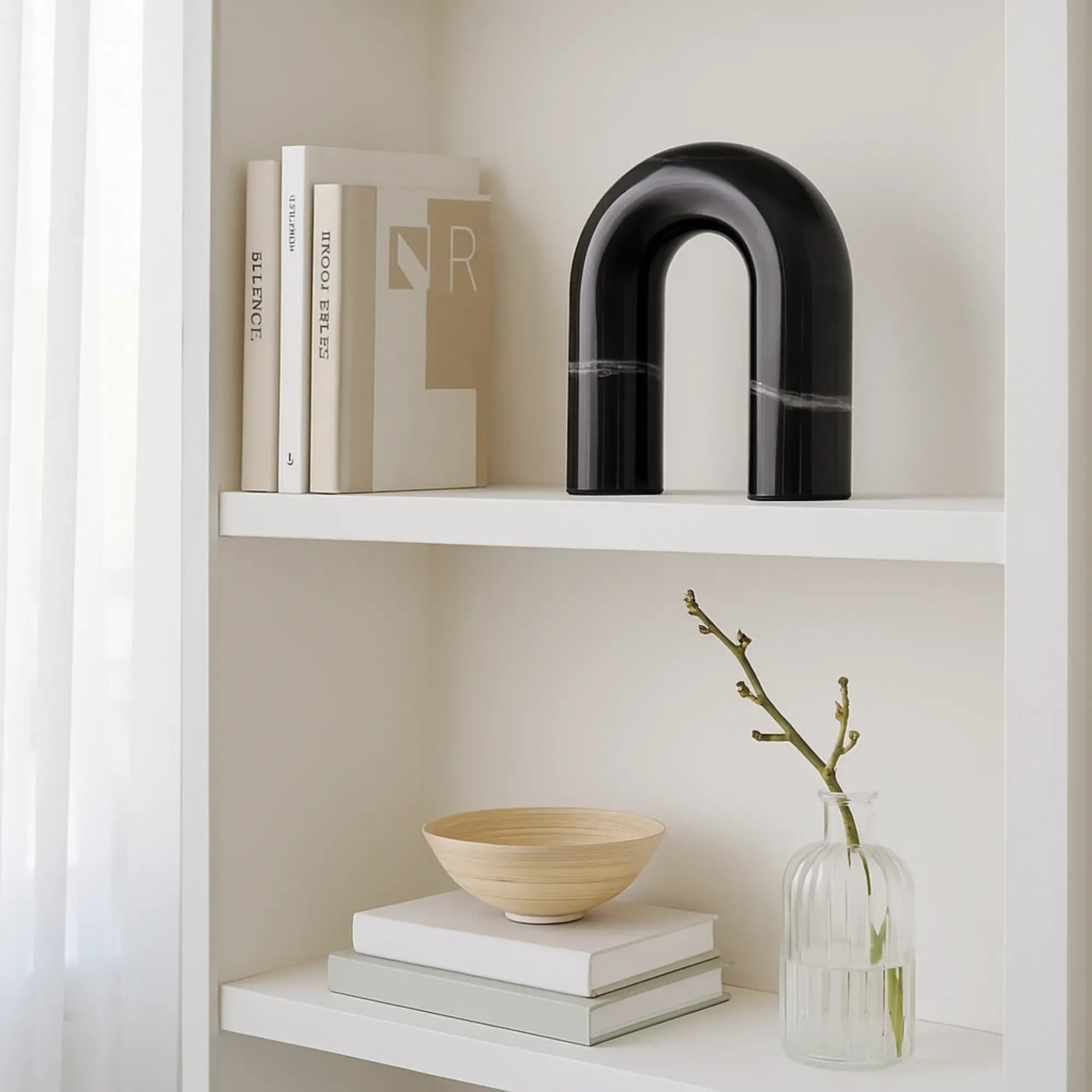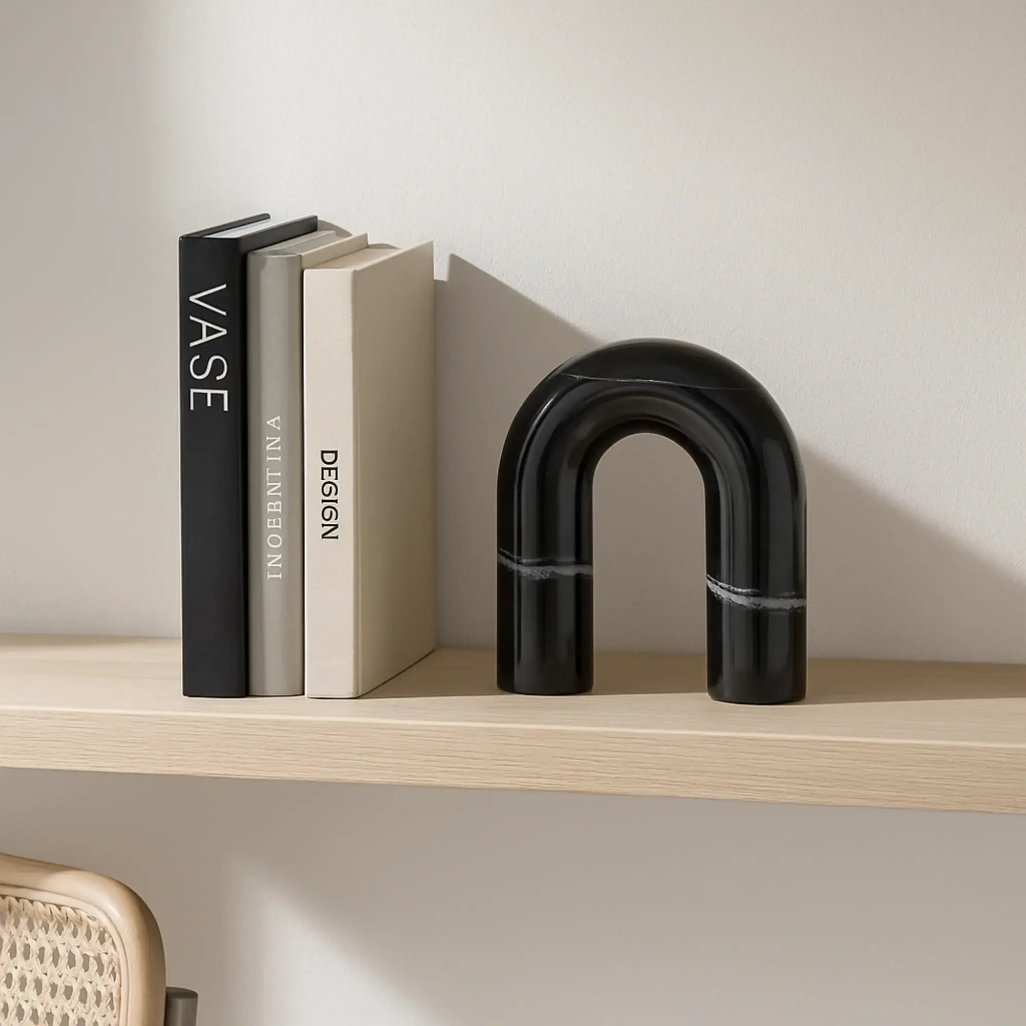 Das Dekorationsobjekt „Metas“ kombiniert zeitlose Eleganz mit markanter Präsenz. Gefertigt aus feinpoliertem, tiefschwarzem Marmor, strahlt es natürliche Schwere und kraftvolle Stabilität aus – ideal für moderne Interior-Konzepte mit Charakter. Die klare U-Form verleiht dem Objekt architektonische Stärke und macht es vielseitig einsetzbar: als Designobjekt auf dem Sideboard, Skulptur auf dem Tisch oder – dank seines Gewichts – auch als Buchstütze oder Regalstütze aus Naturstein. Durch seine hohe Masse bleibt es zuverlässig standfest. Ein stilvolles Wohnaccessoire für alle, die Dekoration aus Marmor, minimalistisches Design und funktionale Ästhetik vereinen möchten – auch als Geschenkidee für Designliebhaber mit Blick fürs Besondere.