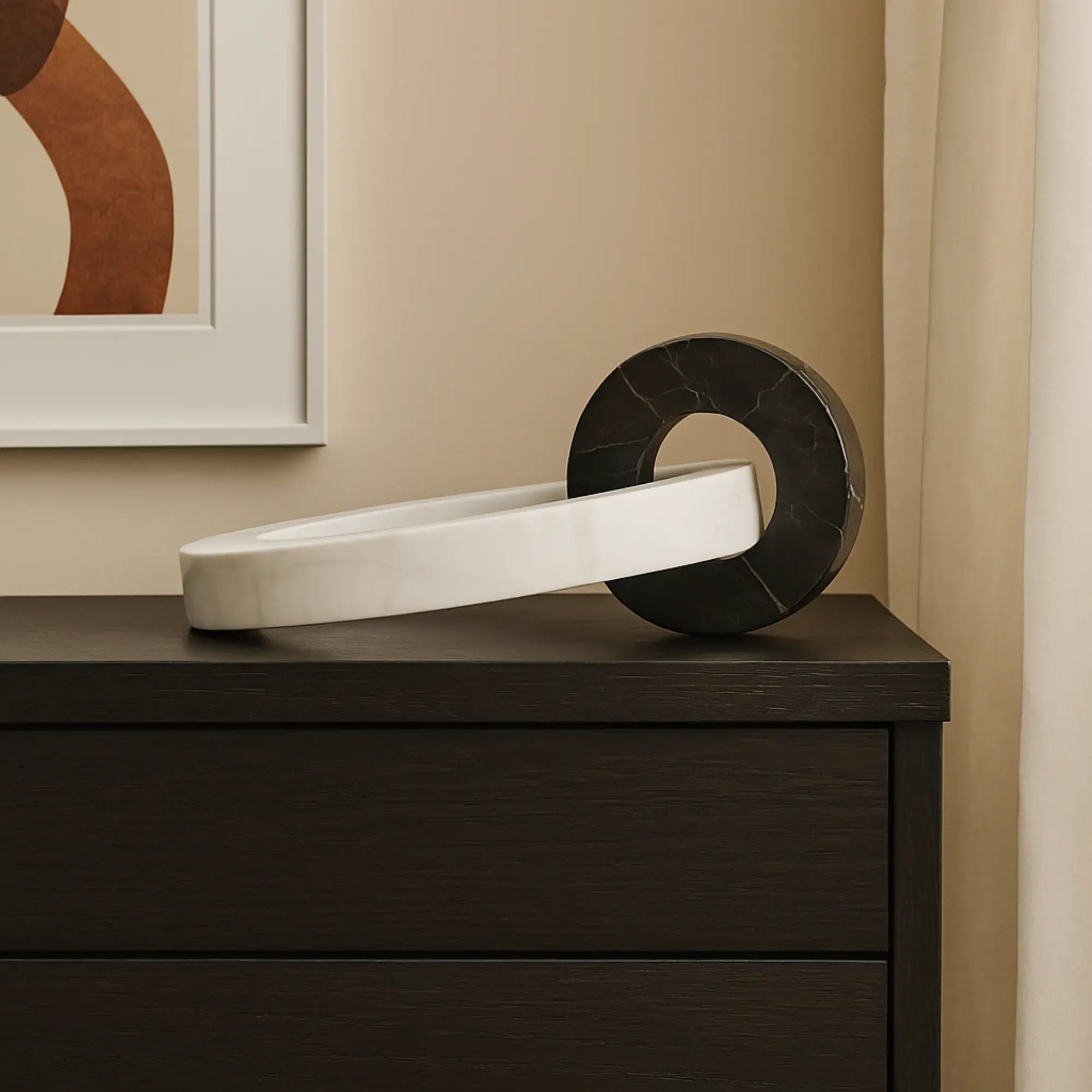 Dekorative Marmorringe, Ewigkeitsringe aus Marmor, modernes Designobjekt, Buchstütze Marmor, skulpturale Wohnaccessoires, Geschenkidee Einzug, schwarz-weiße Marmordeko.