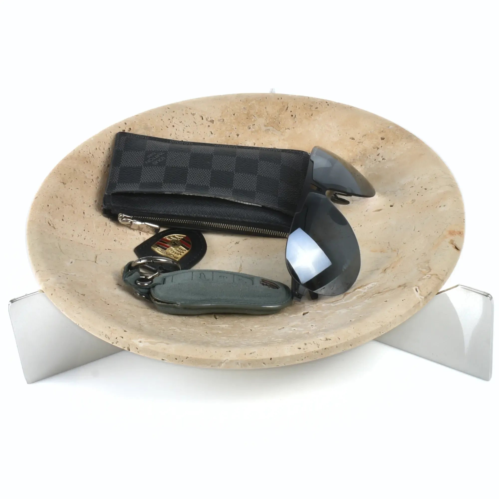 Handgefertigte Schale aus sandfarbenem Travertin mit feiner Naturstruktur, kombiniert mit einer gebürsteten Edelstahlbasis für moderne Eleganz und Stabilität.