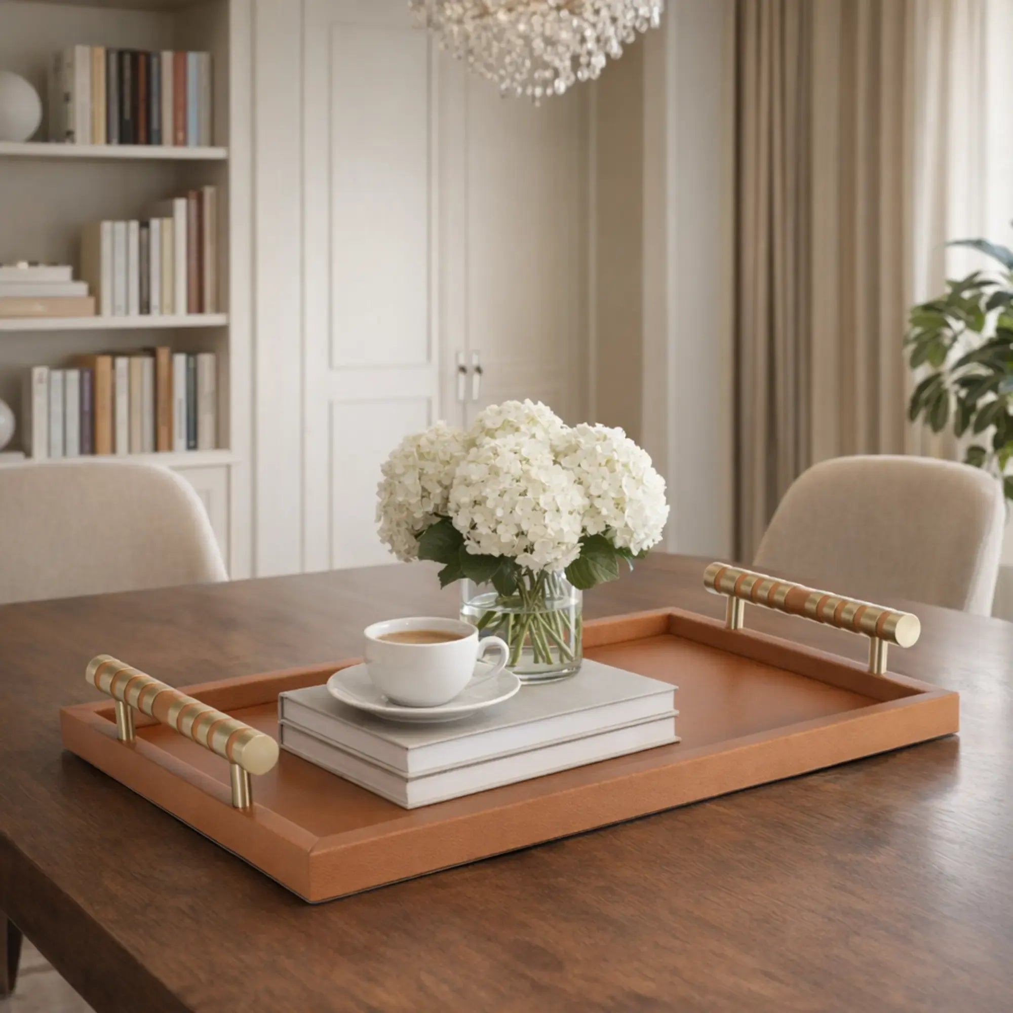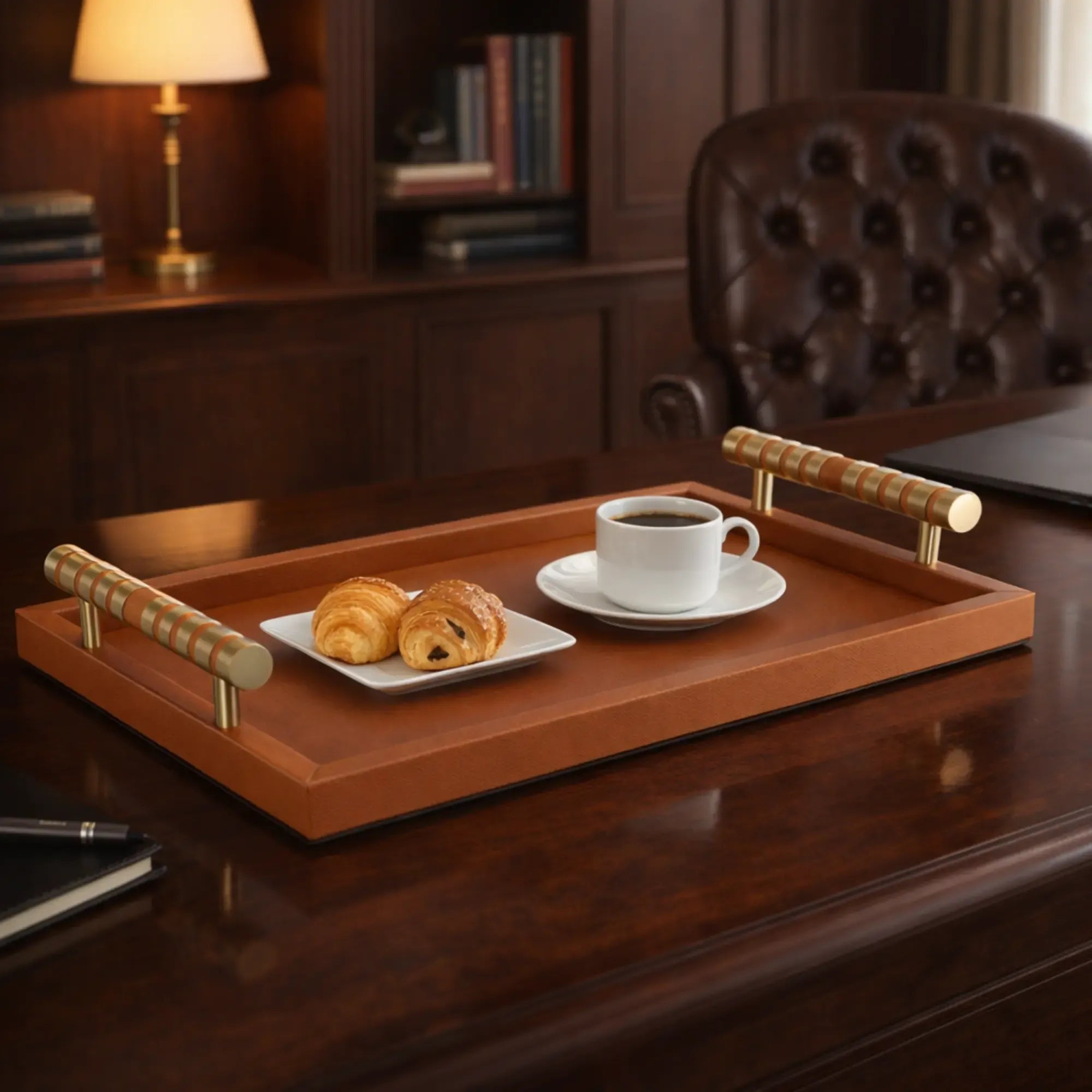 Dieses rechteckige Design-Tablett verbindet cognacfarbenes, fein genarbtes Veganleder mit warm schimmerndem Messing. Präzise gefalzte Kanten rahmen die plane Ablage; die zylindrischen Griffbügel sitzen auf satinierten Stützen und zeigen eine rhythmisierte Ringstruktur aus Metall und Leder—ein taktiles Detail mit skulpturaler Klarheit. Die moderne, zeitlose Formsprache wirkt ruhig und souverän; der Materialkontrast betont Handwerk, Balance und Geometrie. Ein funktionales Objekt, zugleich Dekoration, Kunstobjekt und Bühne für geordnete Arrangements.