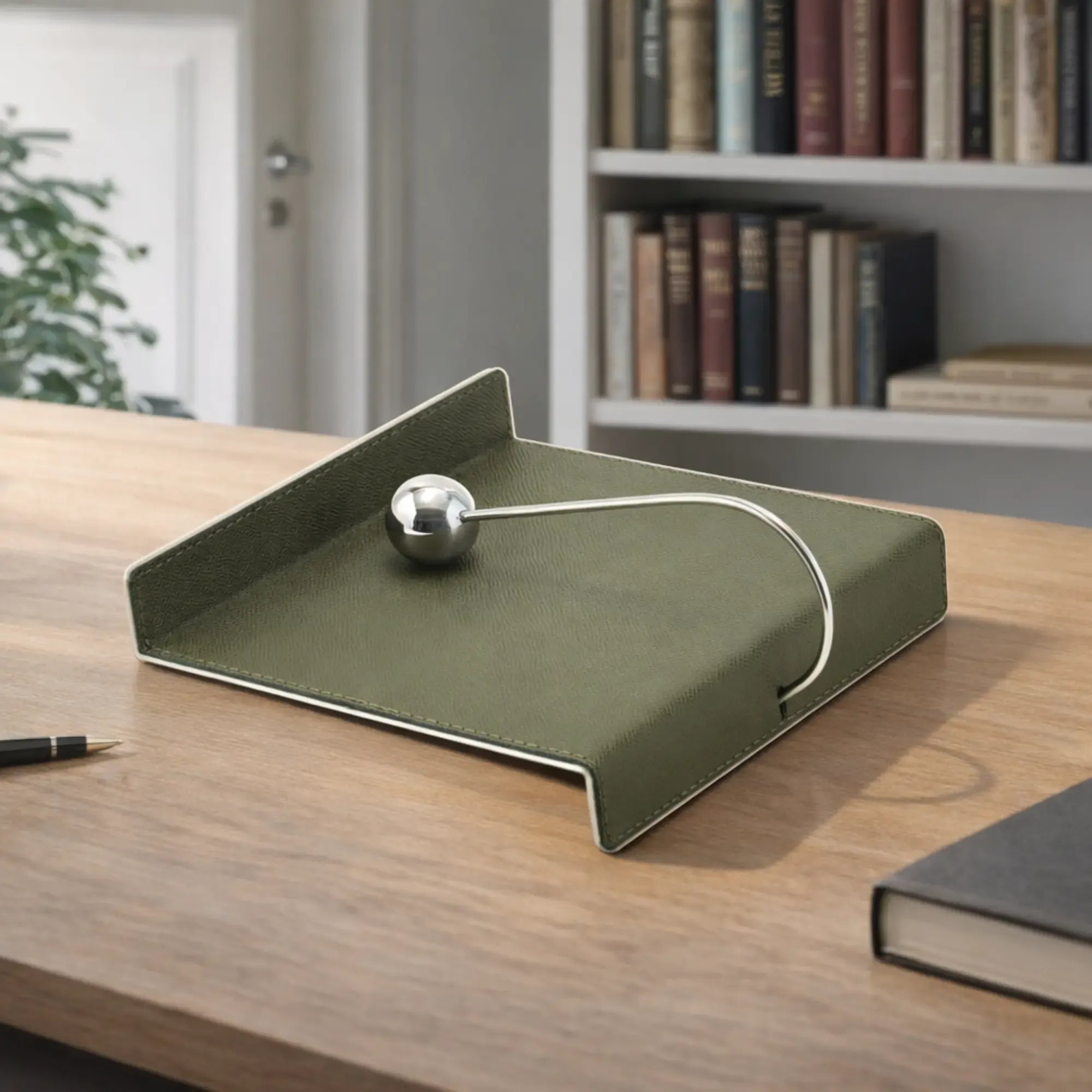 Dieser skulpturale Serviettenhalter inszeniert Ordnung als Designobjekt. Der klare L‑Korpus ist in olivgrüner, fein geprägter Lederoptik handbezogen; die Kanten wirken präzise gefalzt. Ein geschwungener Edelstahlbügel mit massiver Kugel hält den Stapel, erzeugt Spannungsbogen und Balance — eine Bauhaus-inspirierte Geste. Matt strukturierte Fläche trifft auf spiegelnden Metallglanz; das noble Küchenaccessoire wird zur kleinen Tischskulptur. Funktion, Geometrie und haptische Qualität verbinden sich zu dauerhafter, zeitloser Dekoration.