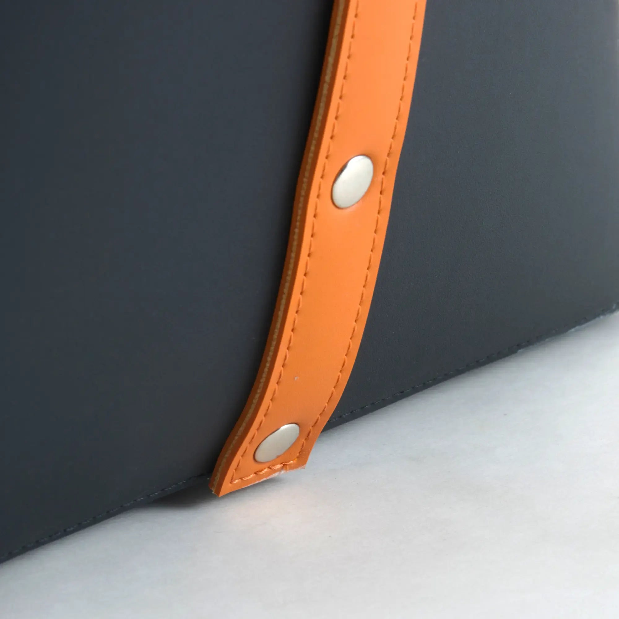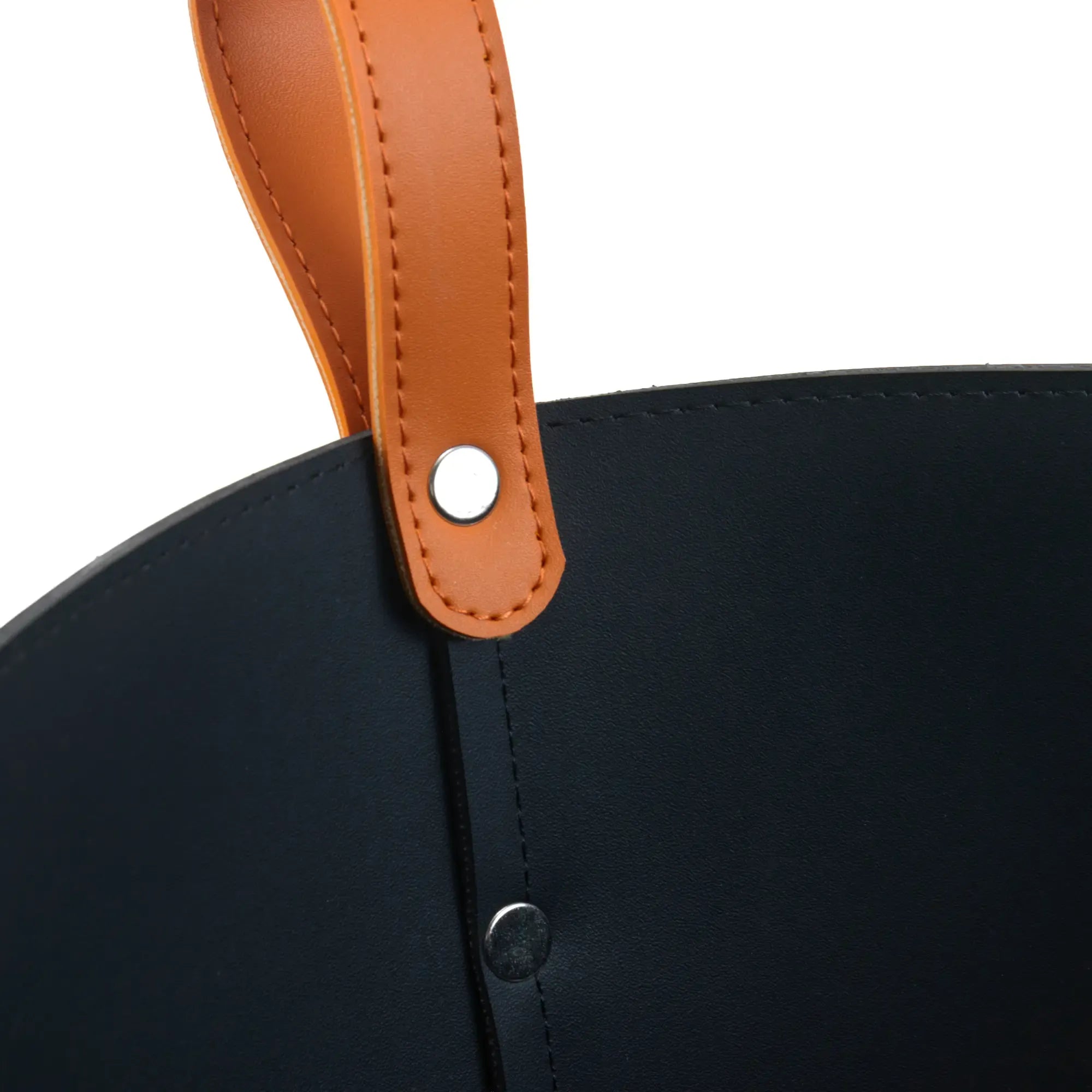 Cognacfarbene Lederriemen mit Metallnieten; sauber gefalzte Kanten, gleichmäßige Steppnaht.