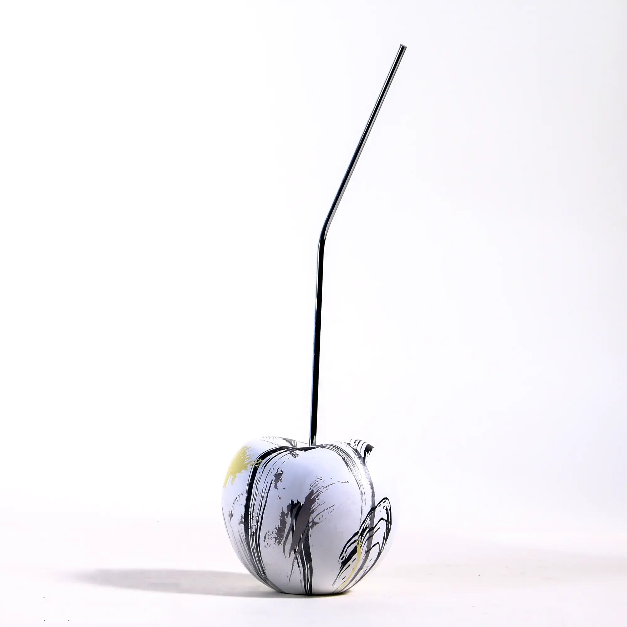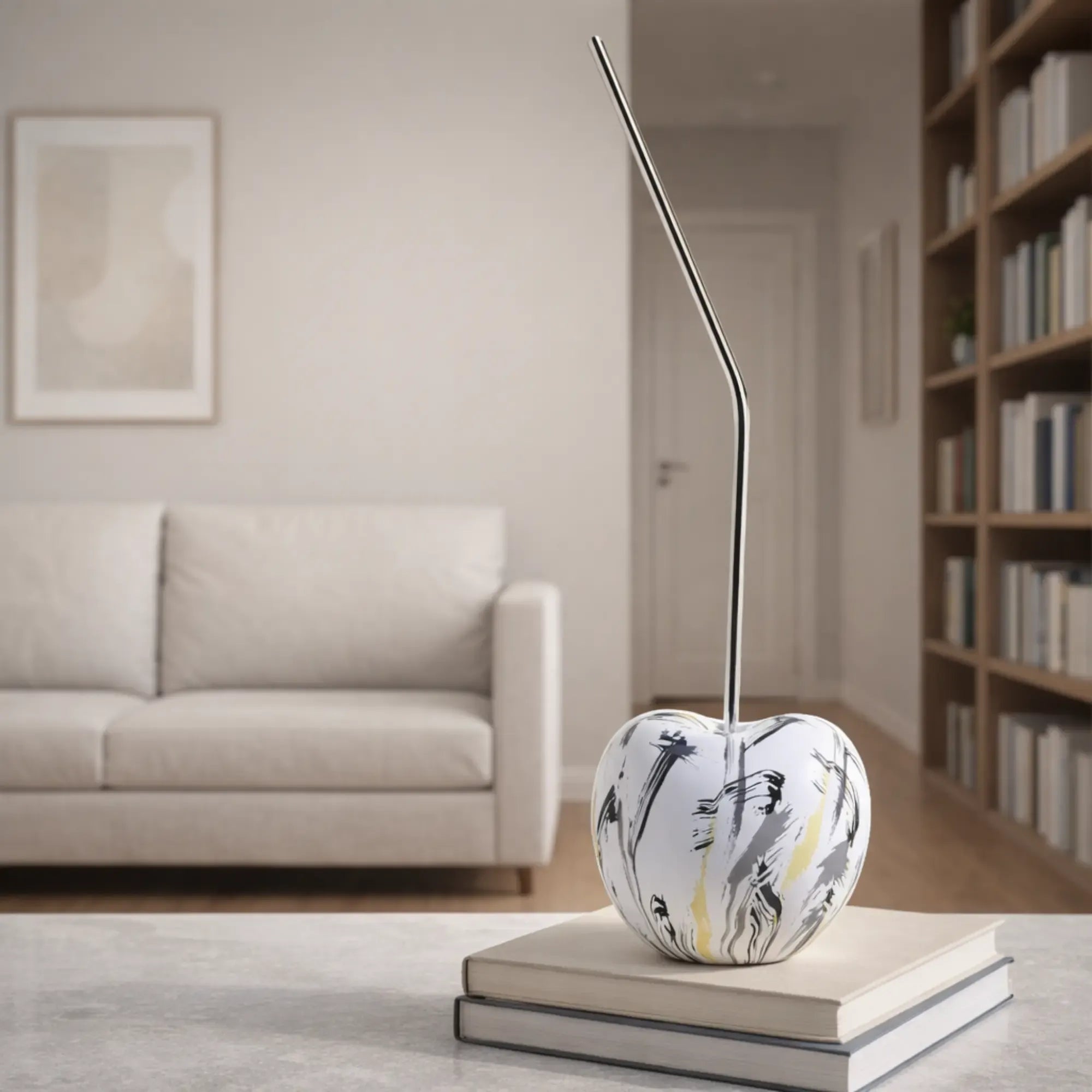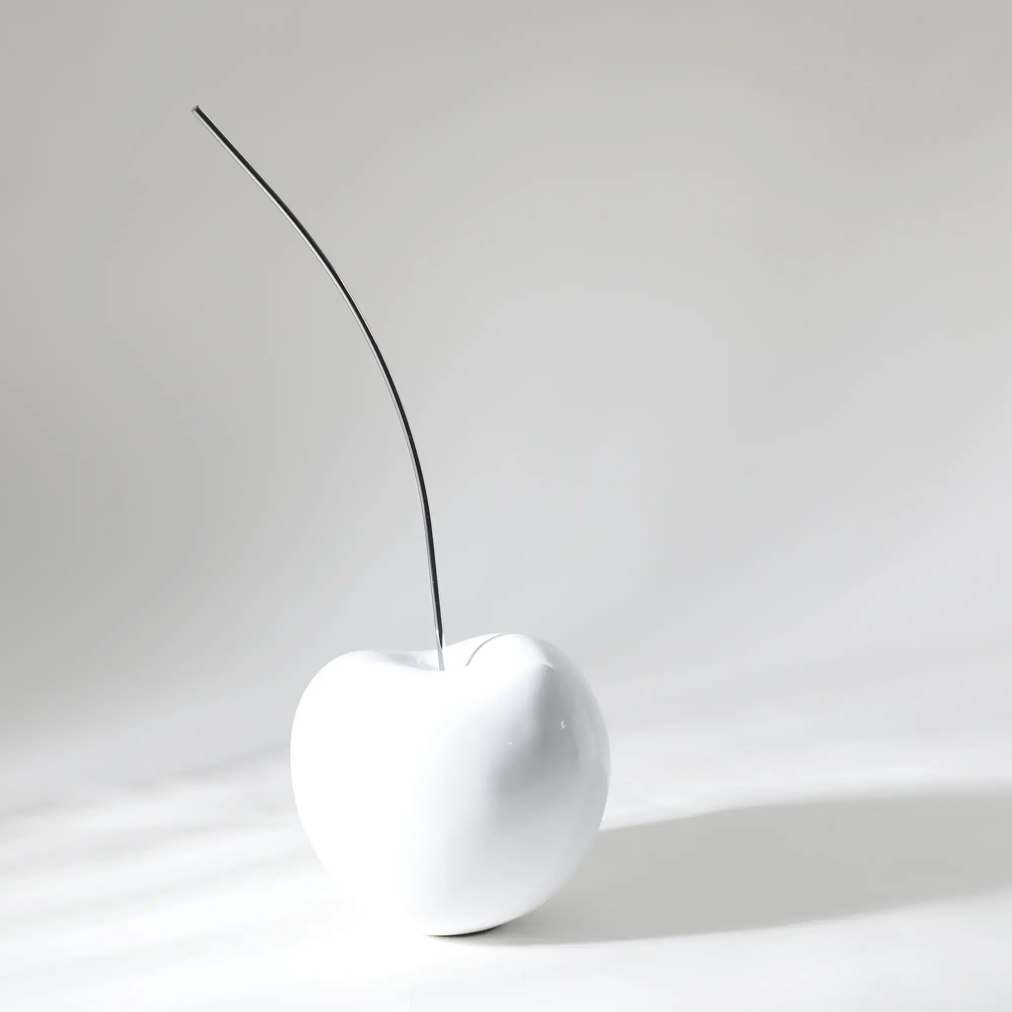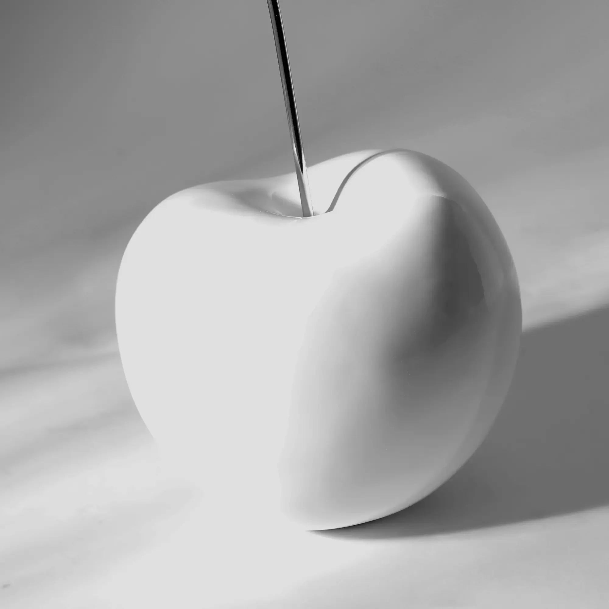 Diese Kirsch-Skulptur verbindet klare Geometrie mit skulpturaler Leichtigkeit. Korpus aus fein gebrannter Keramik, seidig-poliert; schlanker Stiel aus satiniertem Edelstahl setzt einen kühlen Kontrapunkt. Zwei Ausführungen: reinweiß hochglänzend oder weiß mit expressiven, handgesetzten Brush-Art-Akzenten in Schwarz und warmem Gold. Die weiche Volumenform fängt Licht weich ein, der verlängerte Stiel streckt die Silhouette und erzeugt grafische Spannung. Einzeln oder als harmonisches Set erhältlich – Objekt, Figur und Designskulptur zugleich.