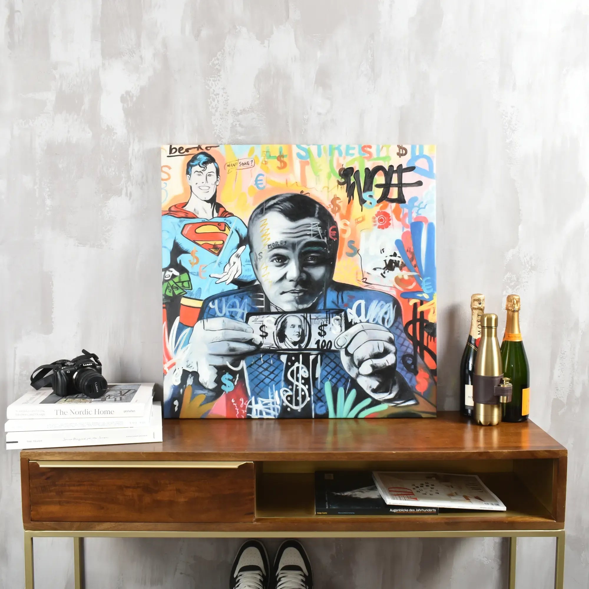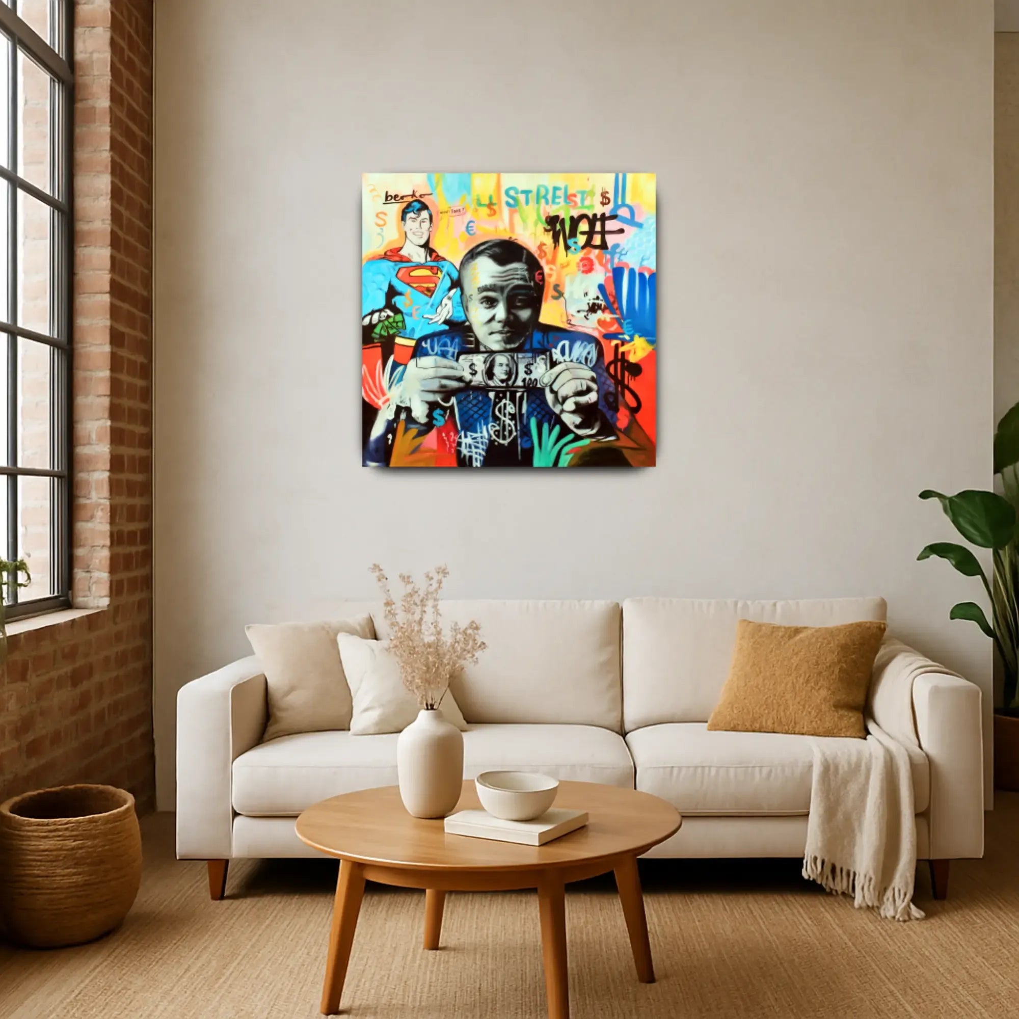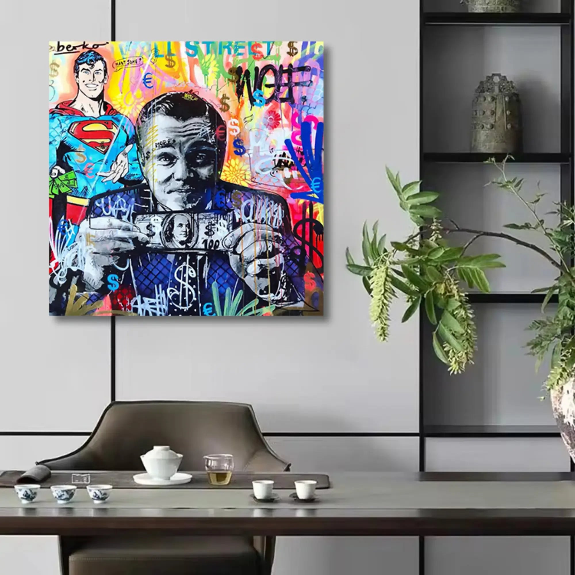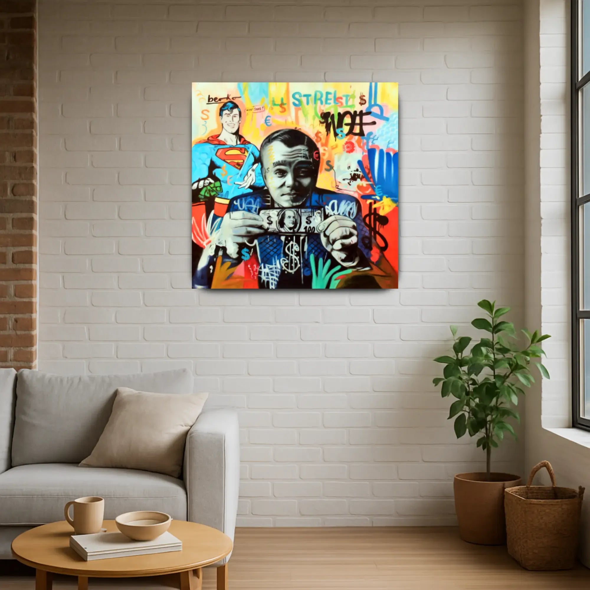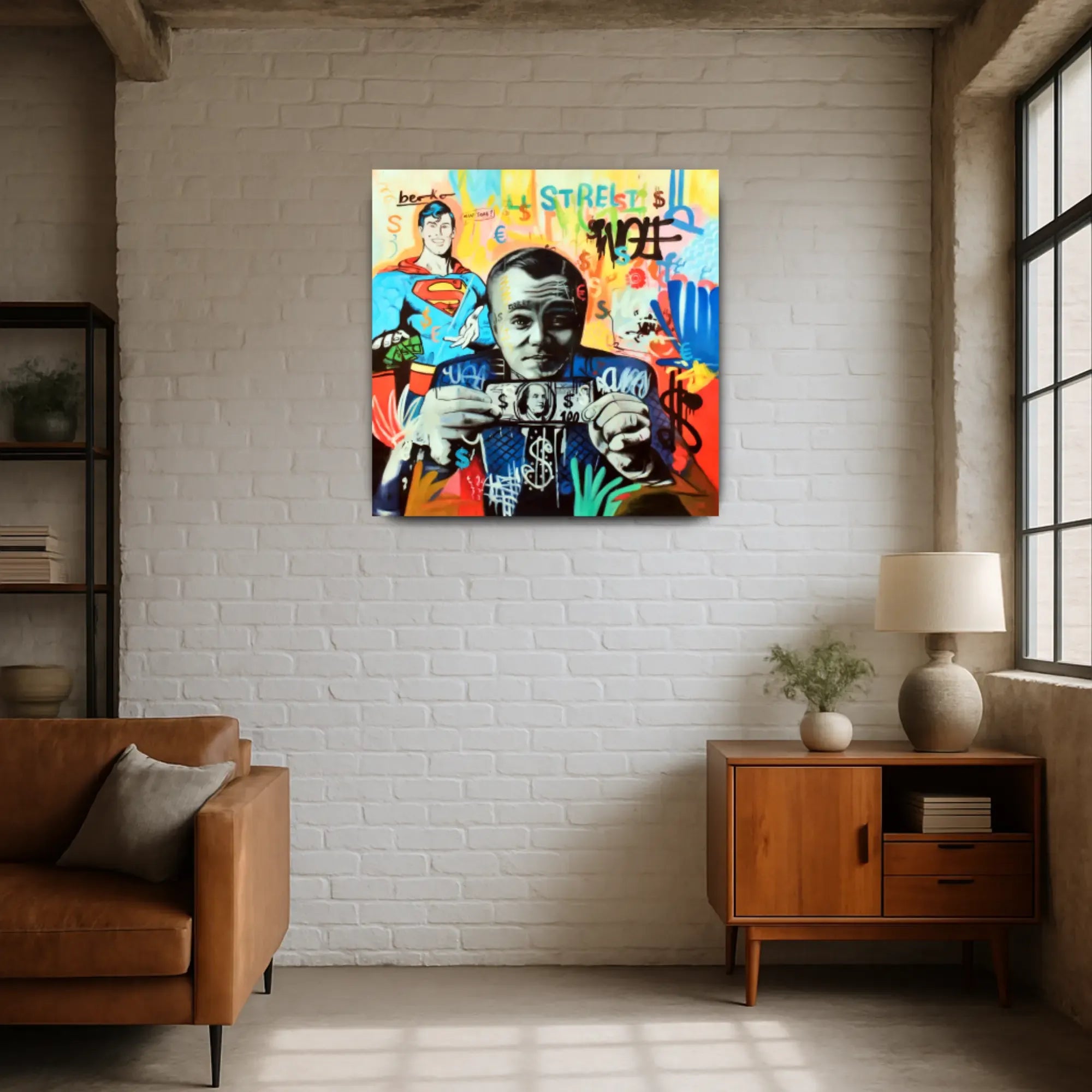 Ein farbintensives Urban-Pop-Art-Gemälde, das Kapitalismuskritik, Medienikonen und Straßenästhetik verschmilzt. Im Zentrum: ein Mann, der einen 100-Dollar-Schein in die Kamera hält – als käme er aus der Welt von „The Wolf of Wall Street“. Dahinter: Superman, ironisch grinsend, mit Coffee-to-go und Dollarbündel in der Hand. Umgeben von Dollarzeichen, Euro-Symbolen, Sprechblasen, Tags und Graffiti-Elementen entsteht ein überzeichneter Mikrokosmos der westlichen Geldkultur.