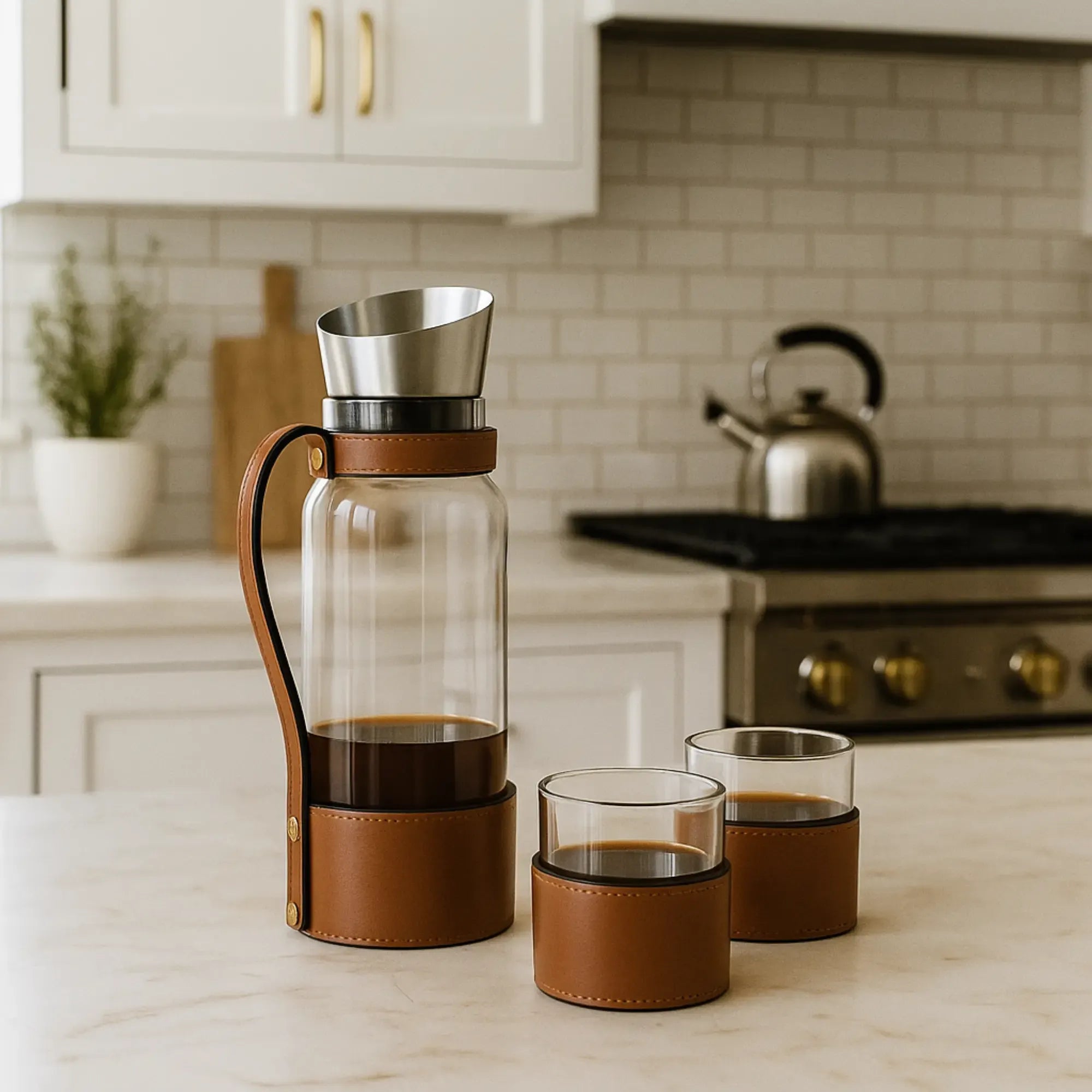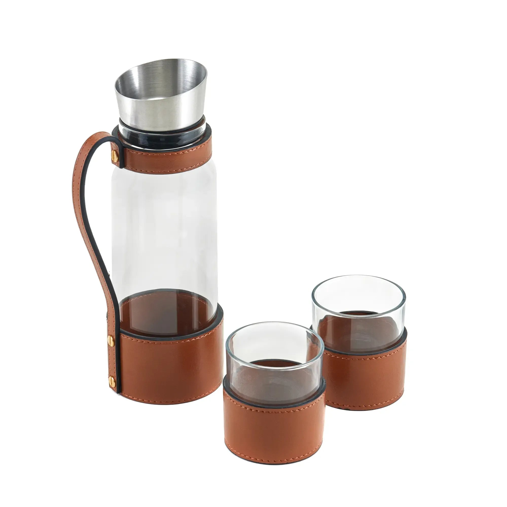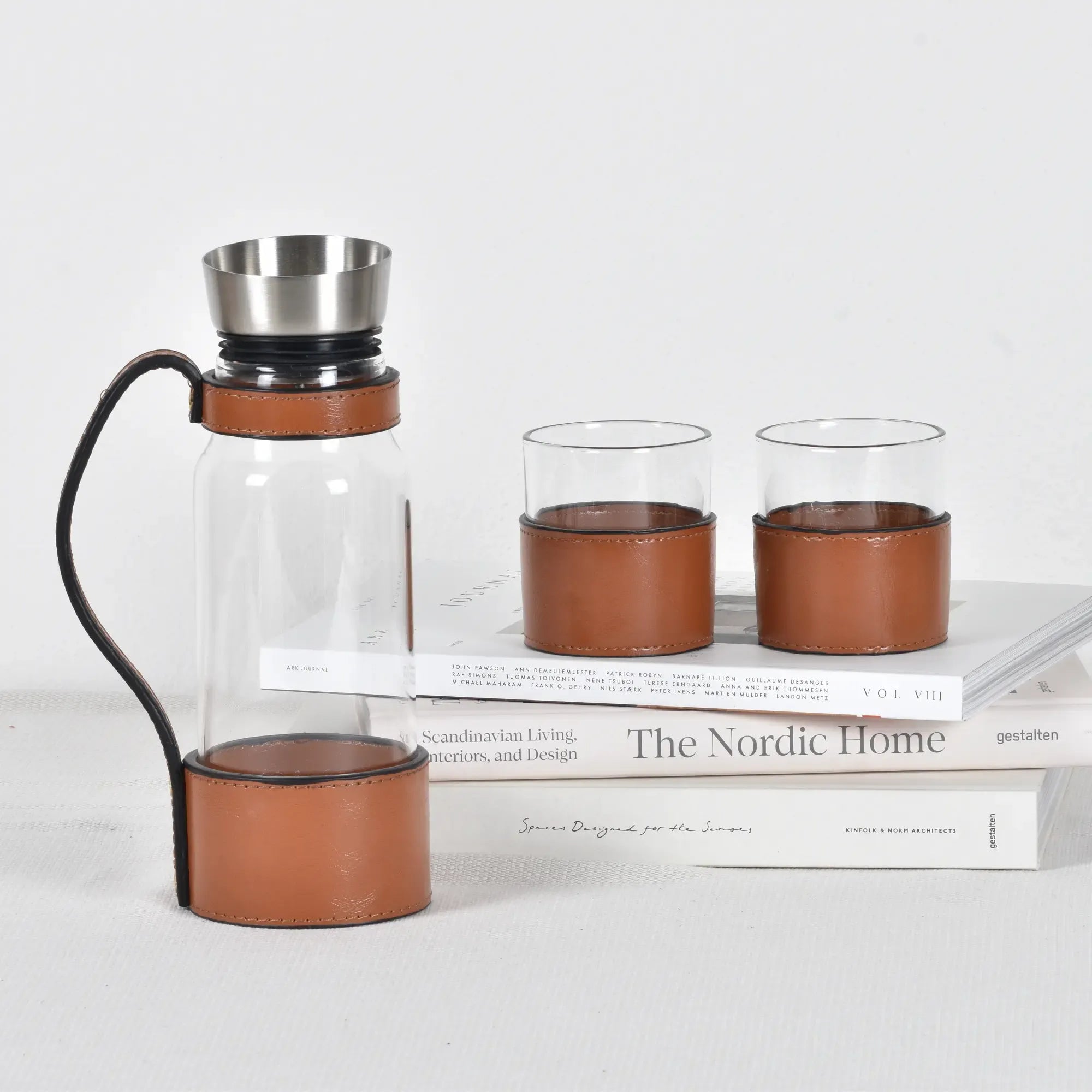 Design Glaskaraffe mit Edelstahlverschluss, lederummantelte Trinkgläser, elegantes Glasset mit Griff, modernes Servierset aus Glas und Kunstleder, minimalistisches Wohnaccessoire, hochwertiges Geschenkset zur Einweihung oder für die Sommerzeit, stilvoll kombinierbar mit Marmoraccessoires.