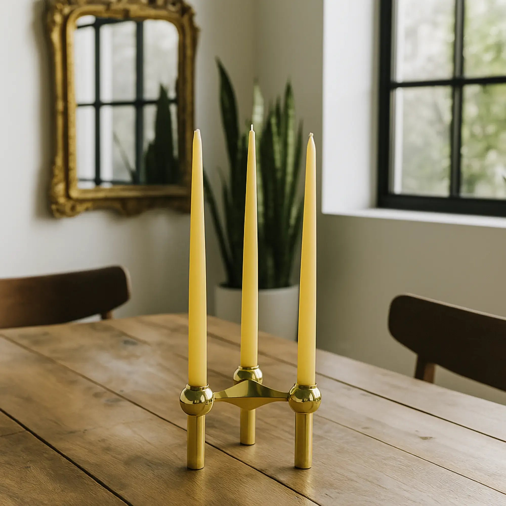 Zeitlose Eleganz in modularer Form – dieser skandinavisch inspirierte Leuchter ist eine Hommage an die ikonischen Entwürfe von Werner Stoff und Hans Nagel. Die dreibeinige Triade mit kugelförmigen Köpfen wirkt skulptural und luftig zugleich. Das hochglänzende Messing-Finish fängt das Licht edel ein und verleiht jedem Raum eine warme, festliche Note.