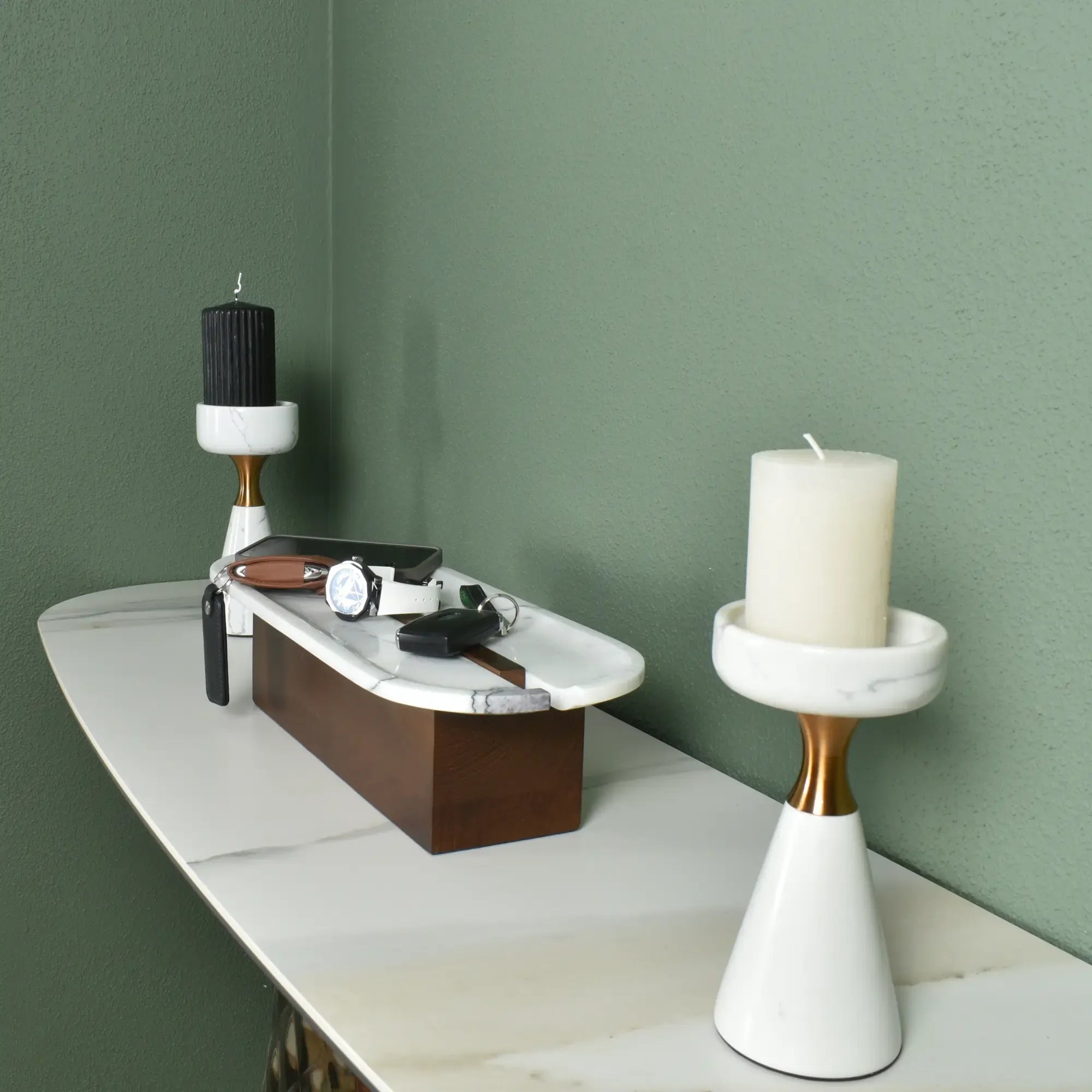 Kerzenhalter aus Marmor und Aluminium, stilvolles Wohnaccessoire, elegantes Dekoelement, hochwertig verarbeitet, passt zu allen Dekoideen, auch als exklusives Einweihungsgeschenk oder Geschenkidee für Designliebhaber.
