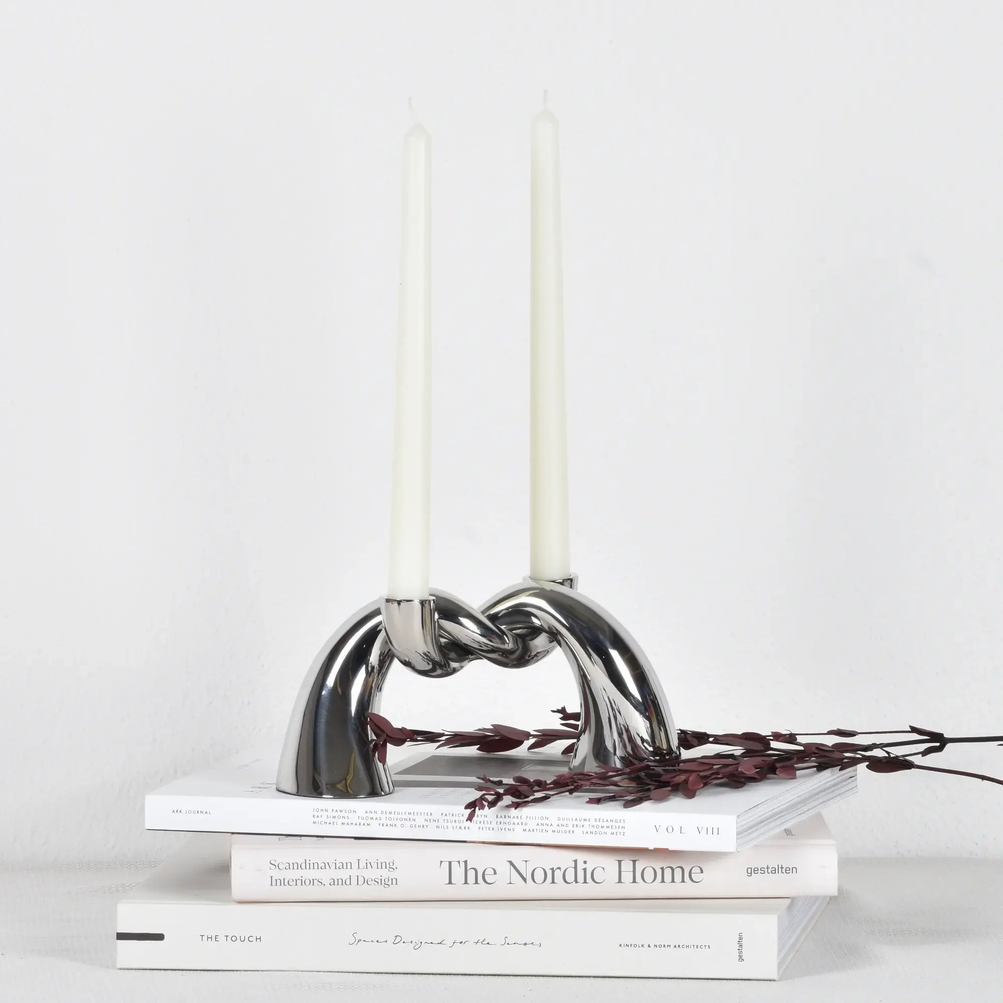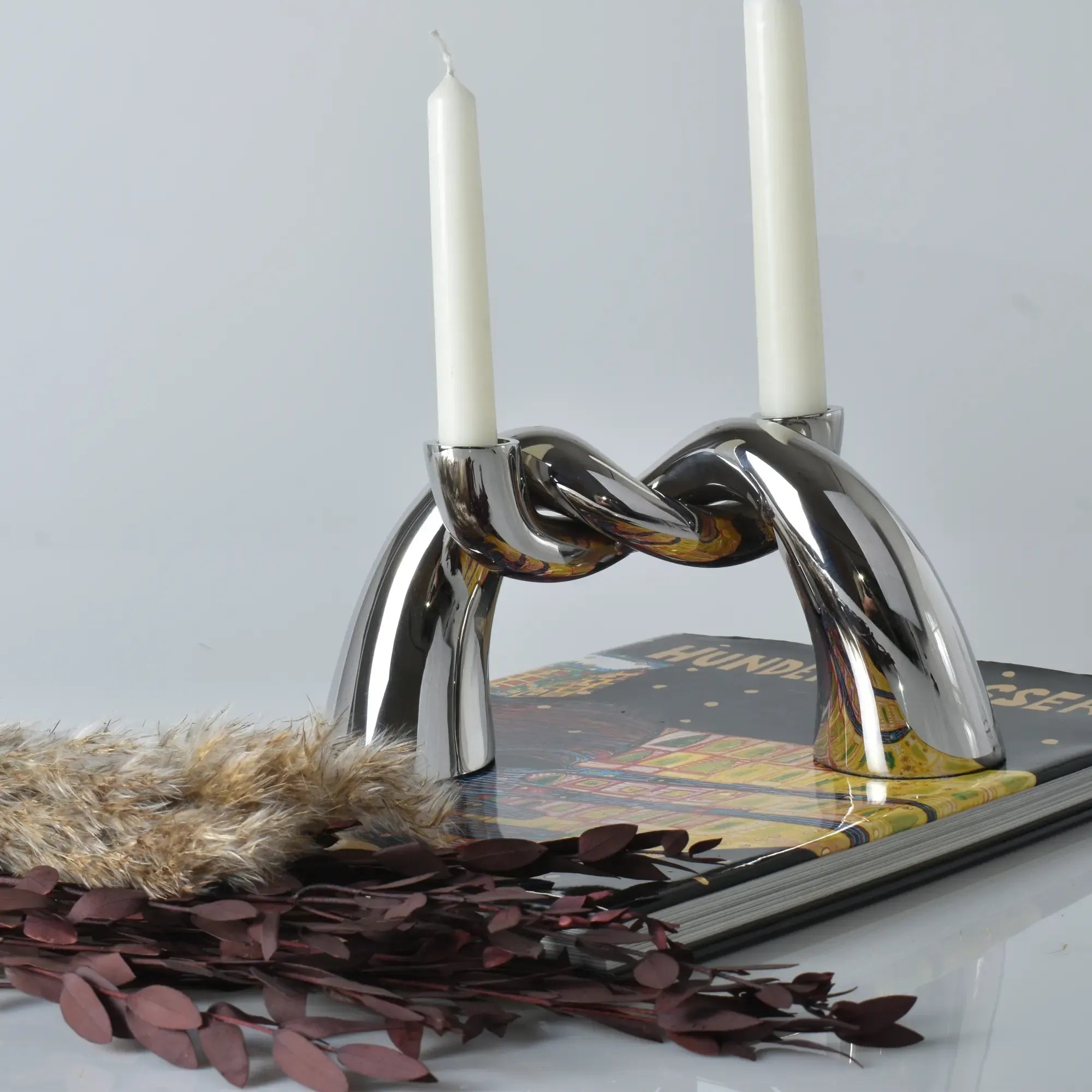 Twist Elegance ist ein moderner Kerzenhalter aus glänzendem Metall, der mit seiner skulpturalen Form und hochglanzpolierten Oberfläche sofort ins Auge fällt. Gefertigt aus massivem Edelstahl in edlem Silber, bringt er Eleganz, Gewicht und Präsenz auf jeden Tisch oder Kaminsims. Das ineinander verschlungene Knotendesign vereint Kunstobjekt und Funktion – ideal für romantische Abende, festliche Dinner oder stilvolle Dekorationen. Ob zu Hause, auf dem Balkon, in Hotels, Restaurants oder modernen Lounges, dieser zweiflammige Kerzenständer setzt glänzende Akzente. Handgemacht und hochwertig verarbeitet, ist das Twist Elegance Set ein perfektes Geschenk für Designliebhaber oder ein edles Highlight für Interior-Enthusiasten. Es lässt sich vielseitig kombinieren und bietet unzählige Dekorationsideen für anspruchsvolle Räume.