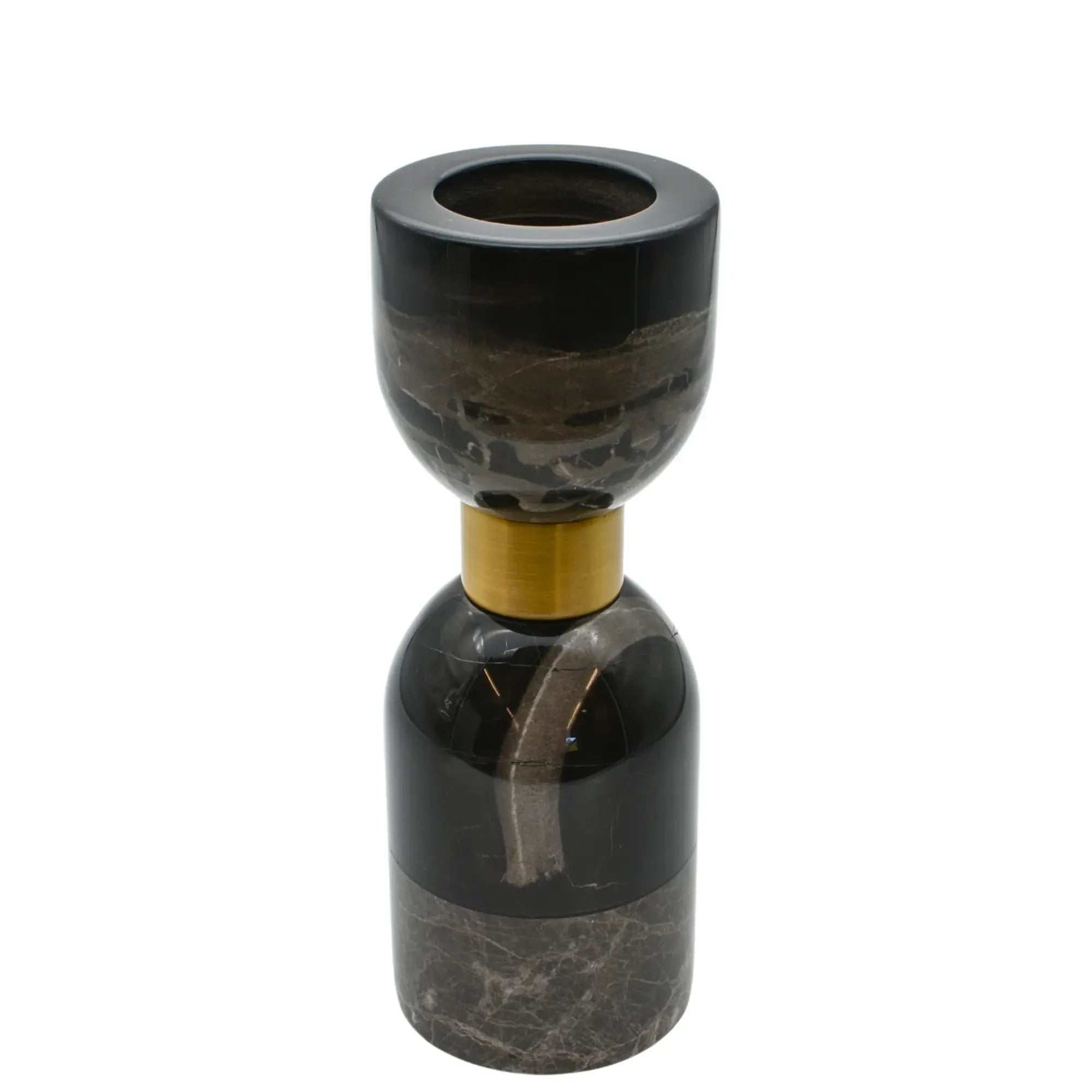 Die Obsidian Elegance Kerzenhalter kombinieren edlen schwarzen Marmor mit goldfarbenem Edelstahl zu einem luxuriösen Designobjekt. Ihre hochglänzende Oberfläche mit feiner Maserung verleiht jedem Raum eine exklusive Note, während die sanduhrartige Silhouette für architektonische Balance sorgt. Ob einzeln oder als Set, wirken sie gleichermaßen als Kerzenständer oder skulpturales Dekoobjekt. Besonders in Bücherregalen, auf Sideboards oder in offenen Regalen entfalten sie ihre elegante Präsenz. Dank ihres hochwertigen Materialmixes lassen sich die Kerzenhalter vielfältig in moderne, klassische oder minimalistische Wohnkonzepte integrieren. Ideal für Kerzenarrangements, stilvolle Dinner-Settings oder als Highlight unter vielen Dekorationsideen – ein zeitloses Geschenk für Designliebhaber:innen, Einweihungen oder besondere Anlässe. Ein stilvolles Statement für Räume, die Charakter und Klasse ausstrahlen.