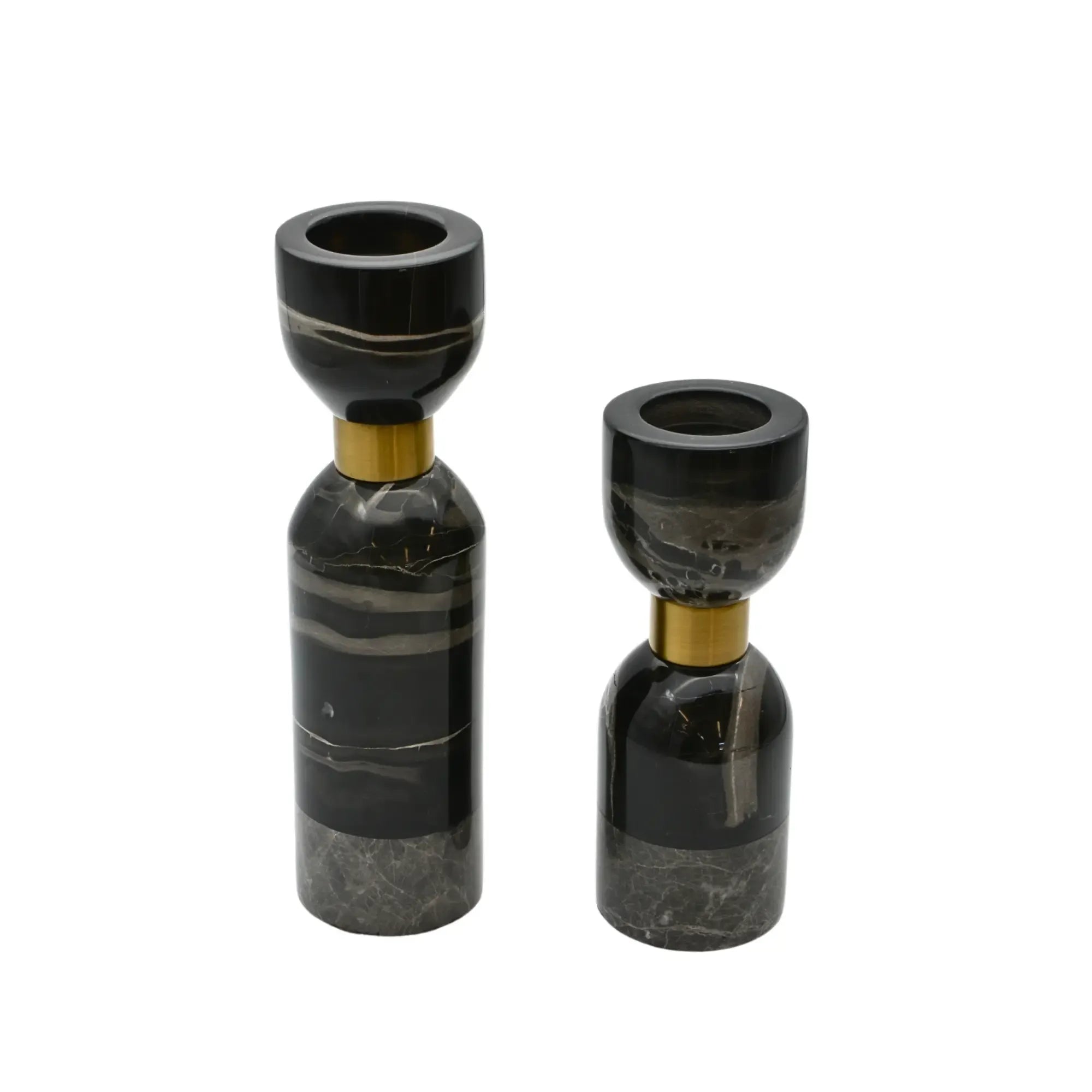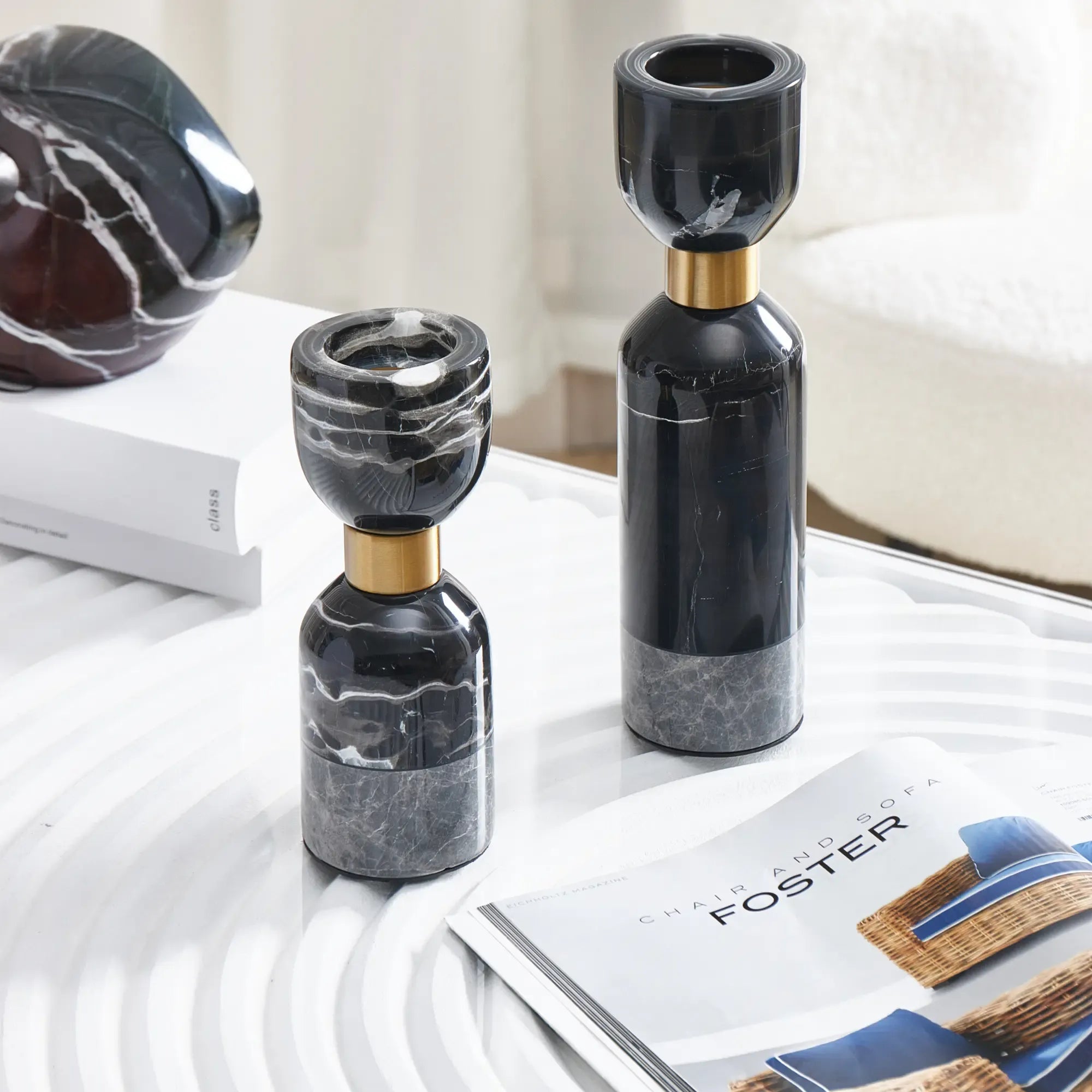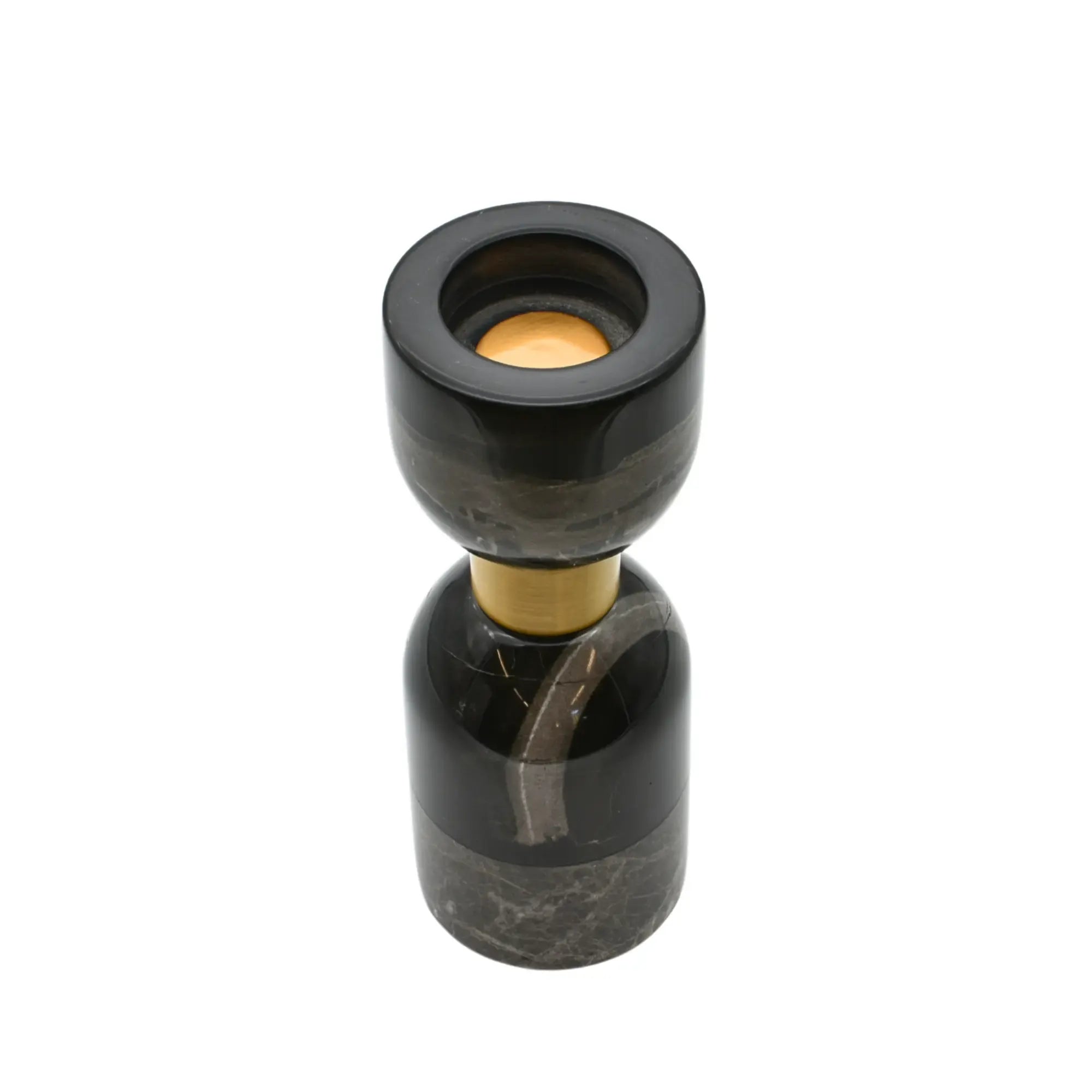 Kerzenhalter aus Marmor, Edelstahl-Detail modern, luxuriöse Tischdeko, schwarzer Marmor Kerzenständer, Dekoobjekt schwarz-gold, edle Geschenkidee, Designkerzenhalter für Bücherregal.