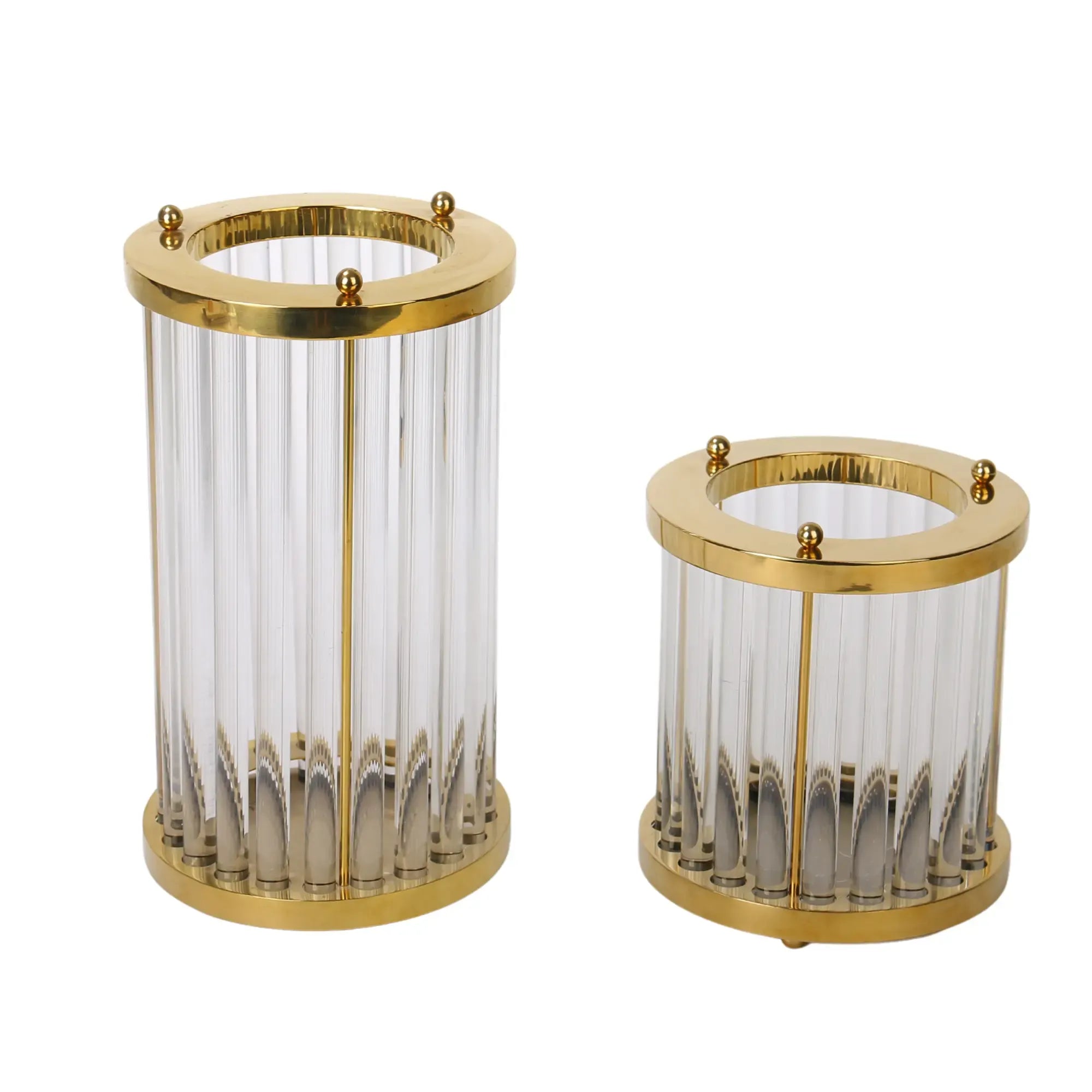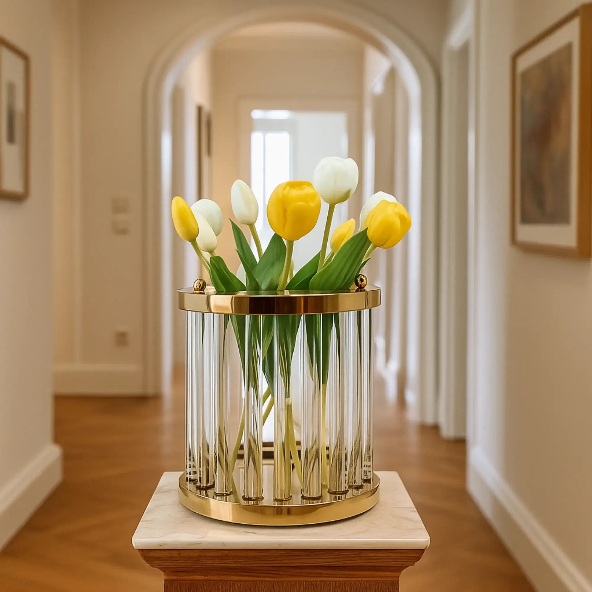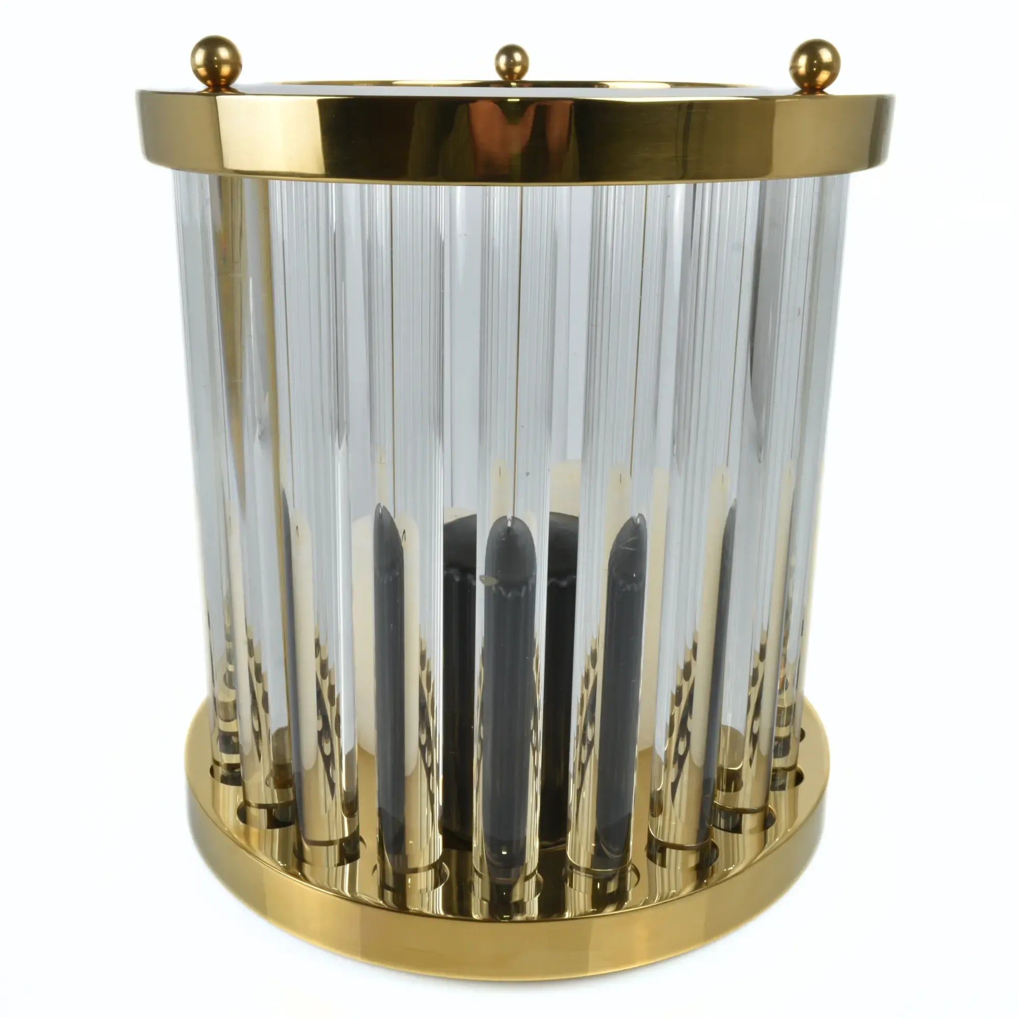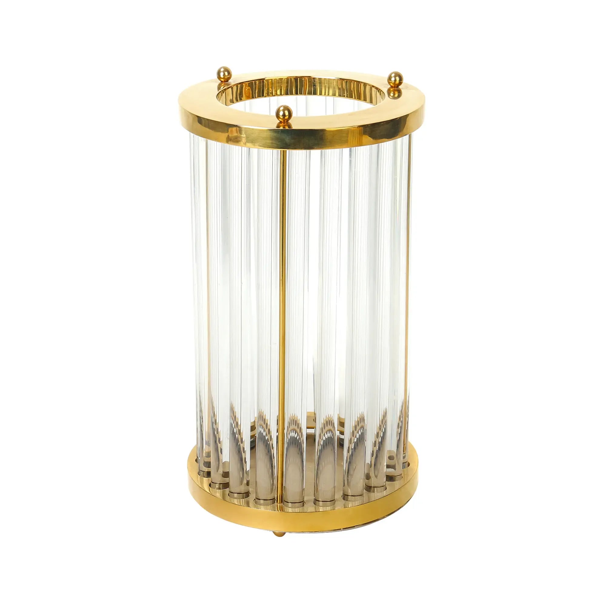 Luxuriöser Kerzenhalter in Zylinderform, auch als dekorative Vase nutzbar. Das italienisch inspirierte Design kombiniert goldfarbenes Metall mit transparenten Glasstäben, die das Kerzenlicht effektvoll reflektieren – ein edles Lichtspiel mit eleganter Tiefe.