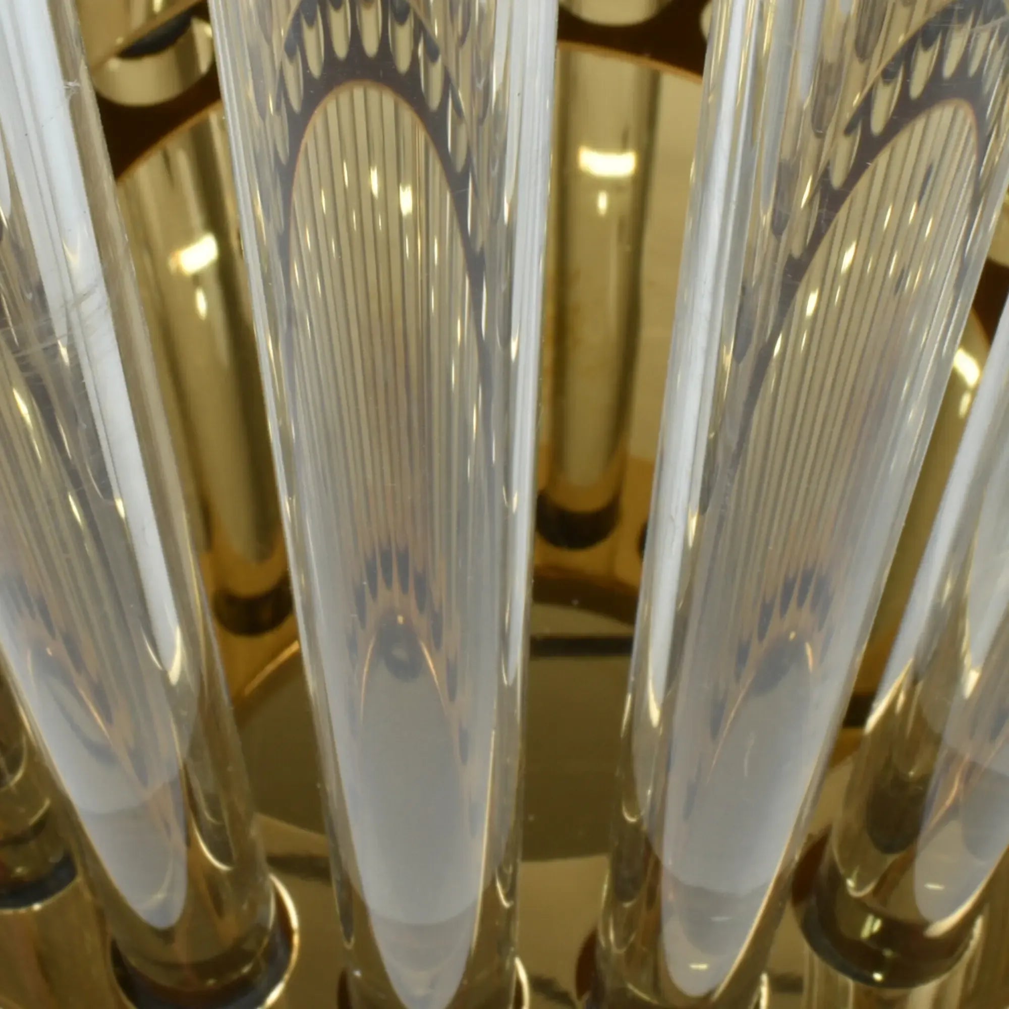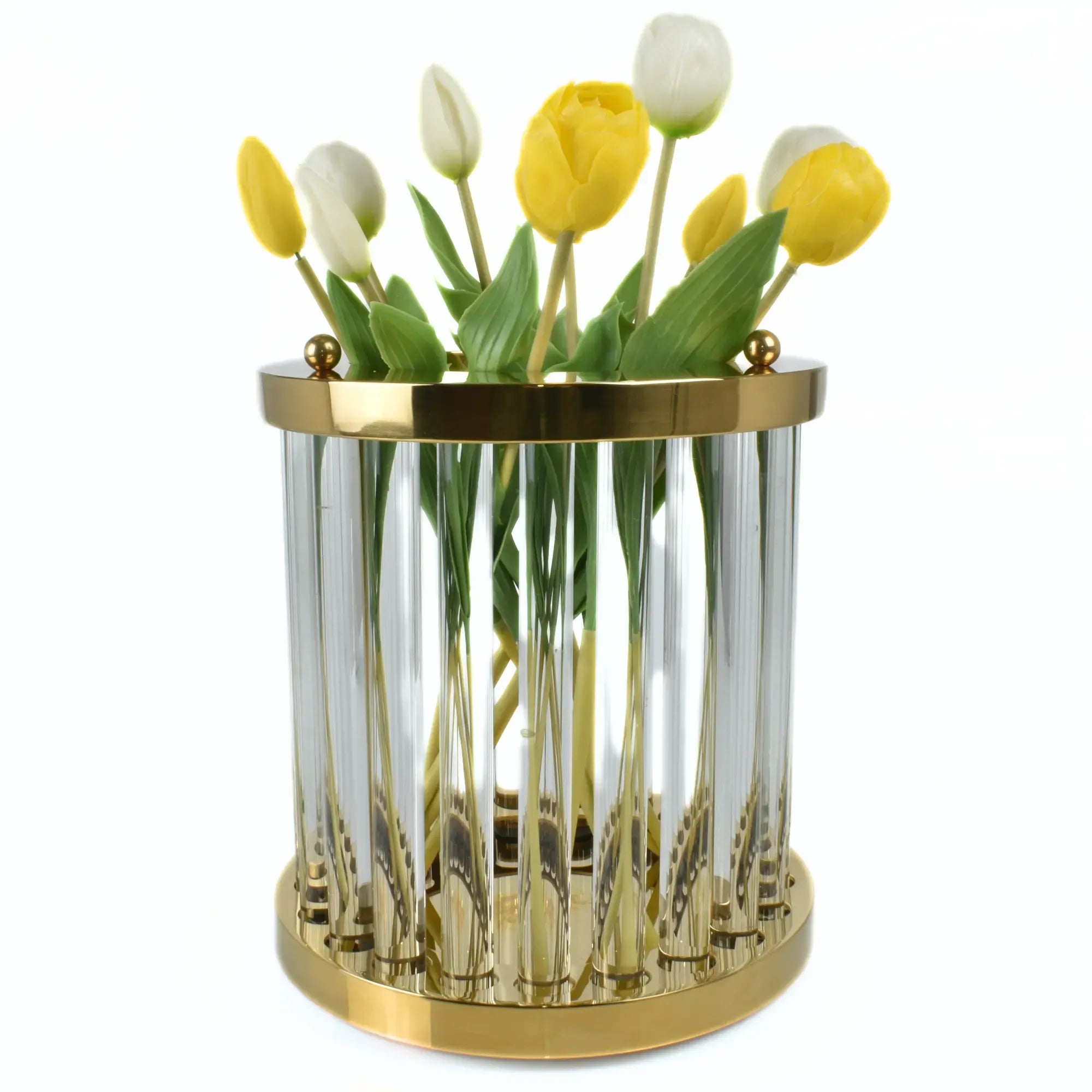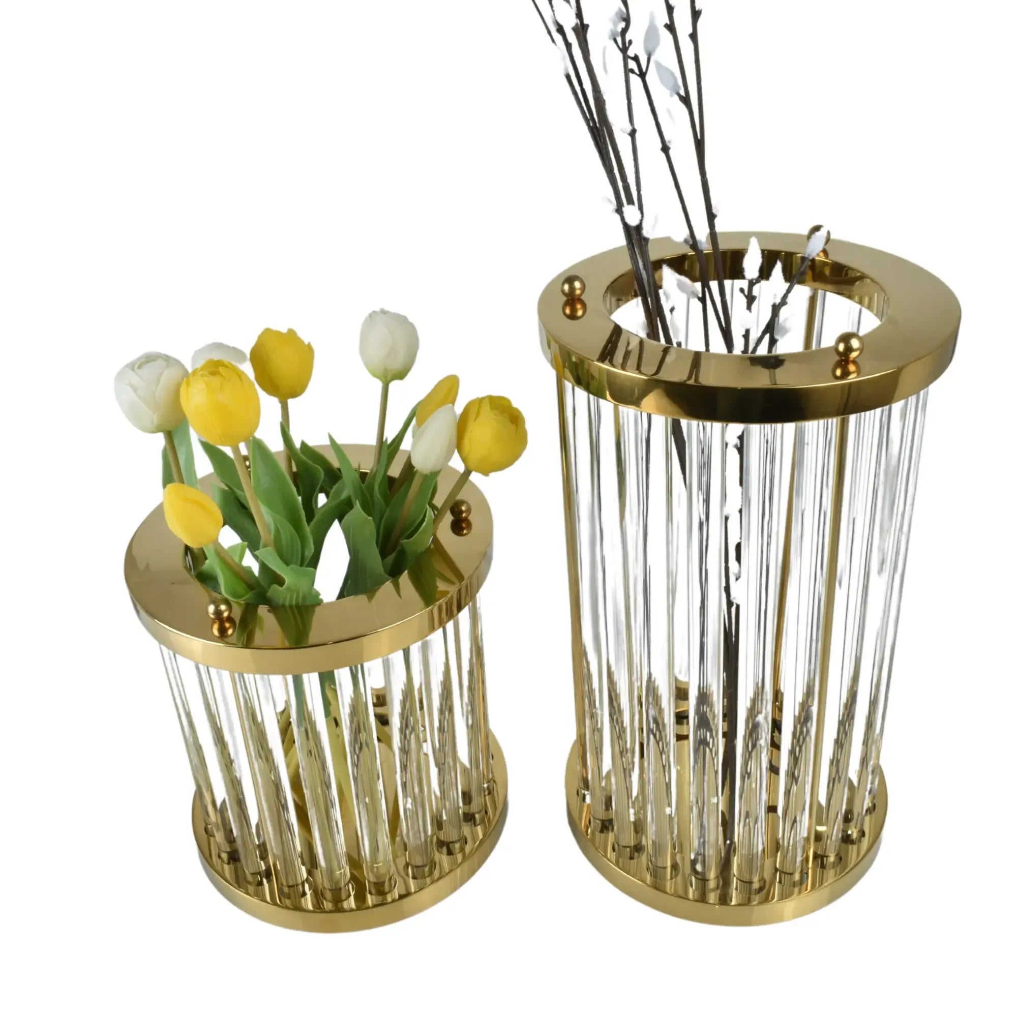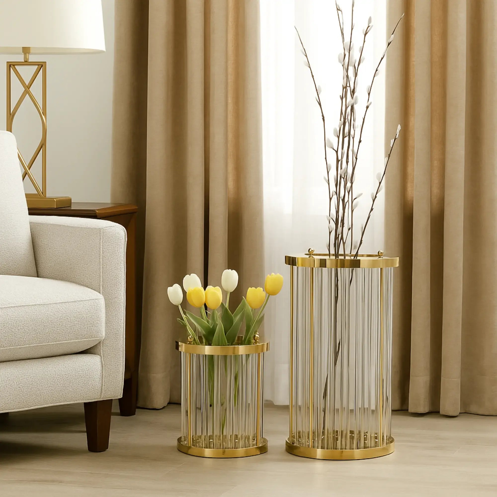 Luxuriöser Kerzenhalter in Zylinderform, auch als dekorative Vase nutzbar. Das italienisch inspirierte Design kombiniert goldfarbenes Metall mit transparenten Glasstäben, die das Kerzenlicht effektvoll reflektieren – ein edles Lichtspiel mit eleganter Tiefe.