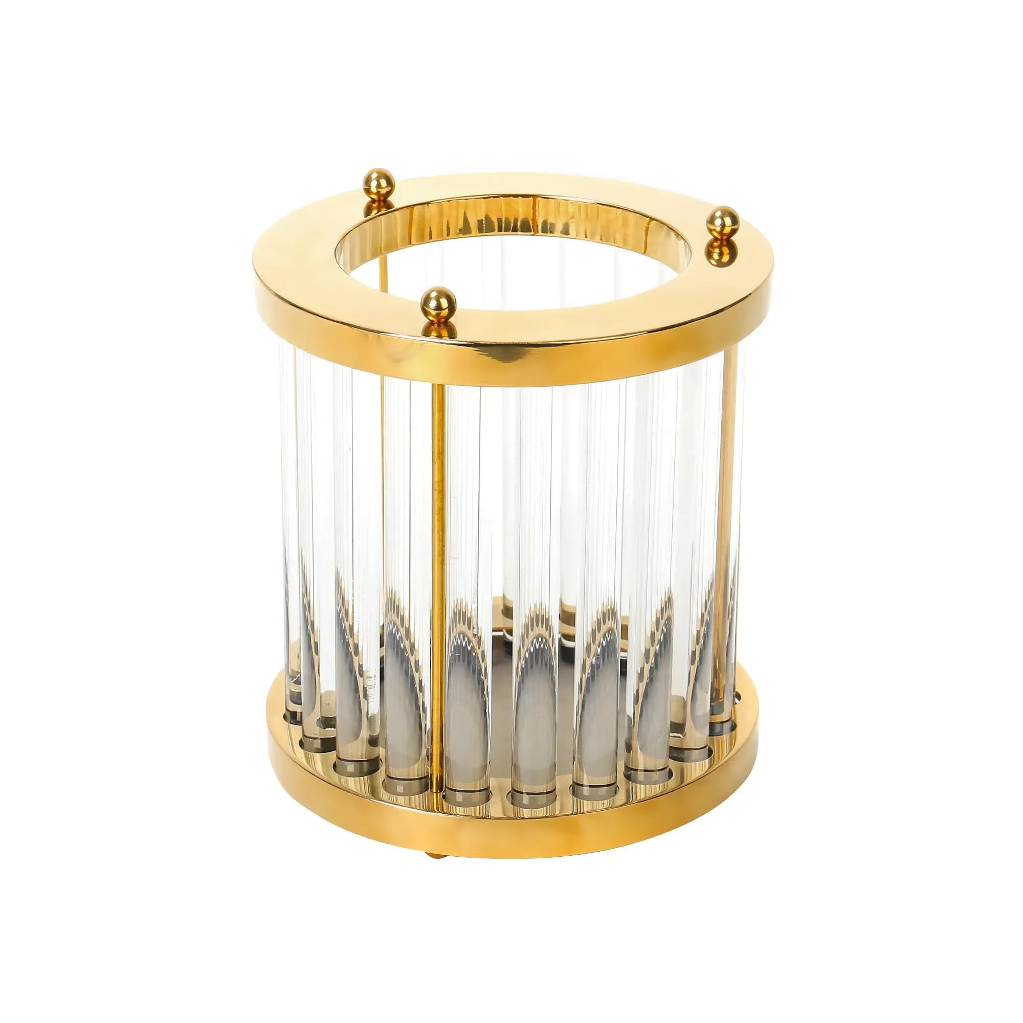 Luxuriöser Kerzenhalter in Zylinderform, auch als dekorative Vase nutzbar. Das italienisch inspirierte Design kombiniert goldfarbenes Metall mit transparenten Glasstäben, die das Kerzenlicht effektvoll reflektieren – ein edles Lichtspiel mit eleganter Tiefe.
