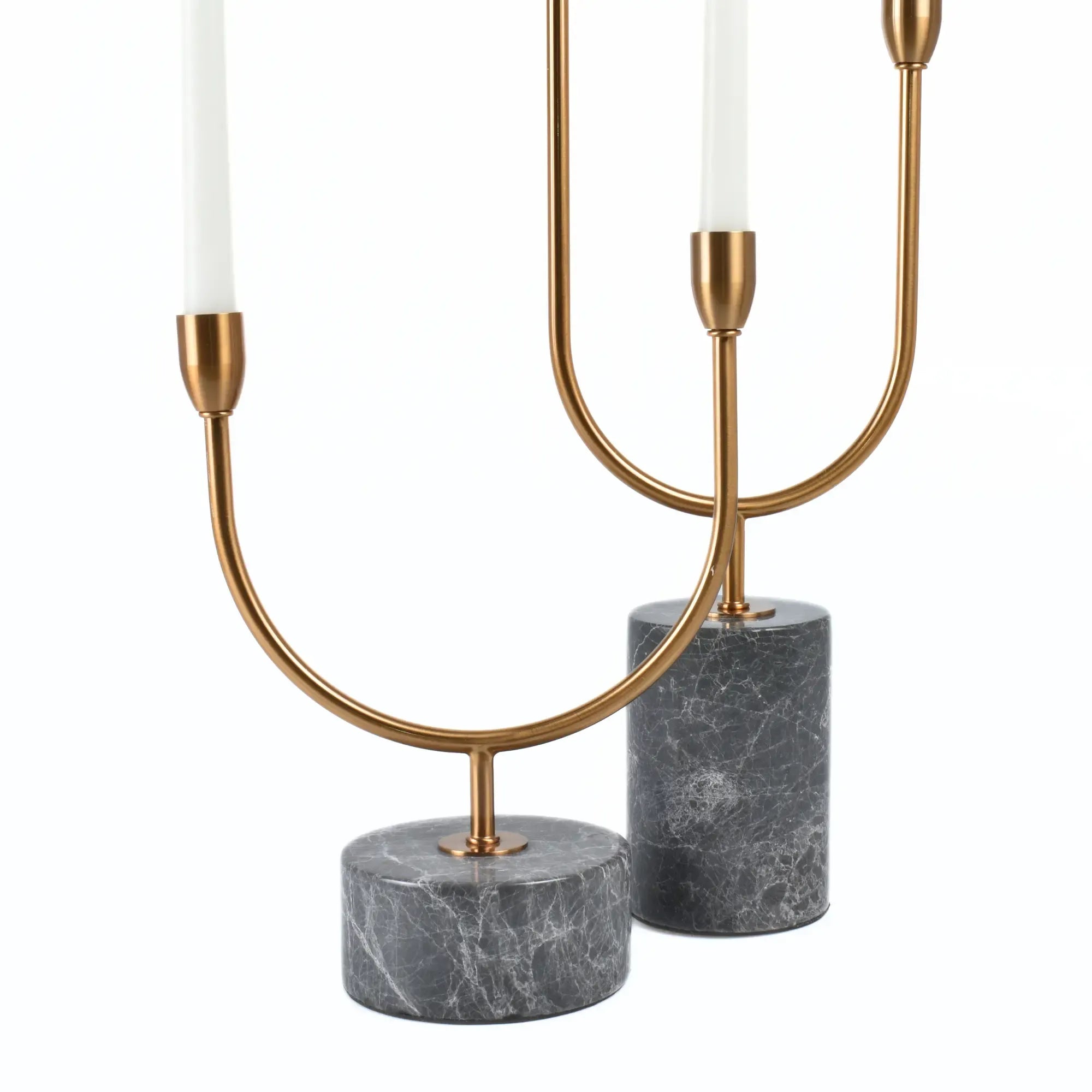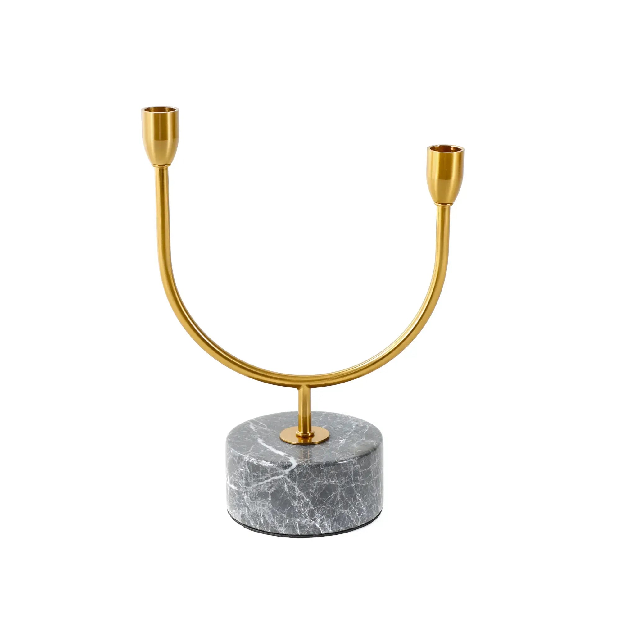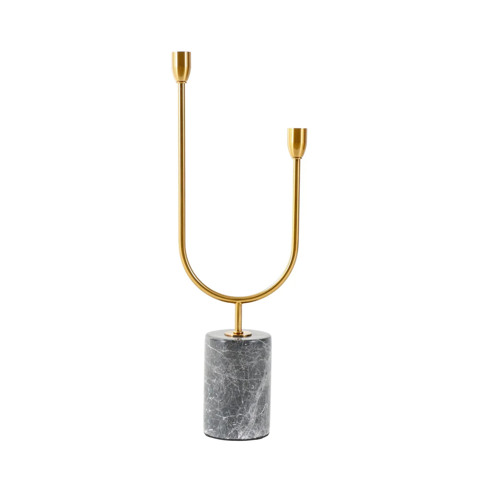 Moderner Kerzenhalter in U-Form für zwei Stabkerzen, gefertigt aus hochwertigem Metall mit antikgoldenem Finish. Der schwere Marmorsockel in Dunkelgrau mit weißer Maserung sorgt für Stabilität und einen edlen Look.