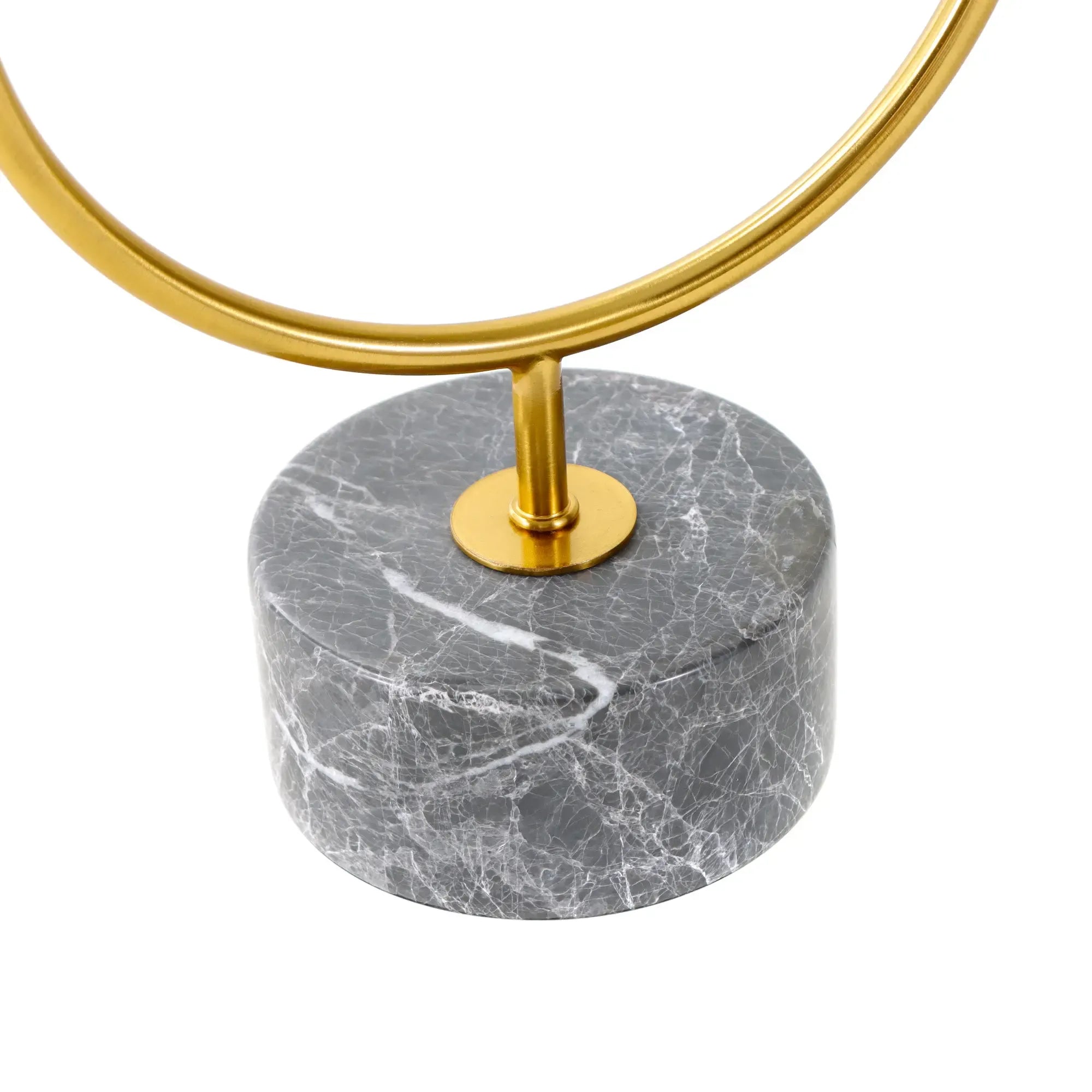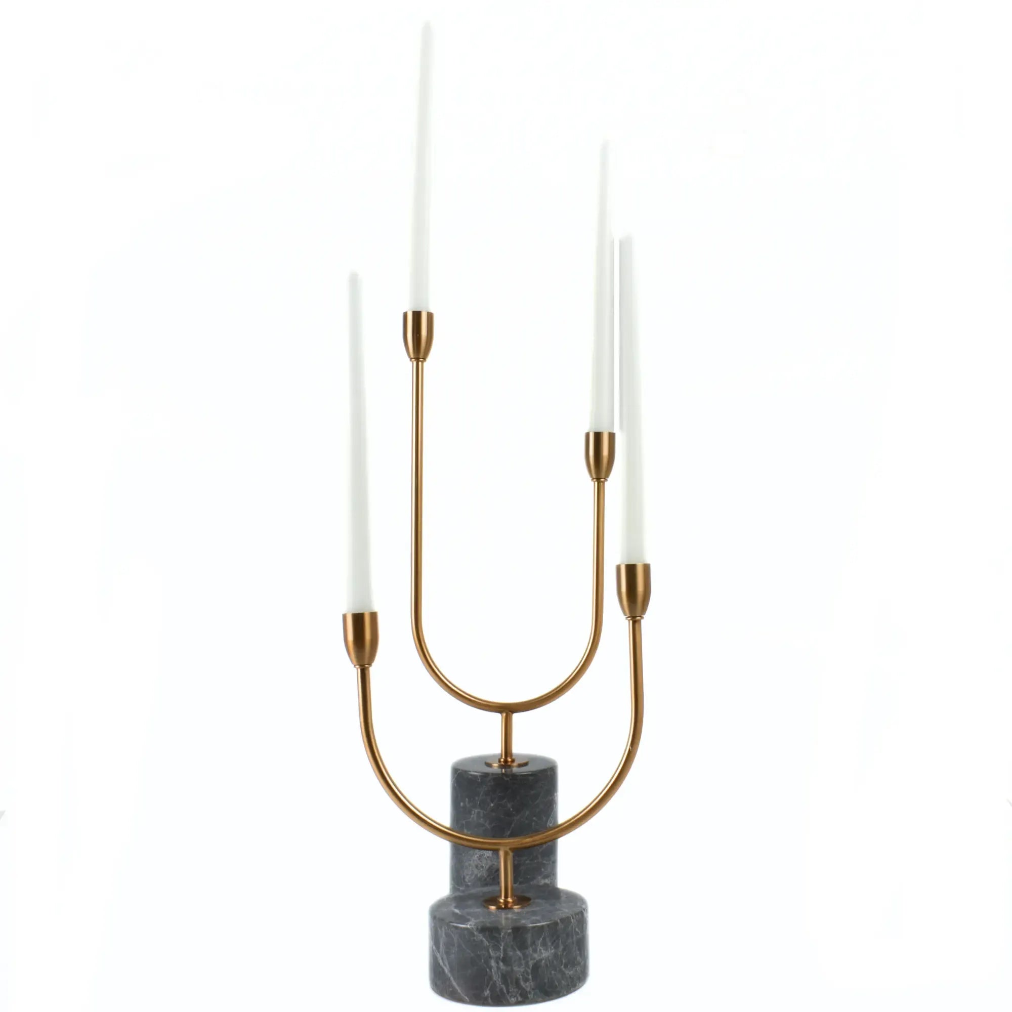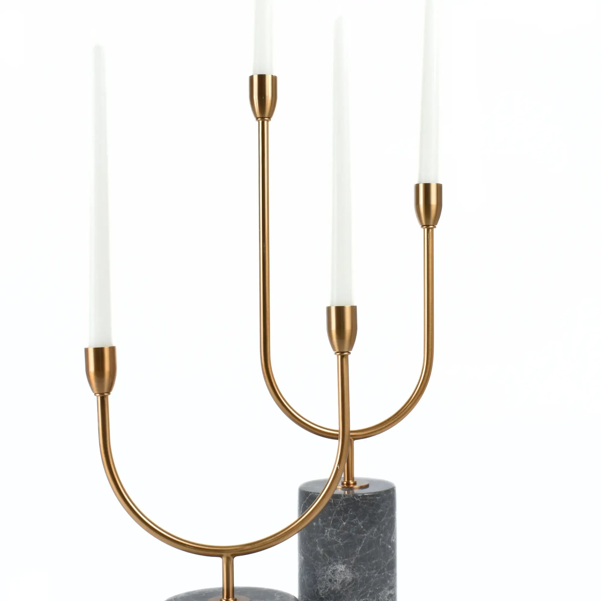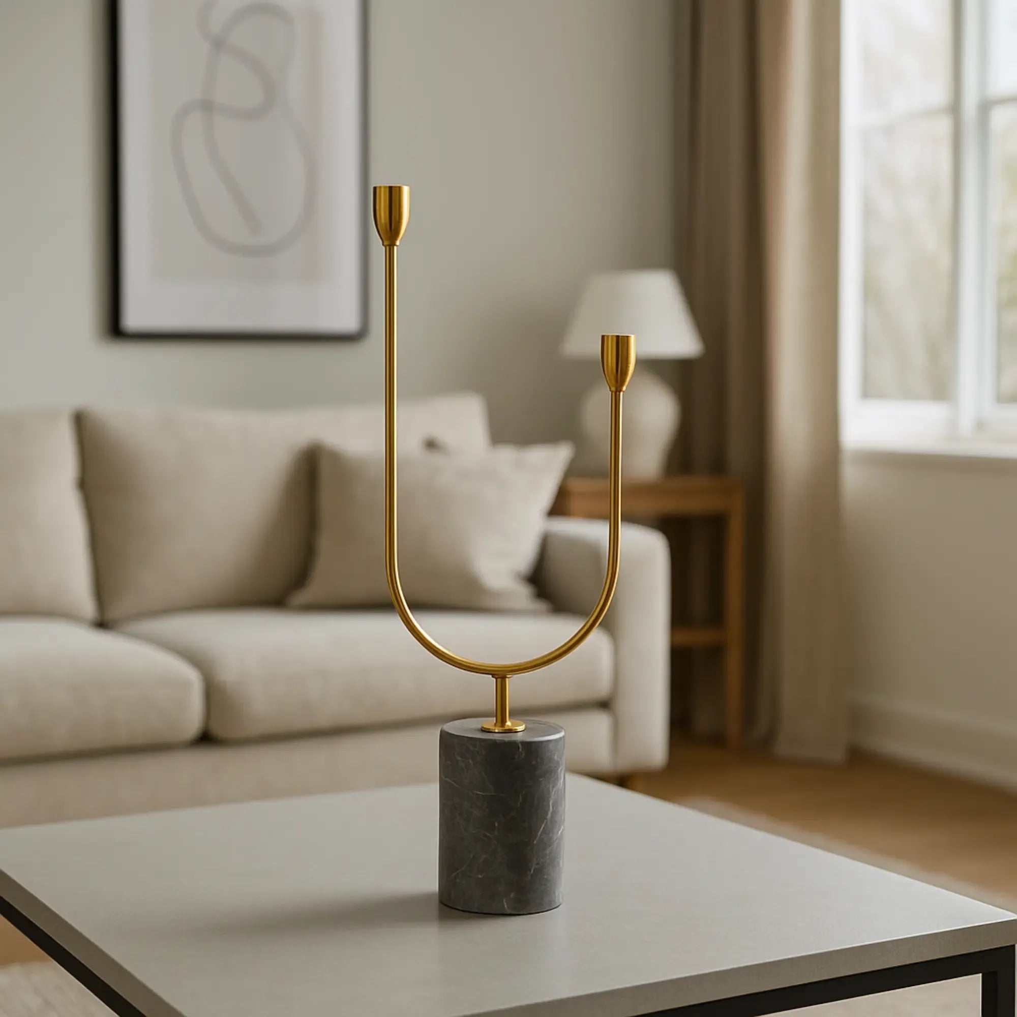 Moderner Kerzenhalter in U-Form für zwei Stabkerzen, gefertigt aus hochwertigem Metall mit antikgoldenem Finish. Der schwere Marmorsockel in Dunkelgrau mit weißer Maserung sorgt für Stabilität und einen edlen Look.
