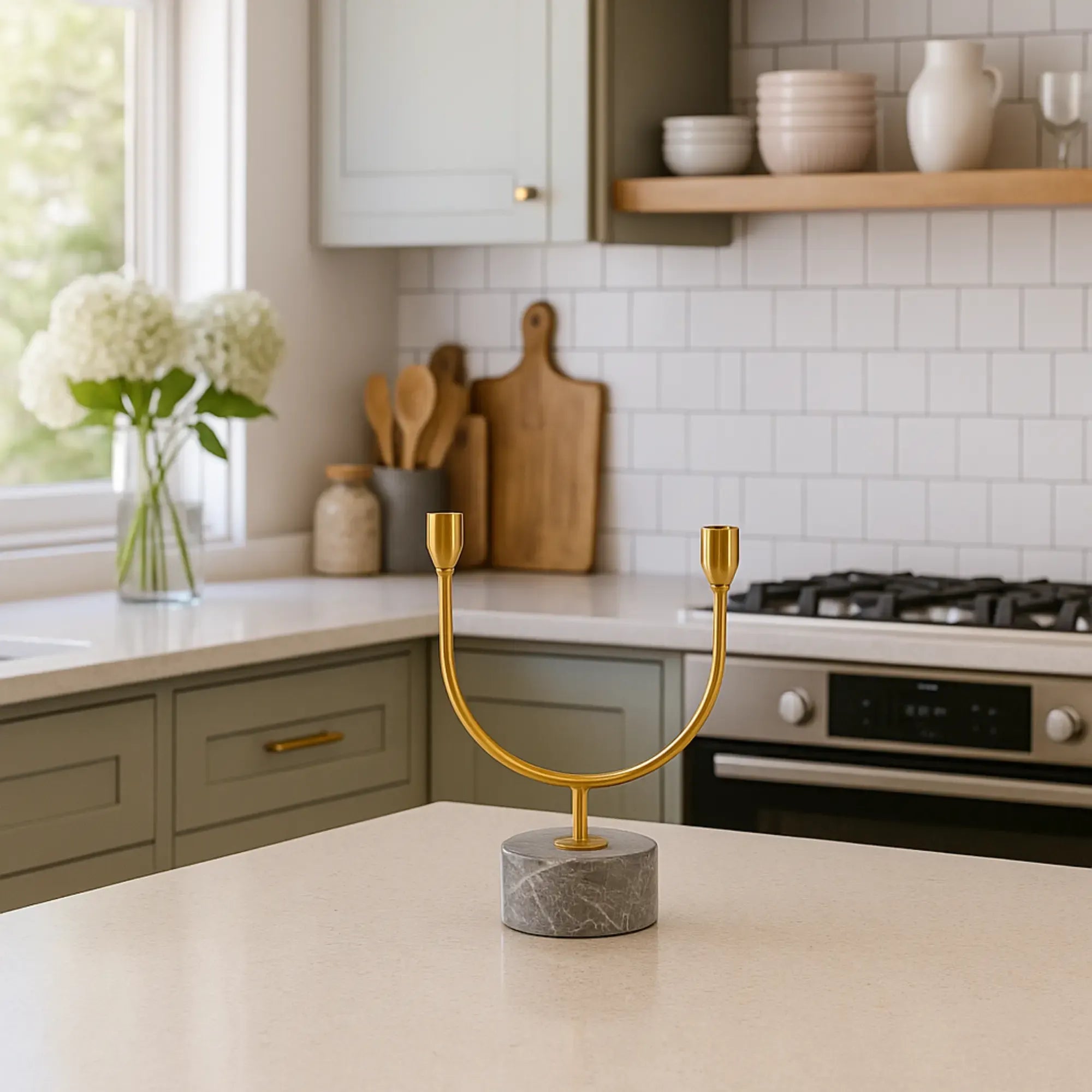 Die Kombination aus Goldoptik und Naturstein verleiht dem Kerzenständer eine luxuriöse, dekorative Ausstrahlung. Ideal für elegante Dekorationsideen in Wohnzimmer, Schlafzimmer oder auf dem Esstisch.