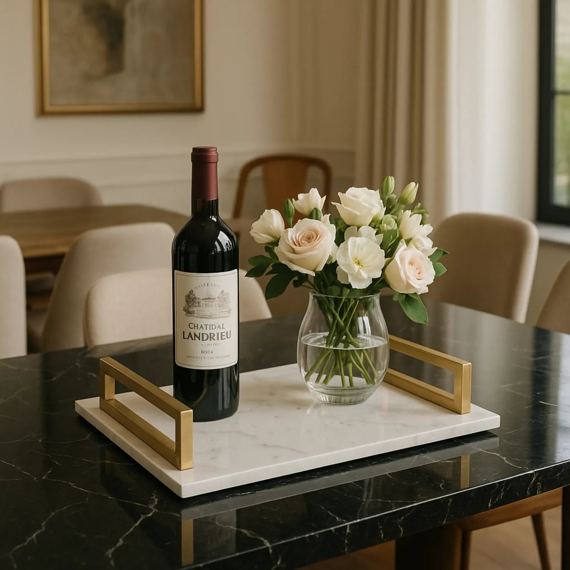 Das Aurora Luxe Serviertablett vereint zeitlose Eleganz mit modernem Minimalismus. Gefertigt aus weißem Marmor mit feiner, natürlicher Maserung und ausgestattet mit goldfarbenen Edelstahlgriffen, beeindruckt es durch seine hochwertige Verarbeitung und luxuriöse Ausstrahlung. Die klare, rechteckige Form und die stabilen, offenen Griffe machen dieses Marmor-Tablett zur perfekten Wahl für das stilvolle Servieren von Getränken, Snacks oder edlem Geschirr – sei es für Gäste, Alltag oder besondere Anlässe. Ob als Serviertablett, Dekotablett auf dem Sideboard oder als stilvolles Accessoire für Küche, Wohnzimmer oder Badezimmer – das Aurora Luxe setzt in jedem Raum ein glänzendes Statement. Es passt ideal zu modernen Dekoideen, klassischen Interieurs oder als edle Ablage für Kerzen, Vasen oder Karaffen-Sets. Ein hochwertiges Geschenk zur Einweihung oder für Freunde mit Vorliebe für Marmor und edle Wohnaccessoires – dieses Tablett fügt sich perfekt in jede Marmor-Einrichtung und ist ein stilvolles Highlight für Designliebhaber:innen.