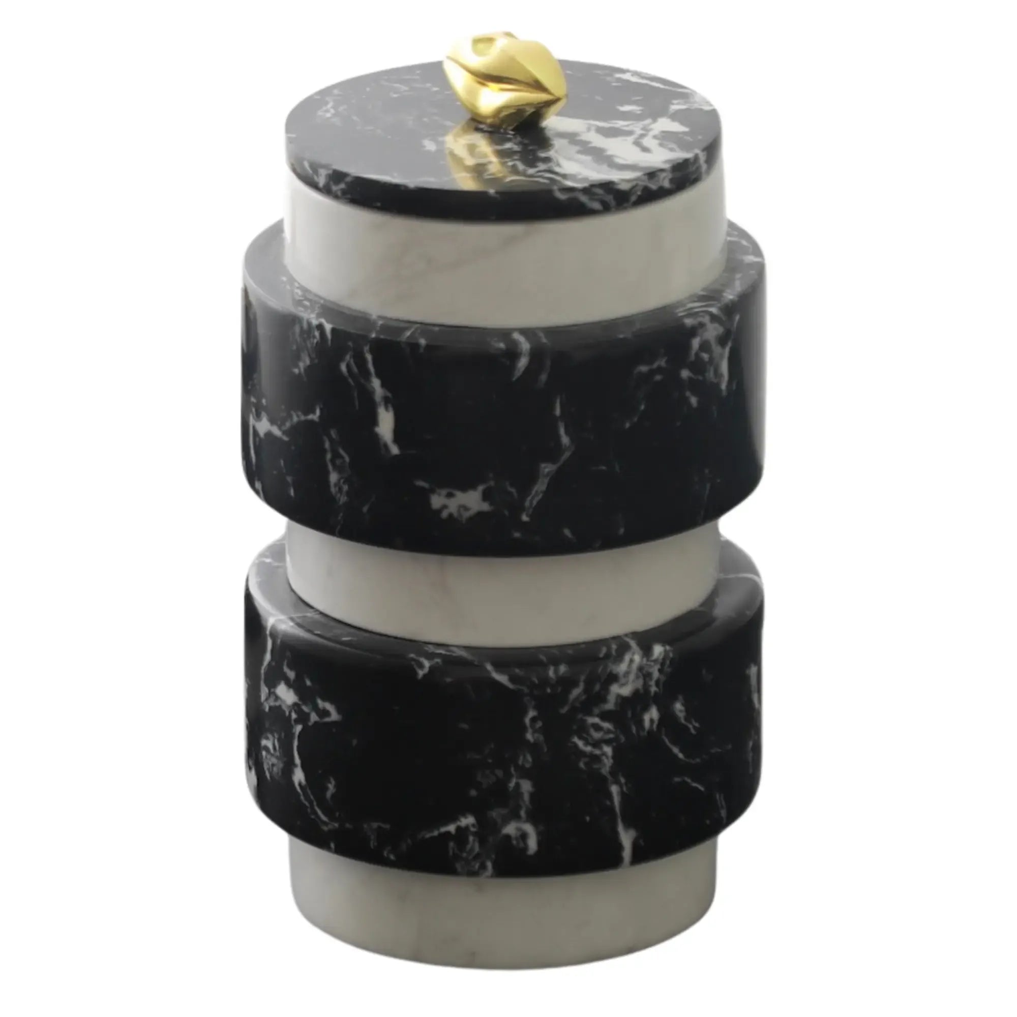 Die zylindrische, stapelbare Gestaltung in Schwarz-Weiß-Kontrast verleiht dem Schmuckkästchen eine moderne, skulpturale Wirkung – minimalistisch und markant zugleich.