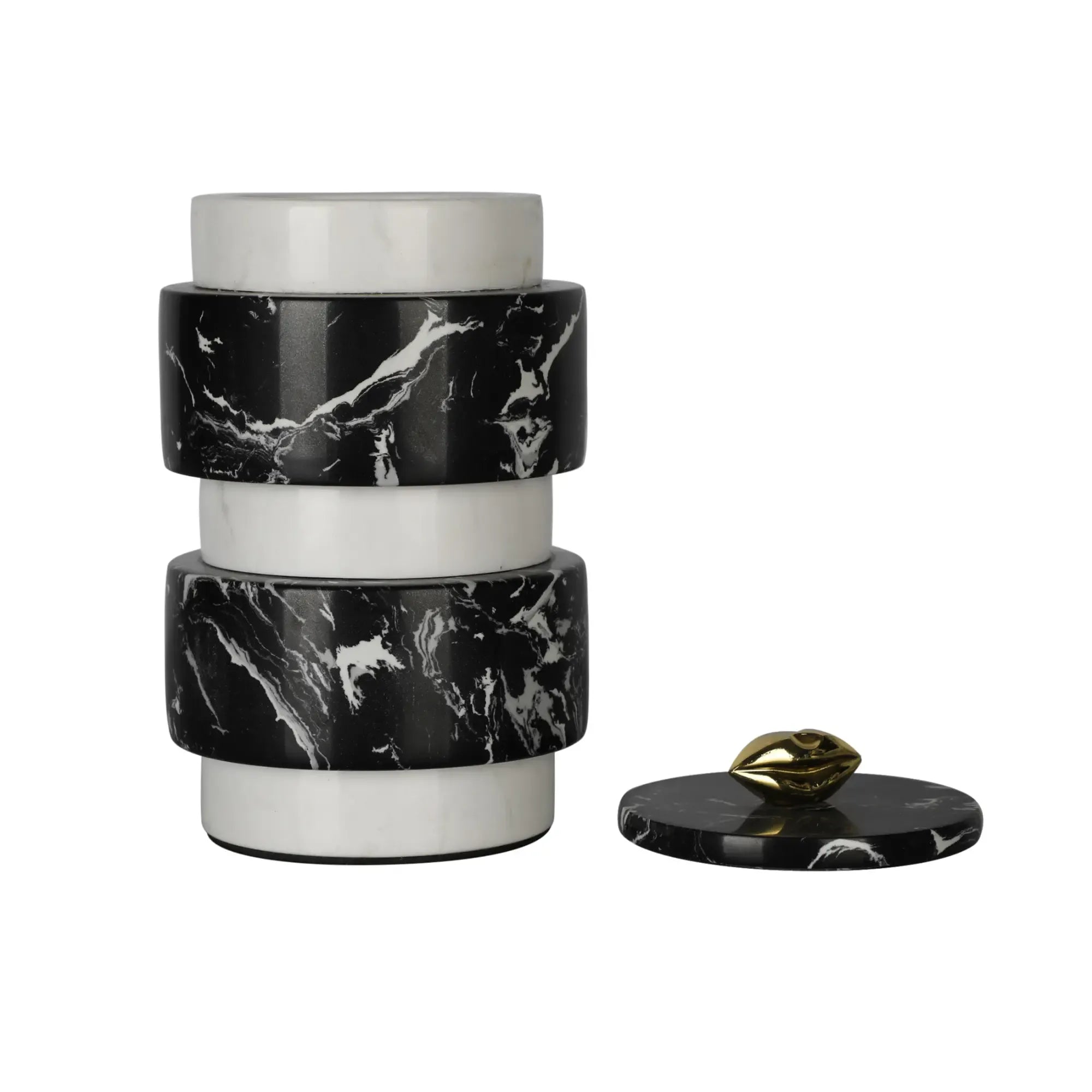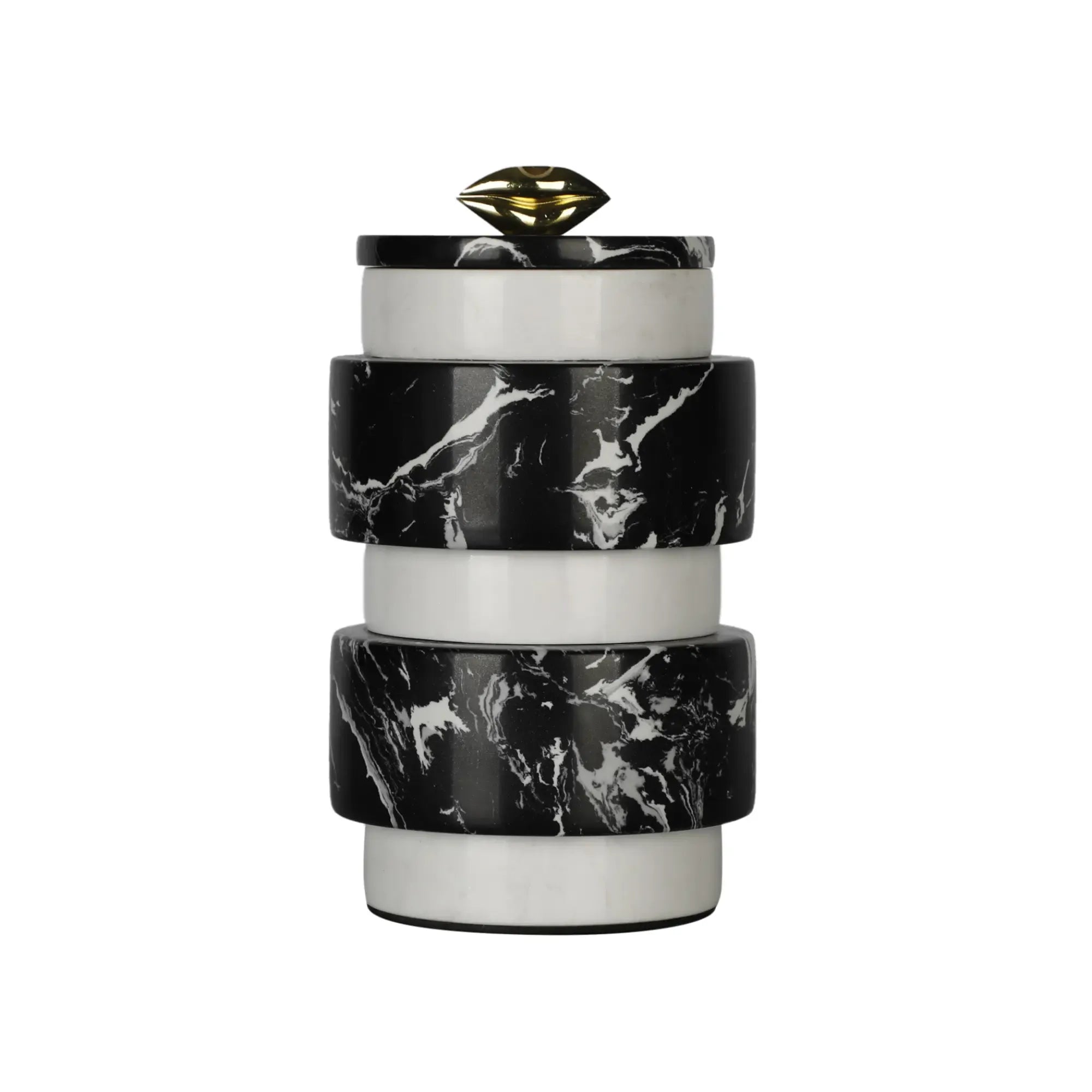 Das Piernas Noir Schmuckkästchen vereint luxuriöse Handwerkskunst mit zeitlosem Design. Die zylindrische Form kombiniert schwarzen und weißen Marmor zu einem ausdrucksstarken Wohnaccessoire mit eleganter Maserung und harmonischem Farbspiel. Der goldfarbene Deckelgriff in Lippenform setzt einen raffinierten Akzent und macht die Dose zu einem echten Designobjekt mit Blickfangcharakter – ob auf dem Nachttisch, im Regal oder auf dem Schminktisch. Als stilvolle Schmuckdose oder moderne Schmuckaufbewahrung eignet sie sich ideal zur Aufbewahrung von Lieblingsstücken – von Ringen über Ohrringe bis hin zu kleinen Erinnerungen. Sie bringt Luxus in jedes Bad, Schlafzimmer oder Wohnzimmer und fügt sich perfekt in moderne wie klassische Interieurs ein. Ein besonderes, hochwertiges Geschenk für Mütter, Omas oder stilbewusste Frauen, das mit Eleganz und Charakter überzeugt – und dabei nützlich wie dekorativ zugleich ist.