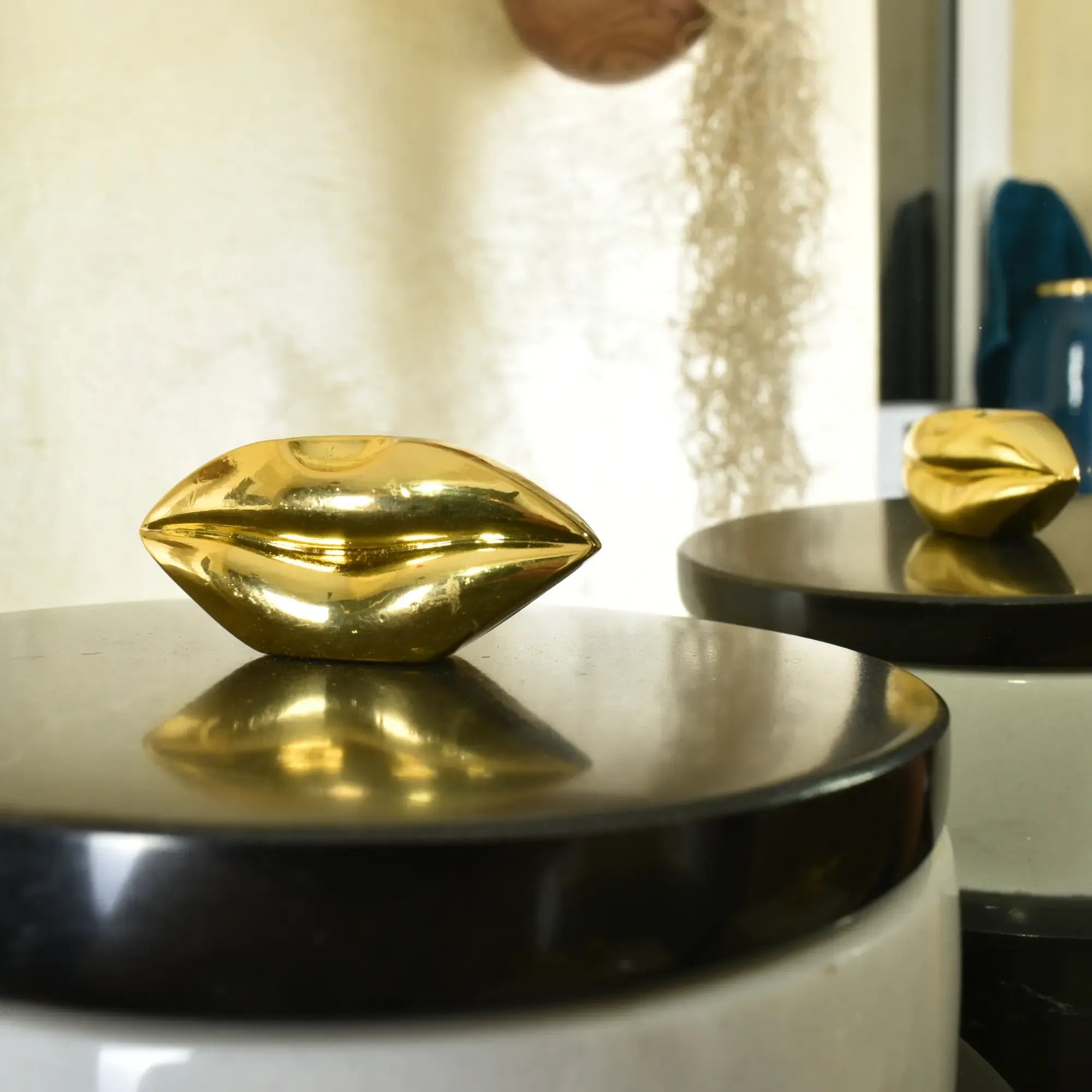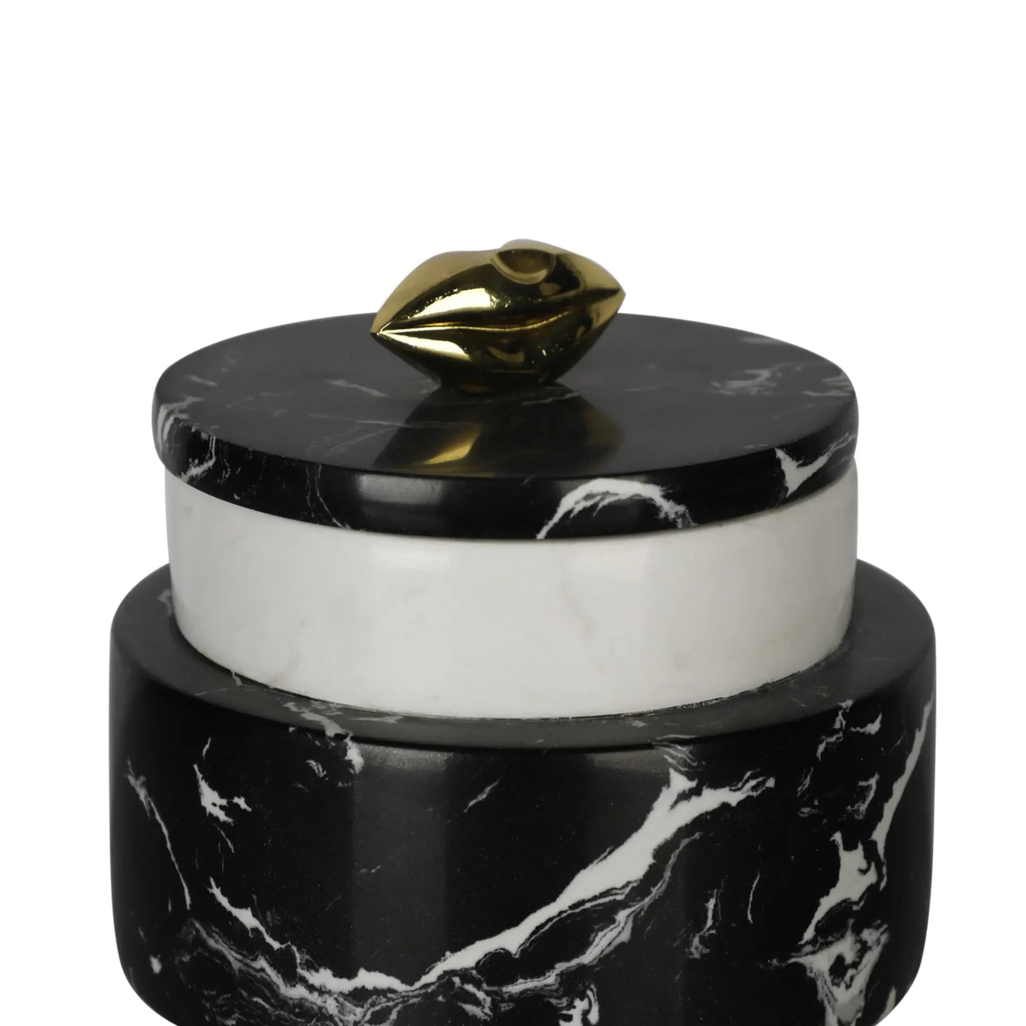 Gefertigt aus hochwertigem schwarzem und weißem Marmor mit individueller Maserung – jedes Stück ein Unikat. Der goldfarbene Deckelgriff in Form von Damenlippen setzt ein kunstvolles, dekoratives Highlight mit femininer Eleganz.