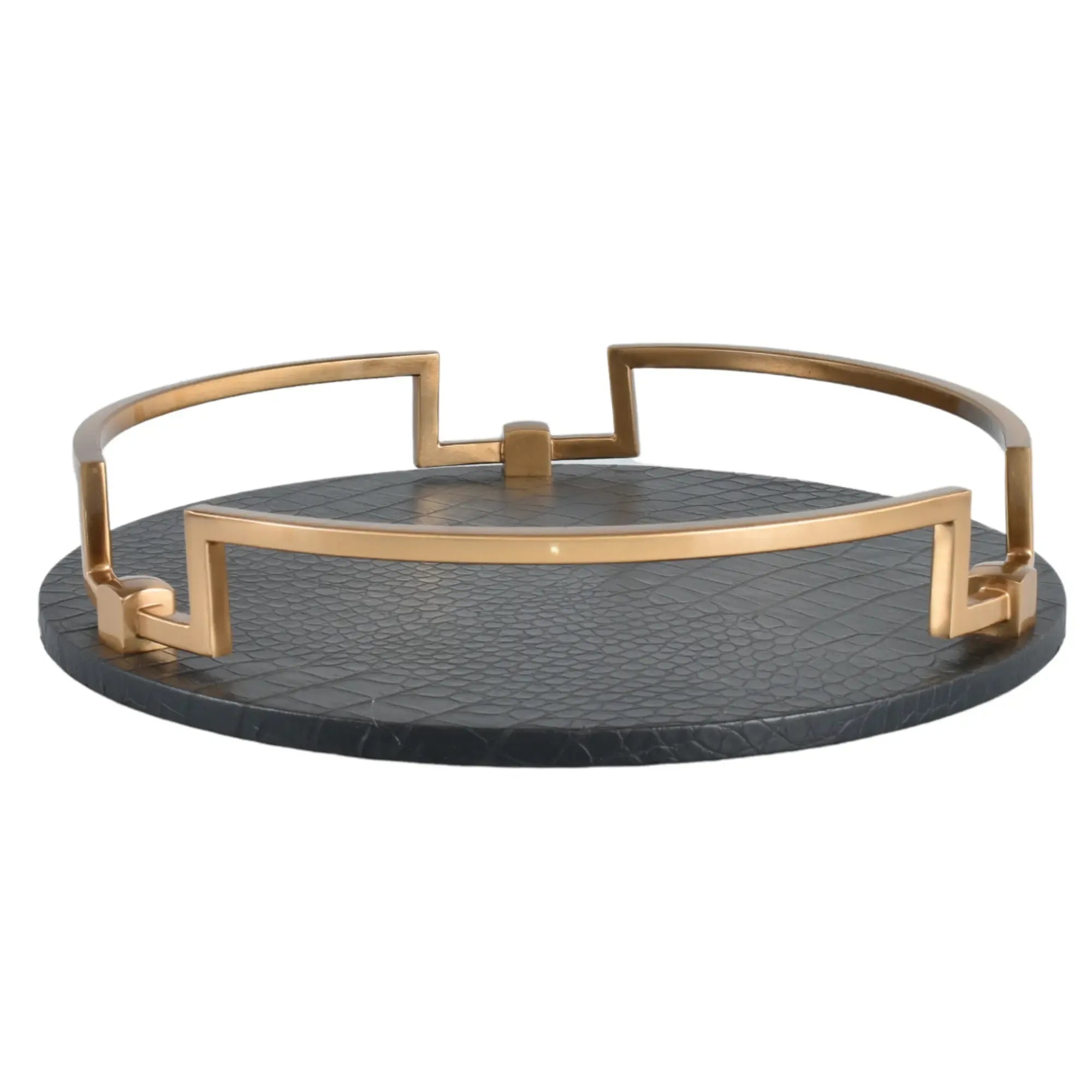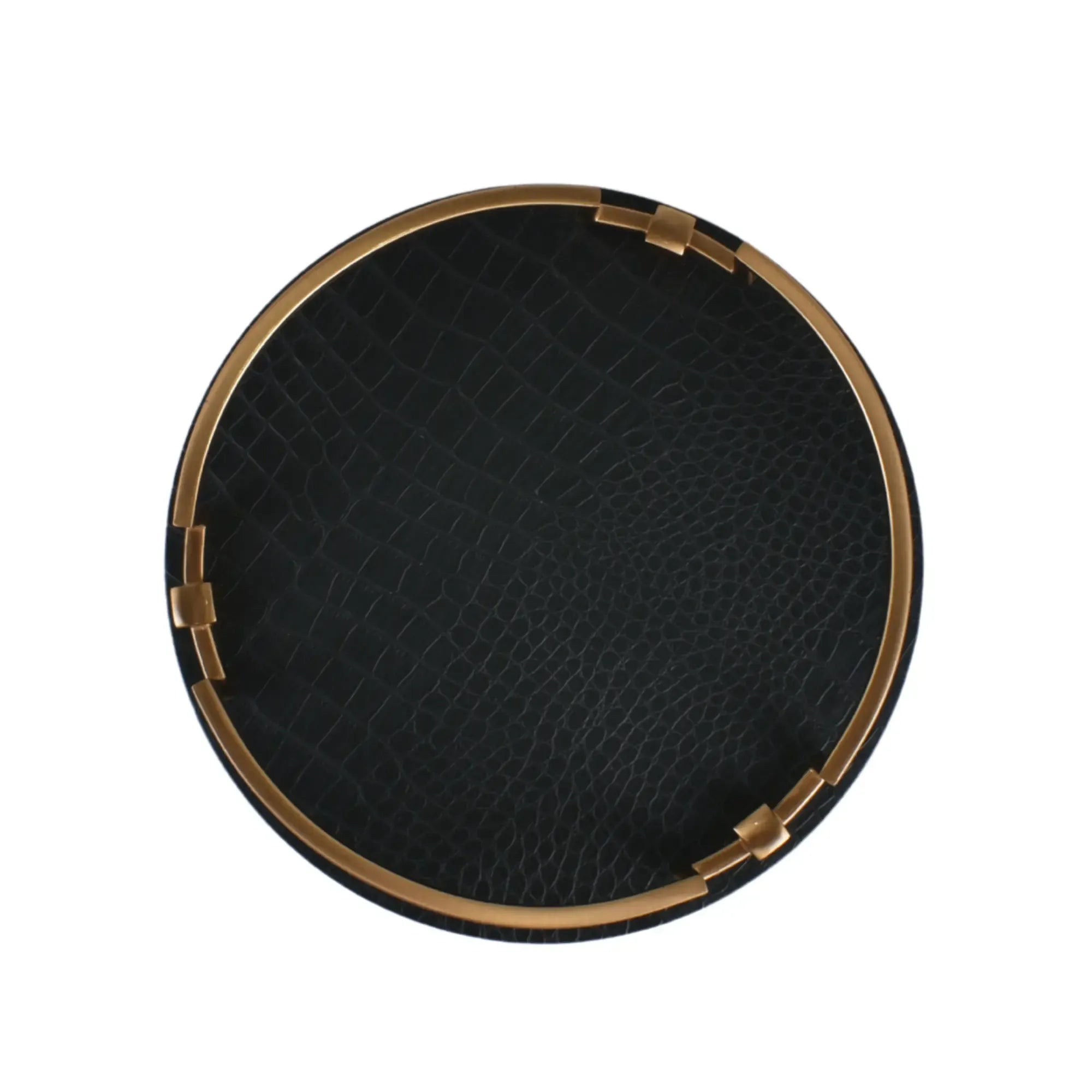 Serviertablett - mit Griff Lederoptik - Dekoratives Tablett rundes Tablett Eclipse Noir Kunstleder & Stahl, Antikgold & Schwarz, gross, im Stil: Elegant, Modern