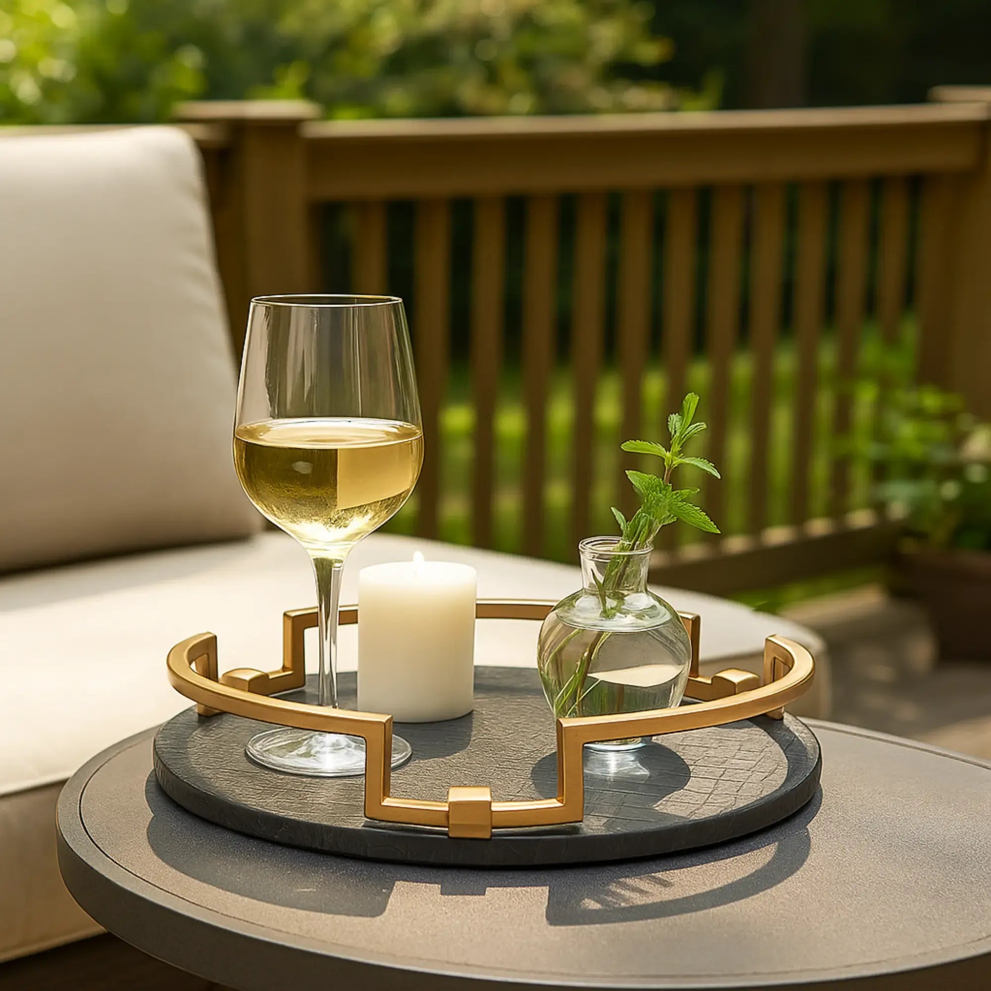 Das Eclipse Noir ist ein rundes Design-Tablett, das modernes Wohngefühl mit funktionaler Eleganz verbindet. Die strukturierte Oberfläche in edler Kunstleder-Optik setzt einen stilvollen Akzent, während der geometrisch geformte, goldfarbene Metallrahmen für einen markanten Kontrast sorgt. Ob als stilvolle Basis für Kaffee, Kerzen, Vasen oder zur Aufbewahrung von Accessoires – dieses Dekotablett bringt Ordnung und Eleganz auf jeden Tisch. Es eignet sich hervorragend als Organizer, Servierhilfe oder dekoratives Highlight für Sideboards, Couchtische und Konsolen. Dank seines luxuriösen Schwarz-Gold-Finishs fügt sich das Eclipse Noir harmonisch in moderne, klassische oder industrielle Interieurs ein. Auch in Restaurants, Cafés, Arztpraxen, Empfangsbereichen oder Hotels setzt es stilvolle Akzente mit Charakter. Ein elegantes Geschenk zur Einweihung oder für Familie und Freunde – für alle, die Design, Qualität und Vielseitigkeit schätzen.