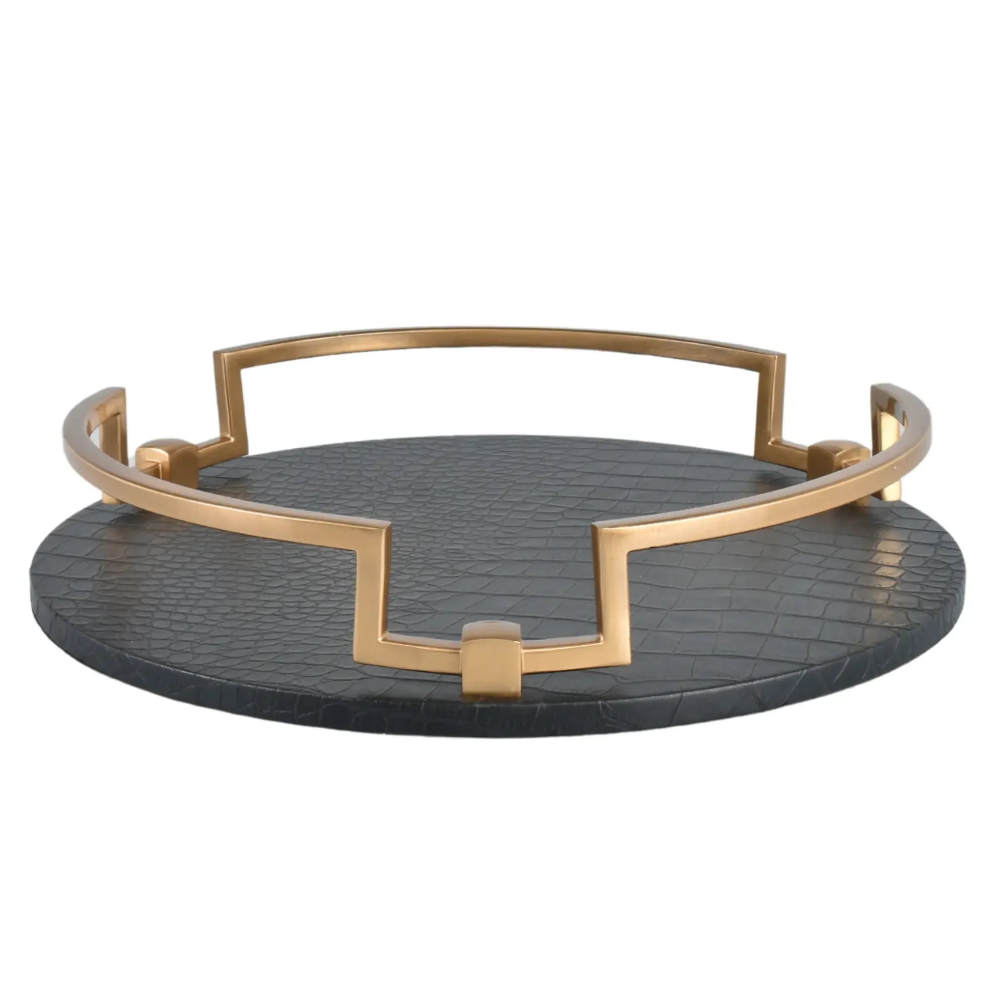 Das runde Tablett mit klaren Linien und geometrisch geformten Griffen überzeugt durch seine moderne, luxuriöse Ausstrahlung – ein stilvolles Highlight in jedem Raum.