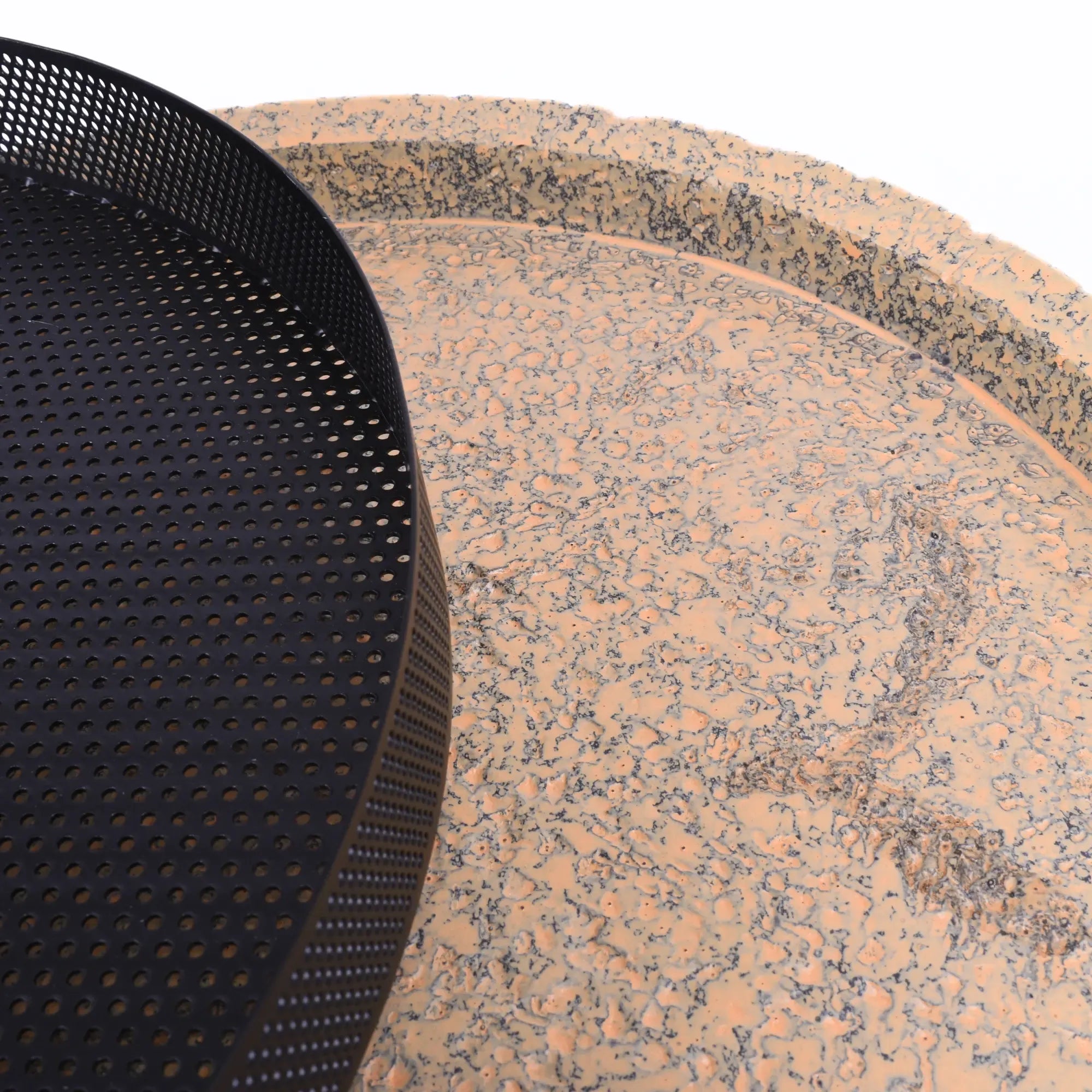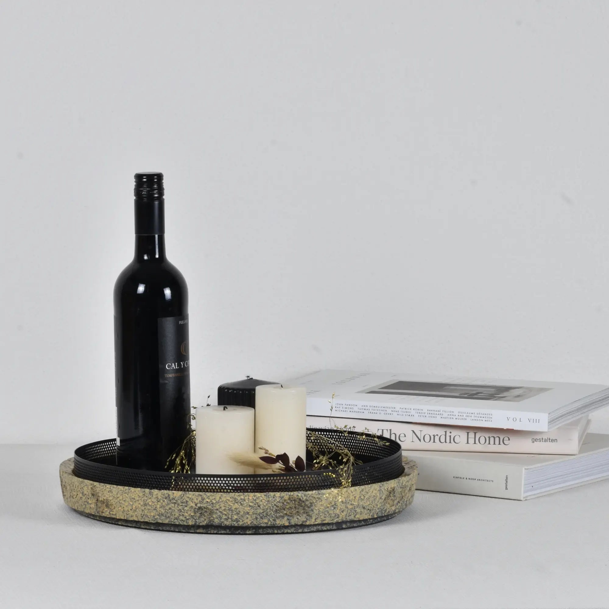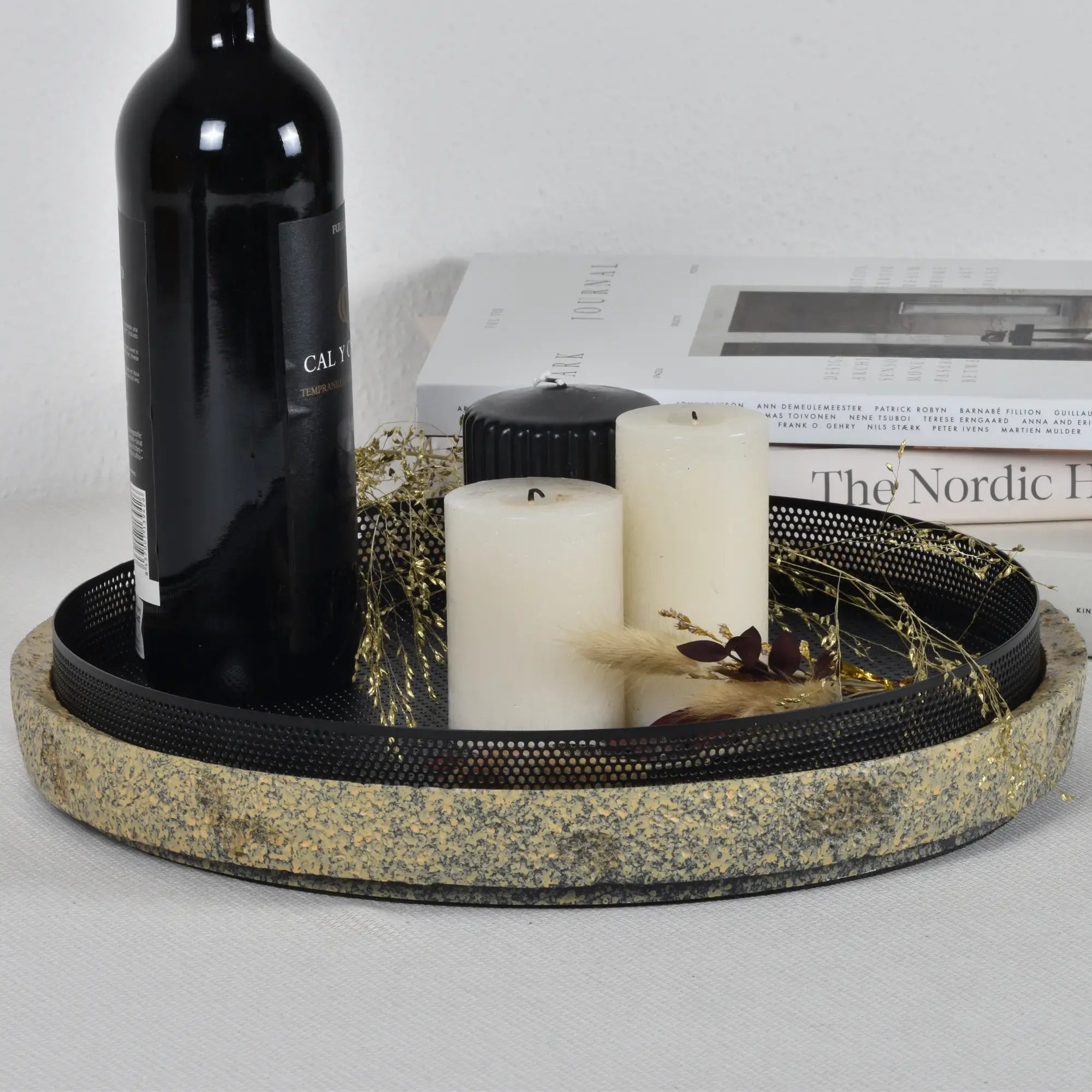 Das Terra Mesh Serviertablett vereint modernes Design mit funktionaler Vielseitigkeit. Der äußere Rand aus robustem Harz in steinähnlicher Marmoroptik erinnert an rohen Granit und verleiht dem Tablett eine architektonische Ausstrahlung mit natürlicher Textur. Das innere Tablett aus perforiertem, schwarzem Aluminium sorgt für Leichtigkeit und Stabilität beim Servieren. Es ist herausnehmbar und kann auch separat verwendet werden – ideal als flexibles Dekoelement oder Ablage für Gläser, Snacks oder kleine Alltagsgegenstände. Ob als Serviertablett, für Dekorationsaufbewahrung oder als strukturierter Untergrund für Kerzen, Vasen oder Barzubehör – das Terra Mesh ist ein vielseitiges Designobjekt für moderne Wohnräume, Küchen, Lofts oder Büros. Ein besonderes Wohnaccessoire mit Designanspruch – und ein stilvolles Geschenk zur Einweihung oder für Hausbarbesitzer:innen, das mit Materialmix, Funktion und Ästhetik überzeugt.