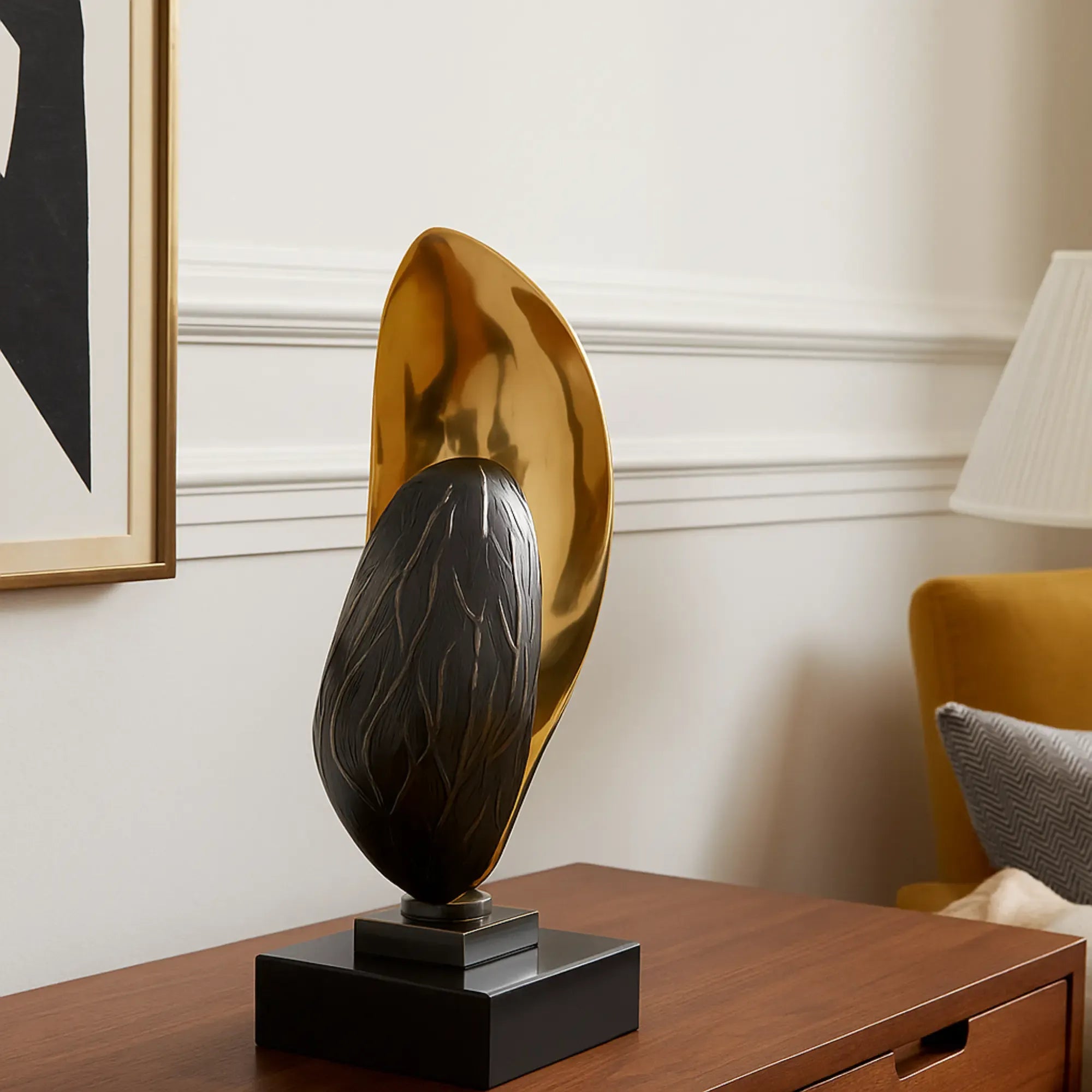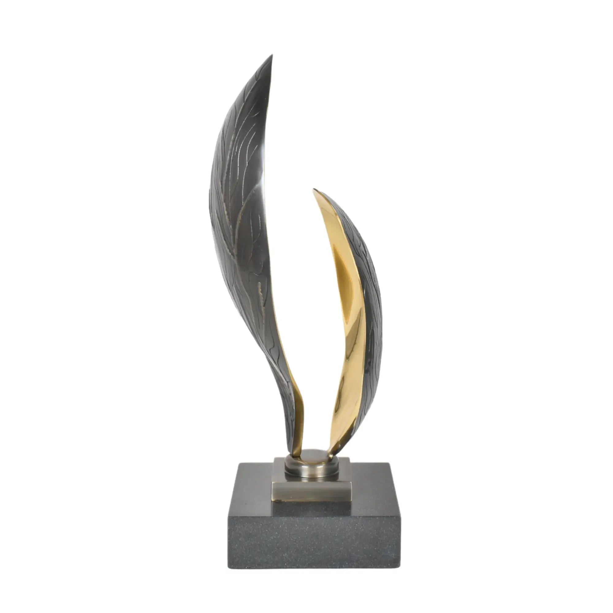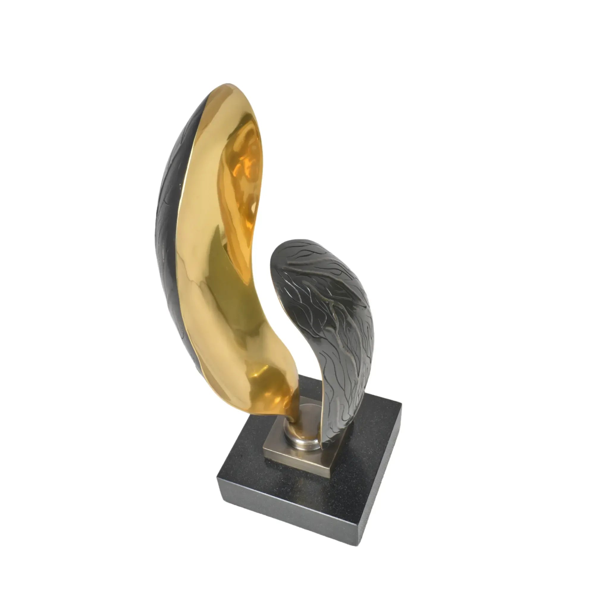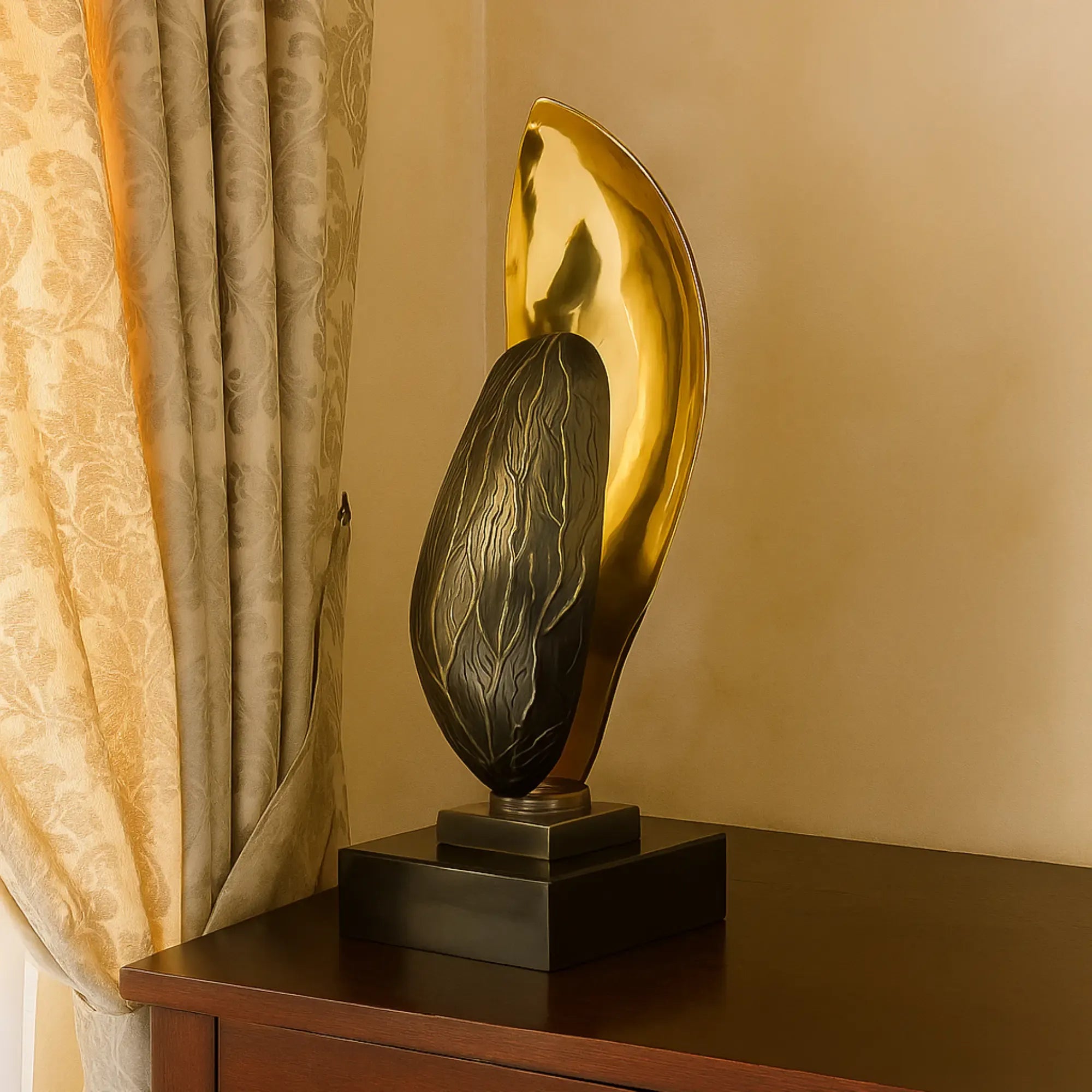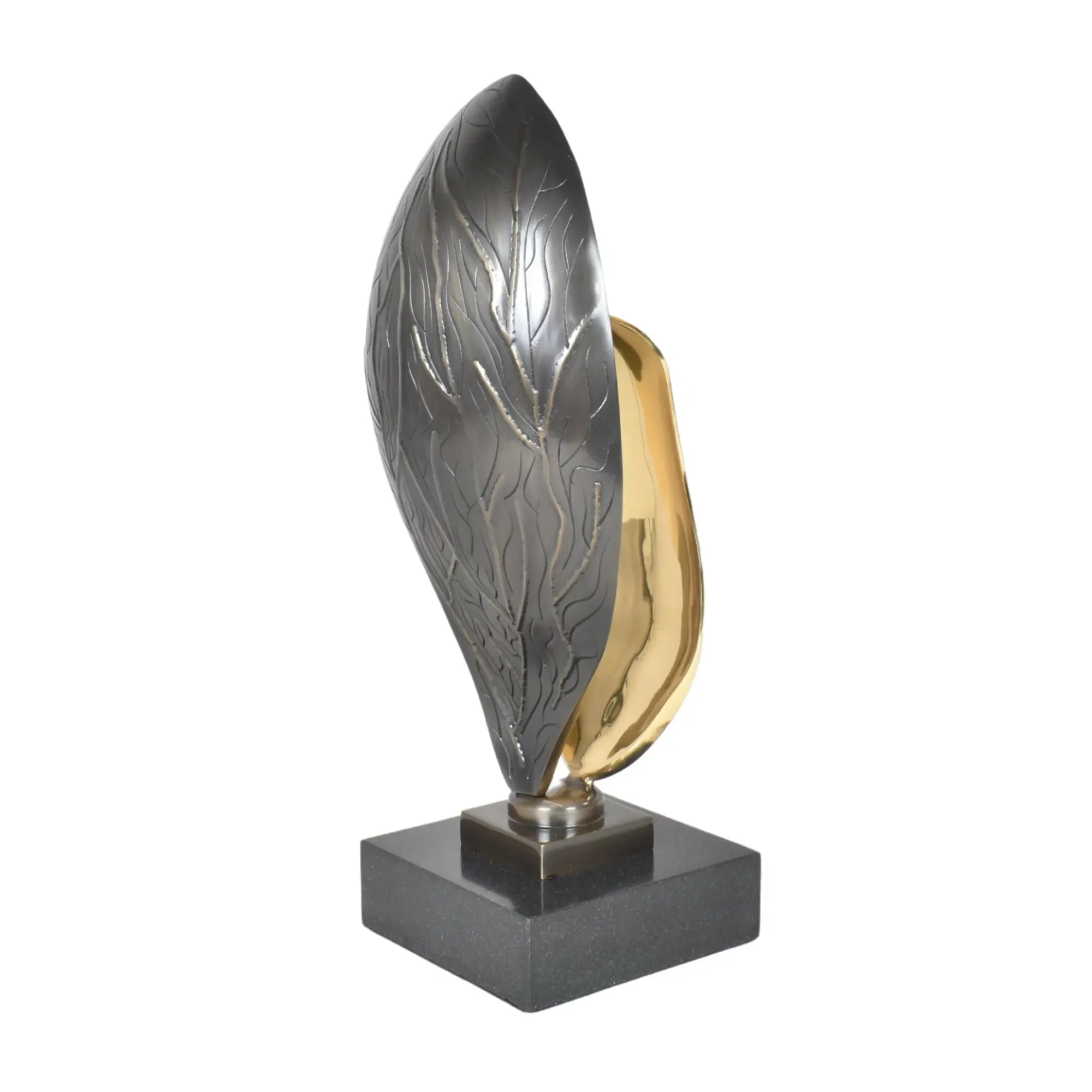 Gestell: Aus hochwertigem schwarzem Marmor, der Stabilität und Eleganz verbindet.Figur: Gefertigt aus Bronze mit einer luxuriösen, goldfarbenen Innenseite, die für edlen Glanz und stilvollen Kontrast sorgt. Das Objekt zeigt zwei stilisierte Blätter in geschwungener Form – schlicht, aber kunstvoll.