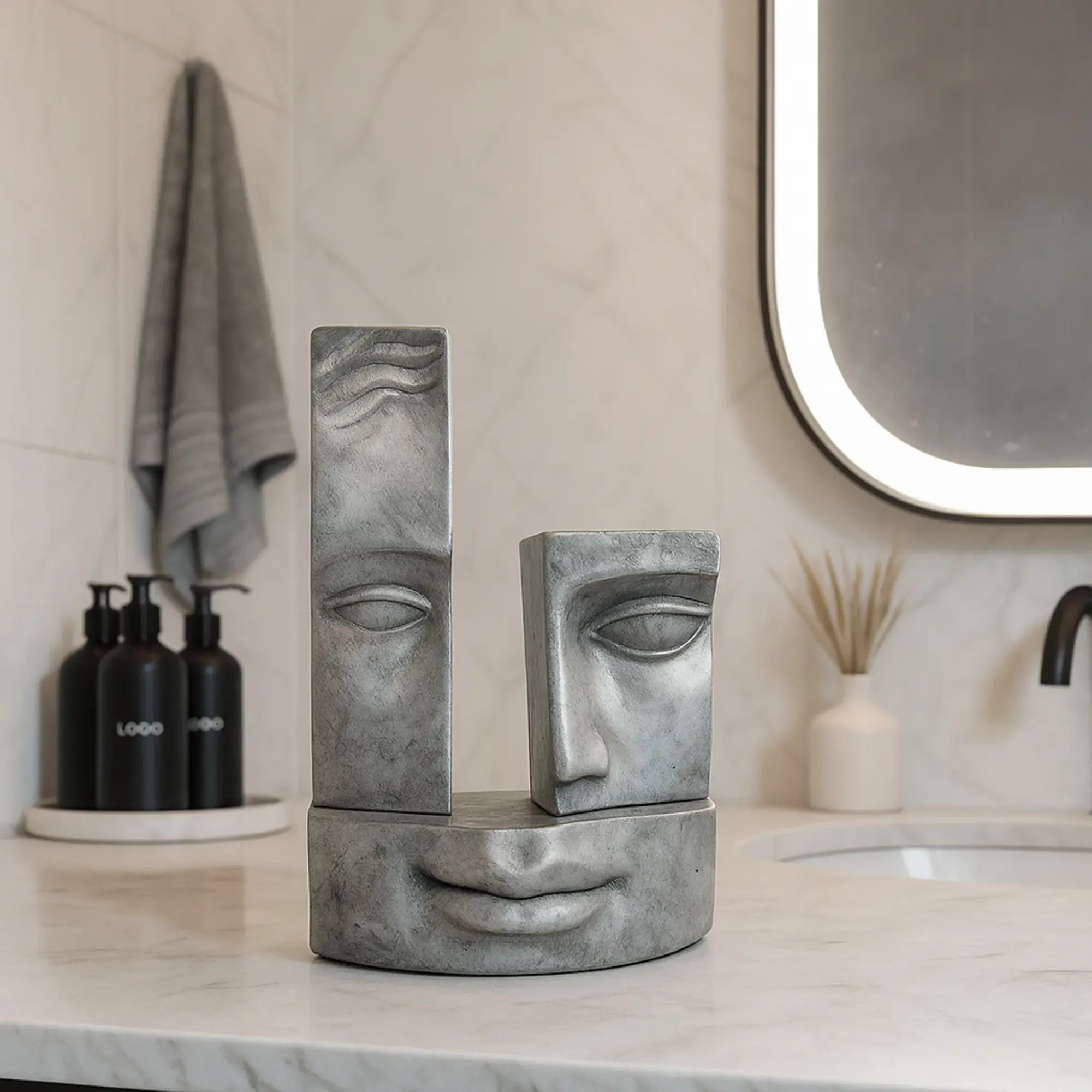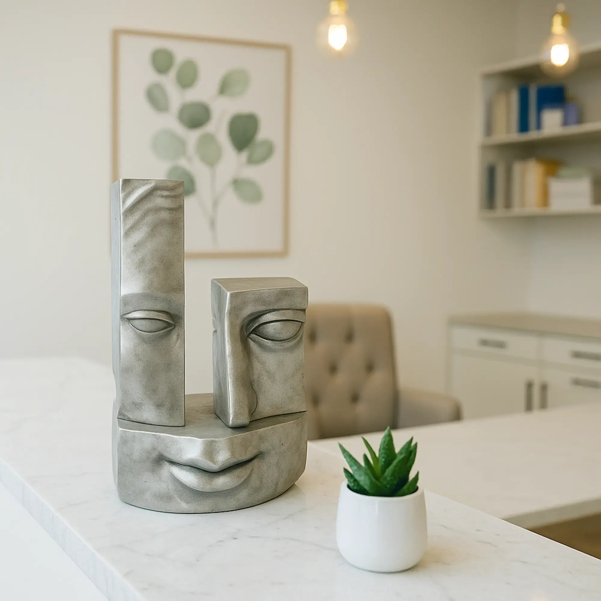 Die Dekoration „Steingesicht Stonehenge“ beeindruckt mit einer dreiteiligen Gesichtsskulptur im Antiksilber-Finish, deren fragmentierte Form Fantasie und Interpretation anregt. Das abstrakte Gesicht aus Kunststein verbindet künstlerischen Ausdruck mit architektonischer Klarheit und verleiht jedem Raum eine starke visuelle Präsenz. Gefertigt aus hochwertigem, festem Kunststoff mit strukturierter Oberfläche, wirkt die Skulptur wie gegossener Stein – markant, modern und doch leicht. Die Designskulptur in Silber eignet sich perfekt als stilvoller Blickfang für Behandlungsräume, Beautystudios, Empfangsbereiche, Arztpraxen, Homeoffices oder Bibliotheken. Als künstlerische Figur mit menschlichem Ausdruck bringt „Steingesicht Stonehenge“ emotionale Tiefe und kreative Energie in jede Umgebung. Ob auf Kommoden, Regalen oder Sideboards – dieses Objekt schafft Atmosphäre mit Bedeutung. Ein ausgefallenes Geschenk zur Einweihung im Loft-Stil, für Freunde, kreative Köpfe oder stilvolle Geschäftsräume – modern, charakterstark und absolut einzigartig.