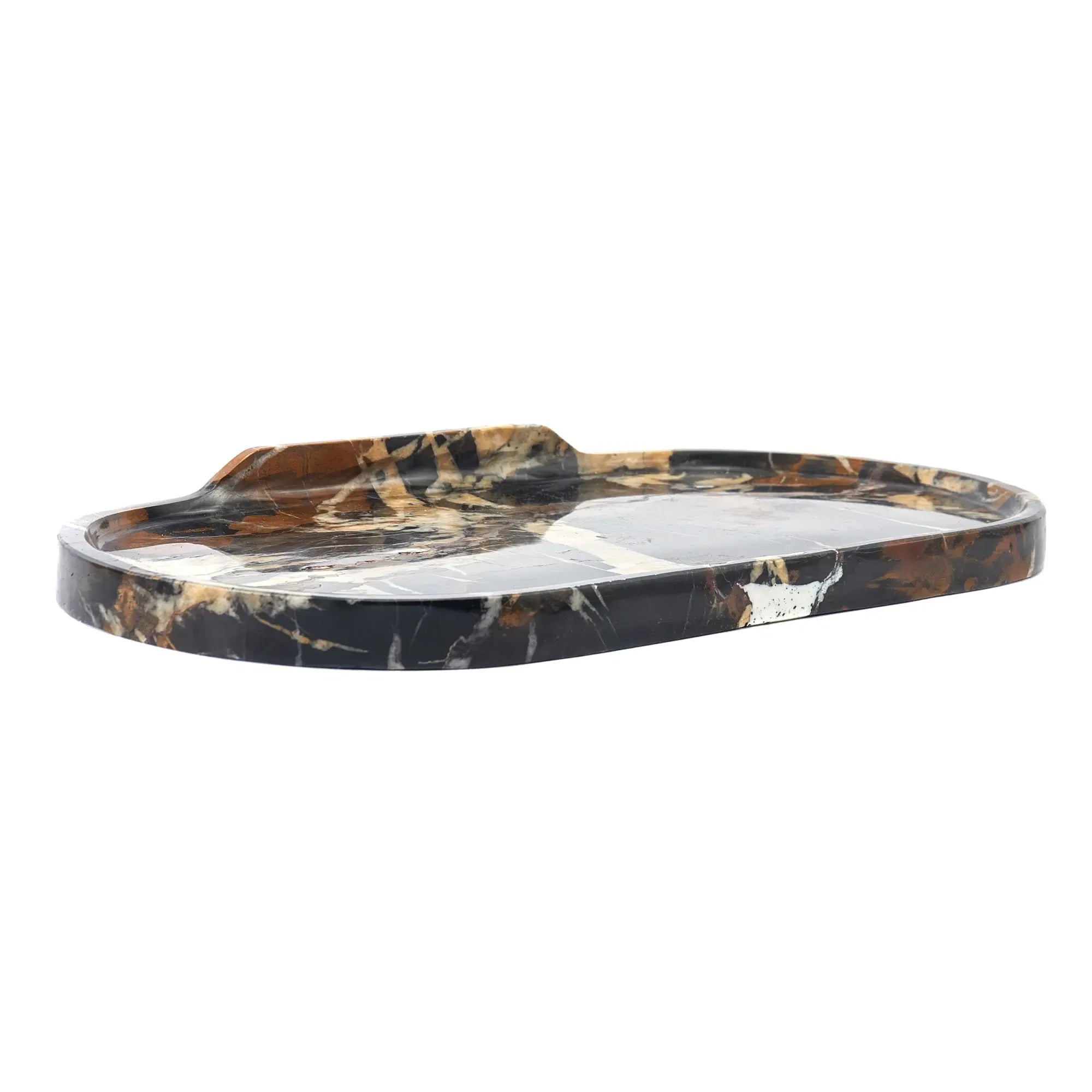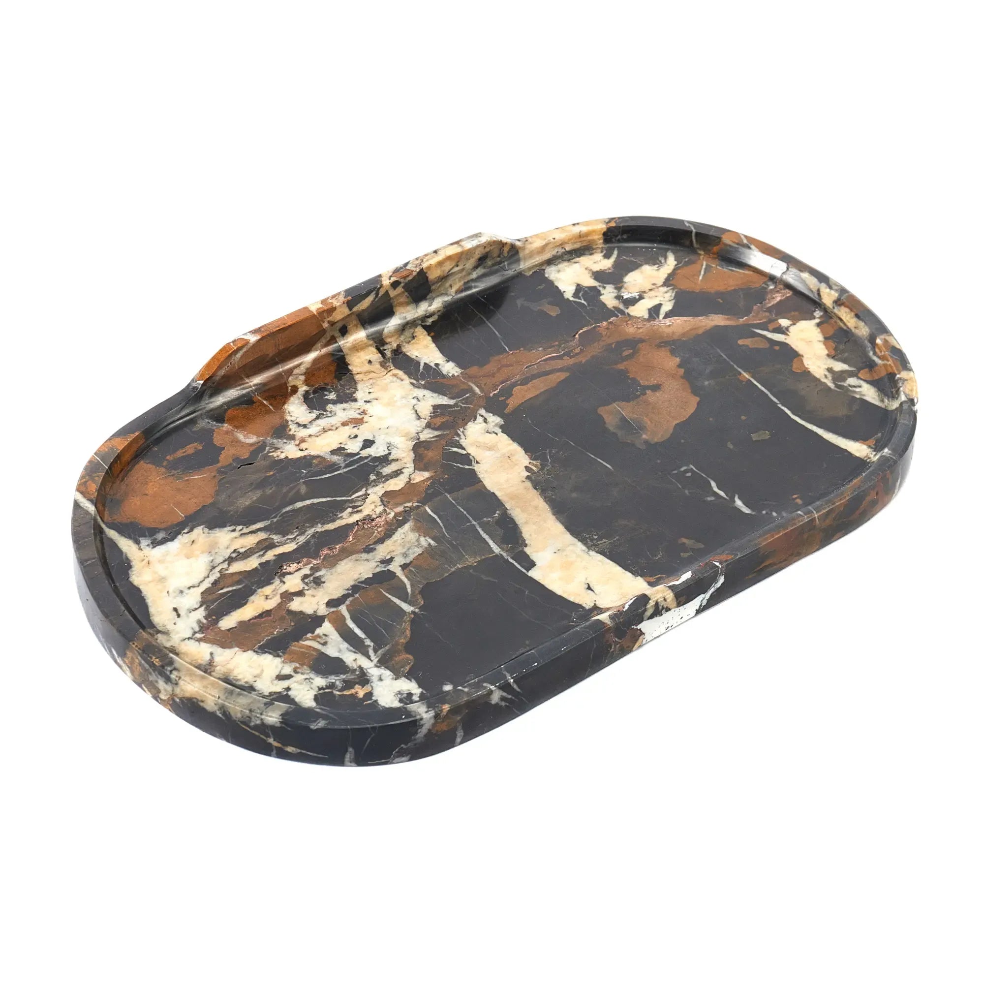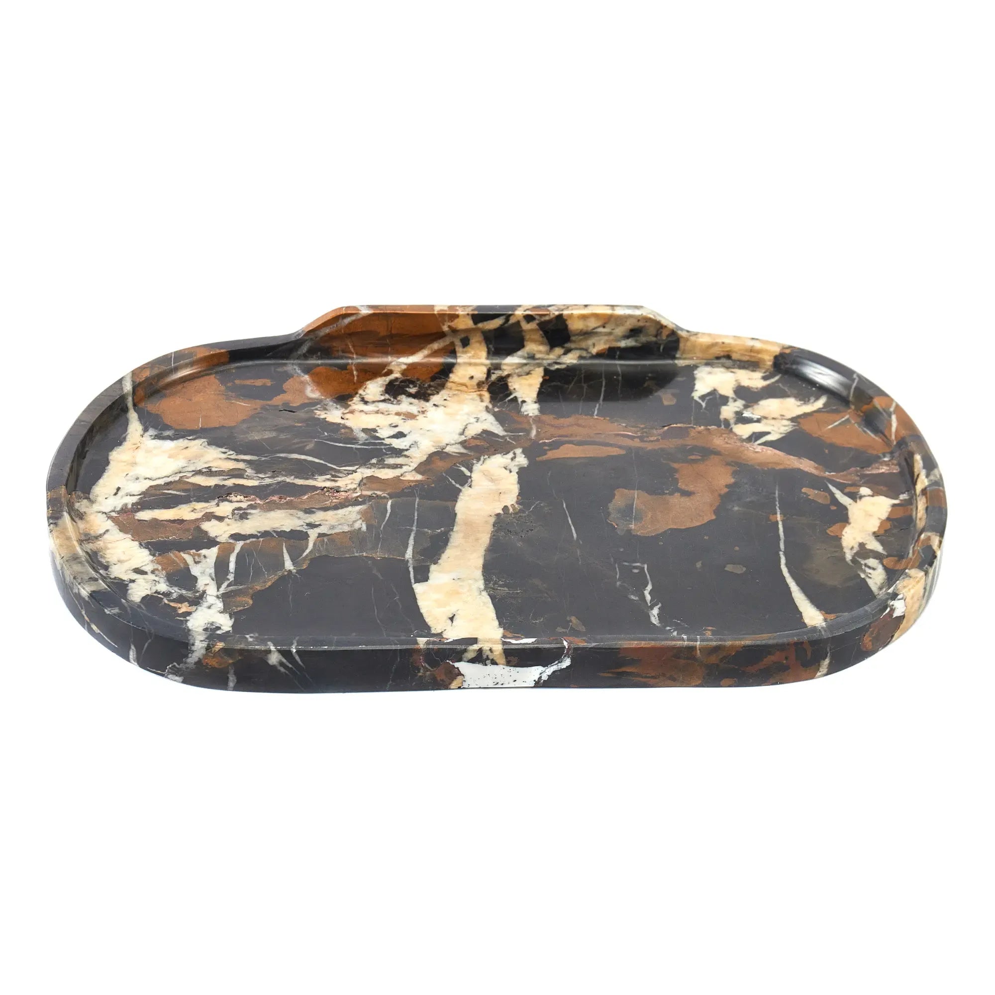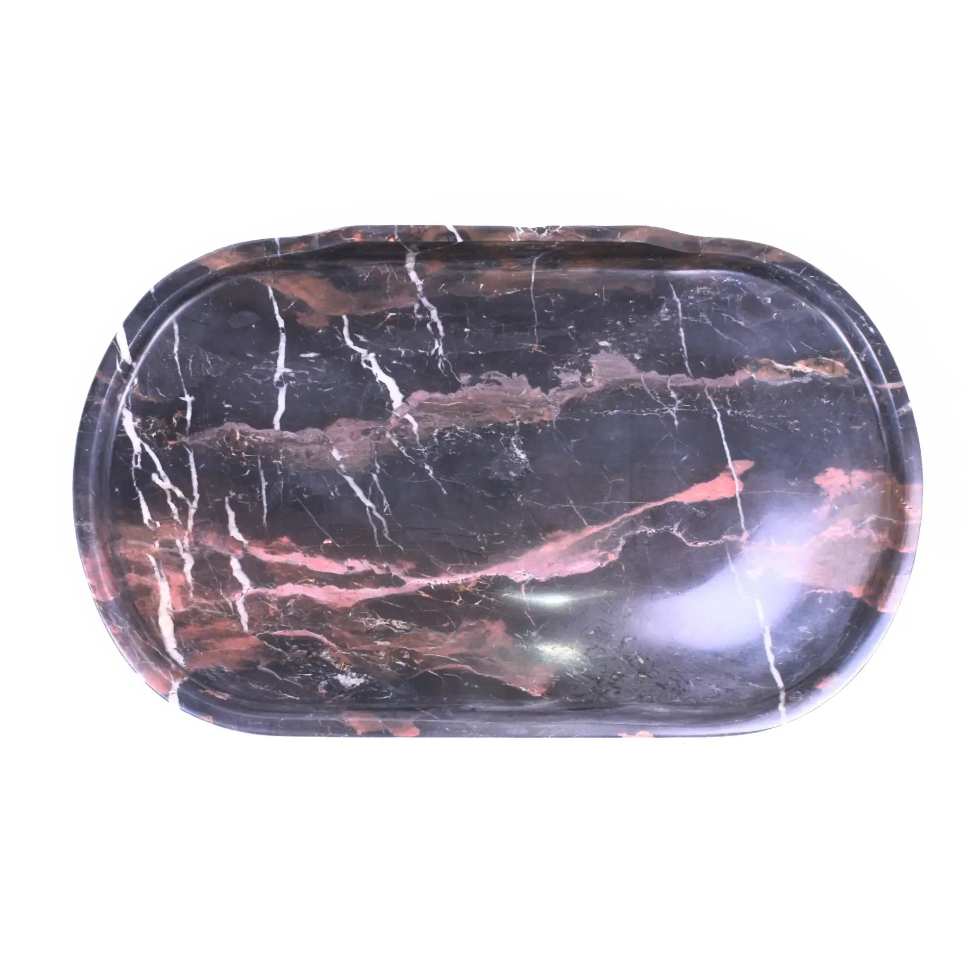 Gefertigt aus erstklassigem dunkelbraunem Marmor mit natürlichen weißen und roten Maserungen, die dem Tablett eine einzigartige und luxuriöse Optik verleihen. Inspiriert von altrömischer Eleganz, kombiniert zeitlose Ästhetik mit moderner Funktionalität.