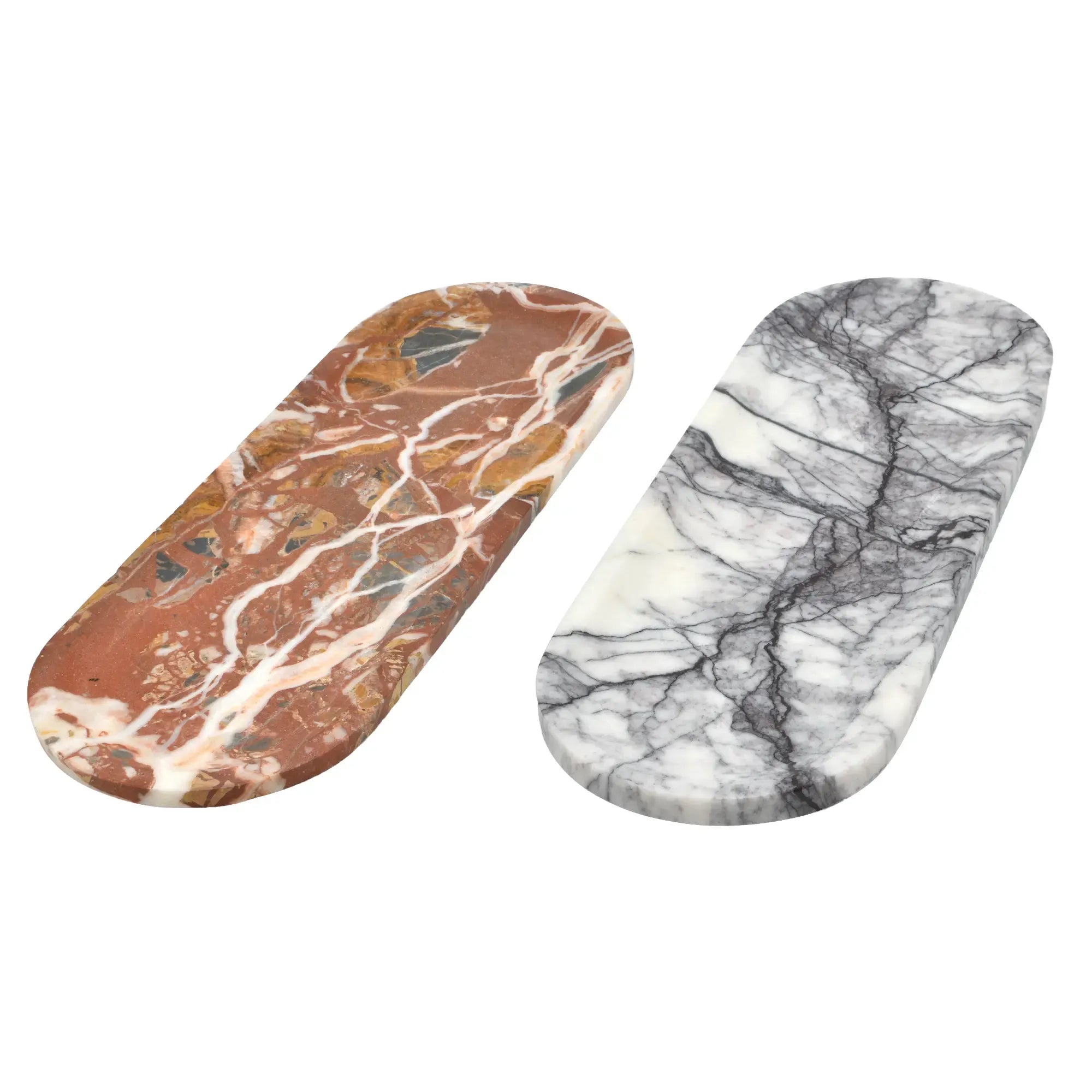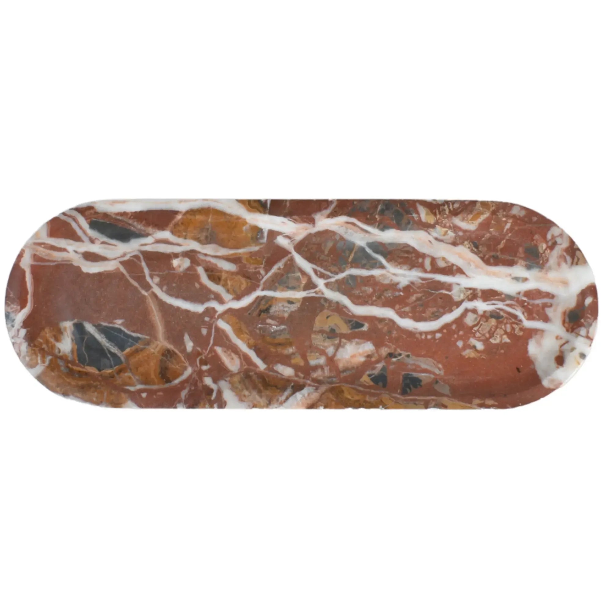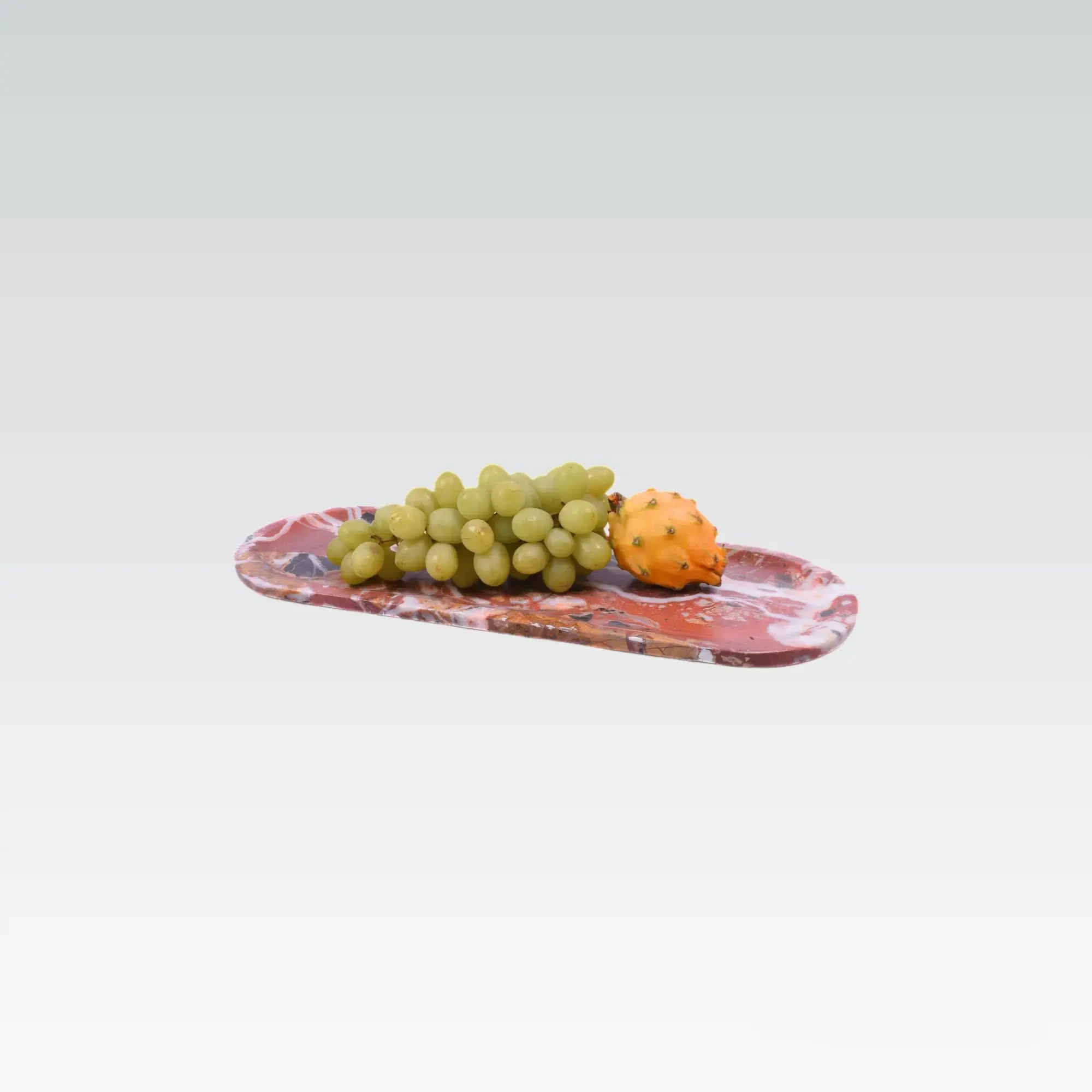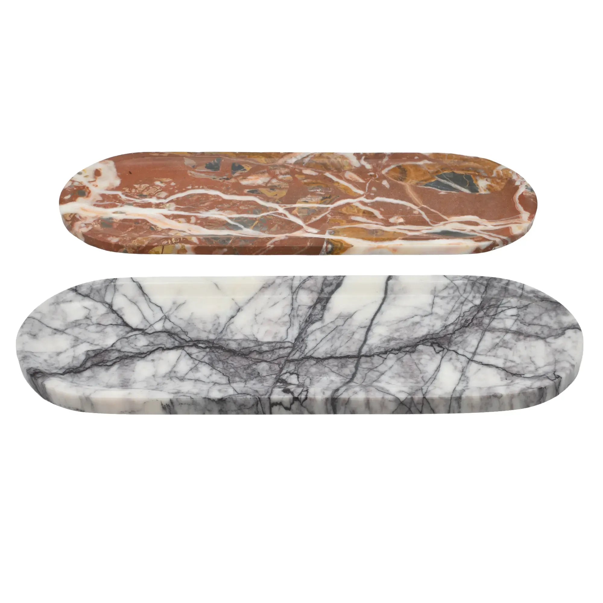 Dieses ovale Ablagetablett aus massivem Marmor vereint antike Materialwürde mit moderner Klarheit. Fein poliert, mit sanft gerundeten Kanten, zeigt es lebendige Aderungen: eine Variante in warmem Rosso mit cremefarbenen Linien, die andere in kühlem Bianco‑Grigio mit grafischem Verlauf. Handwerklich geschliffen wirkt es als dezentes Designobjekt, Skulptur und Bühne für kleine Kostbarkeiten. Jede Platte ist ein Unikat; Zeichnung und Ton variieren. Einzeln oder als Duo erhältlich, setzt das Naturstein‑Kunstobjekt ruhige, zeitlose Akzente.