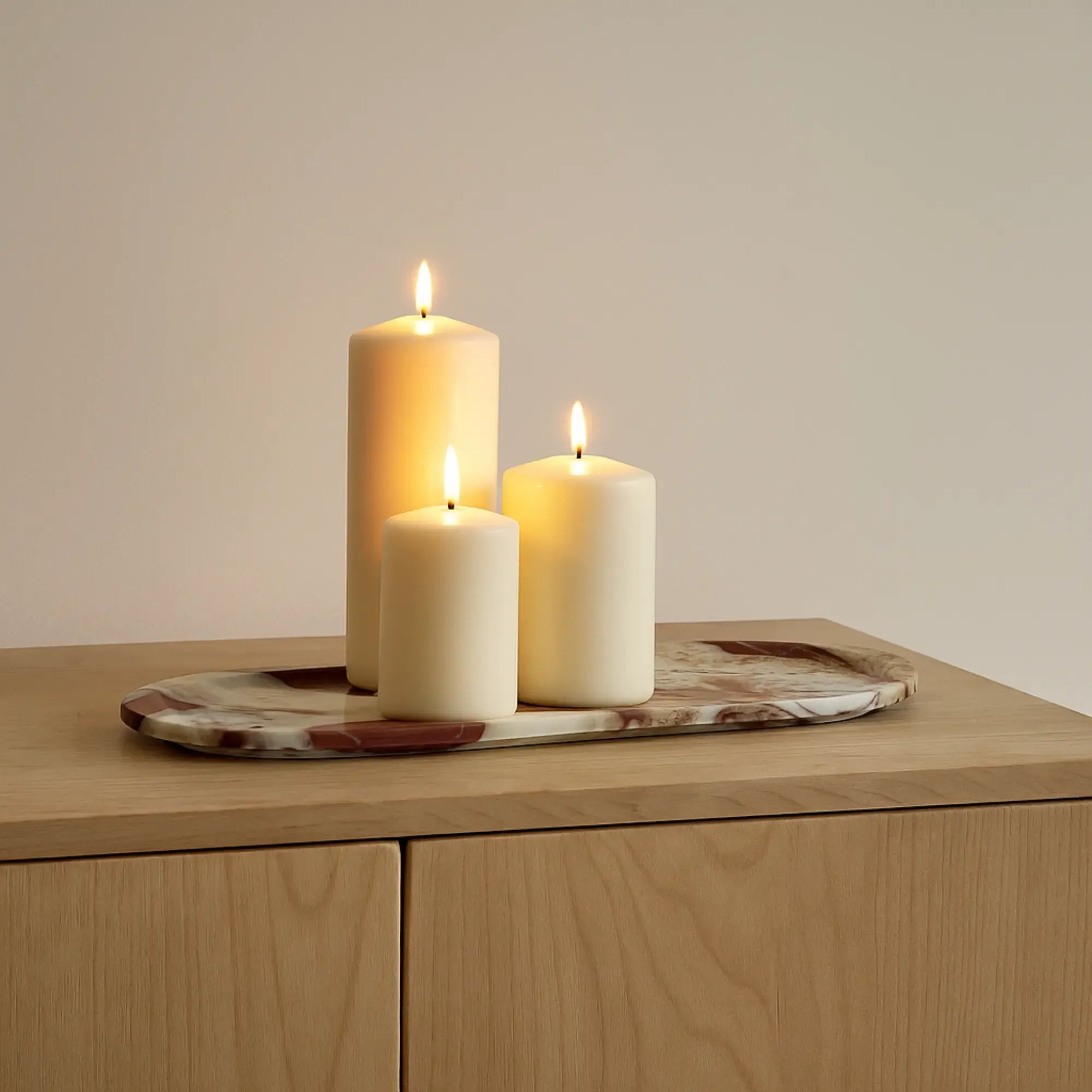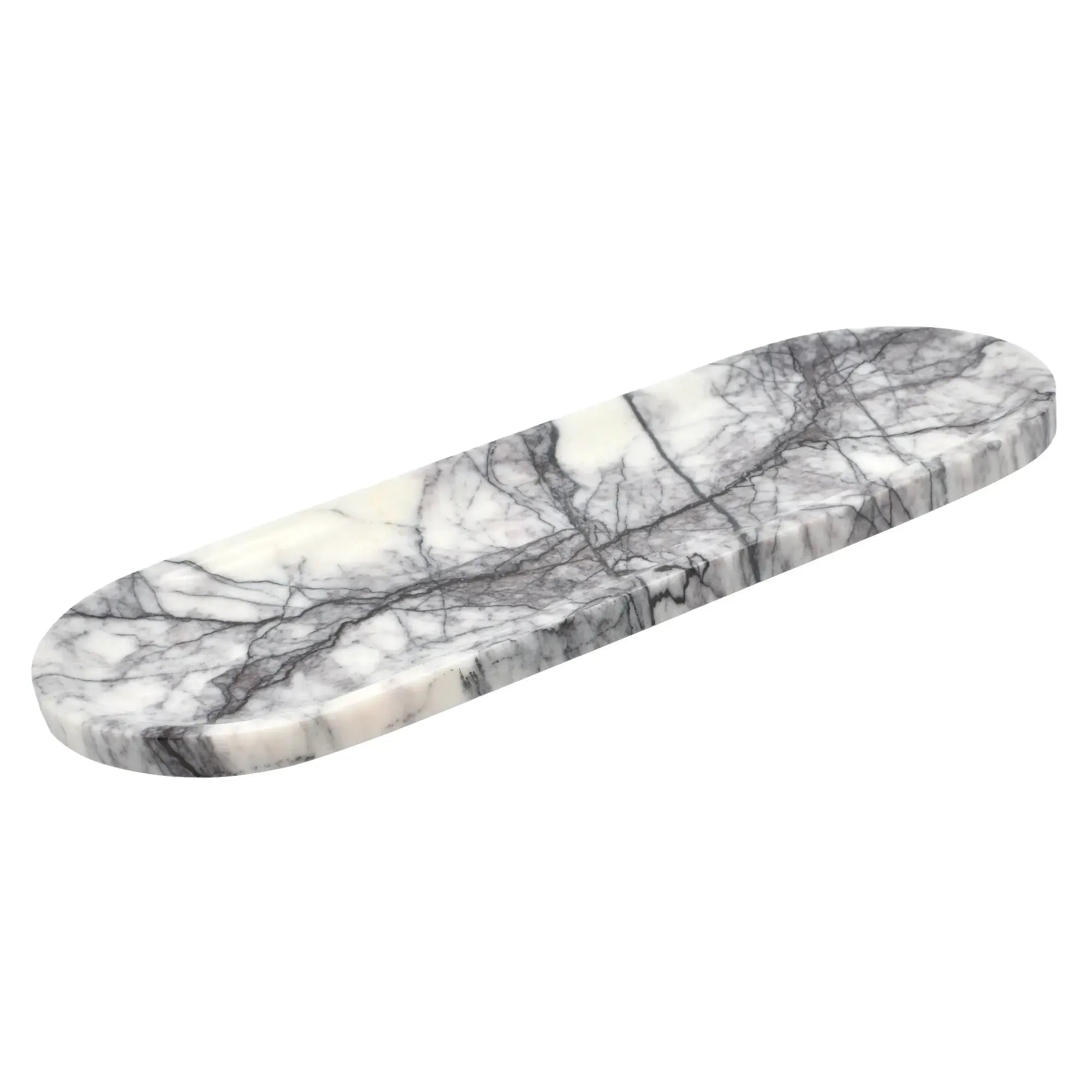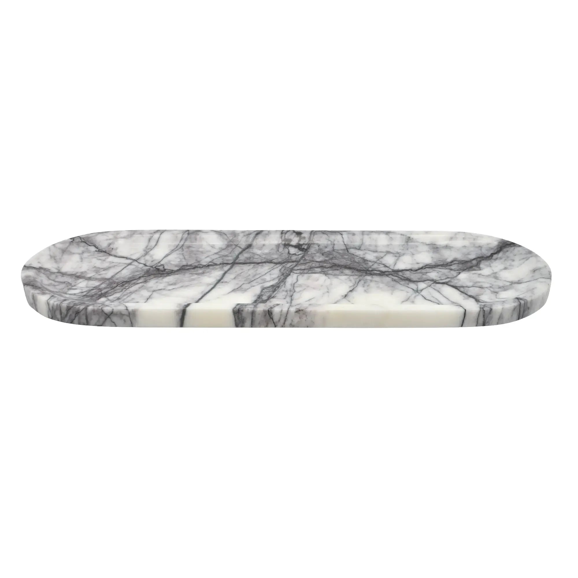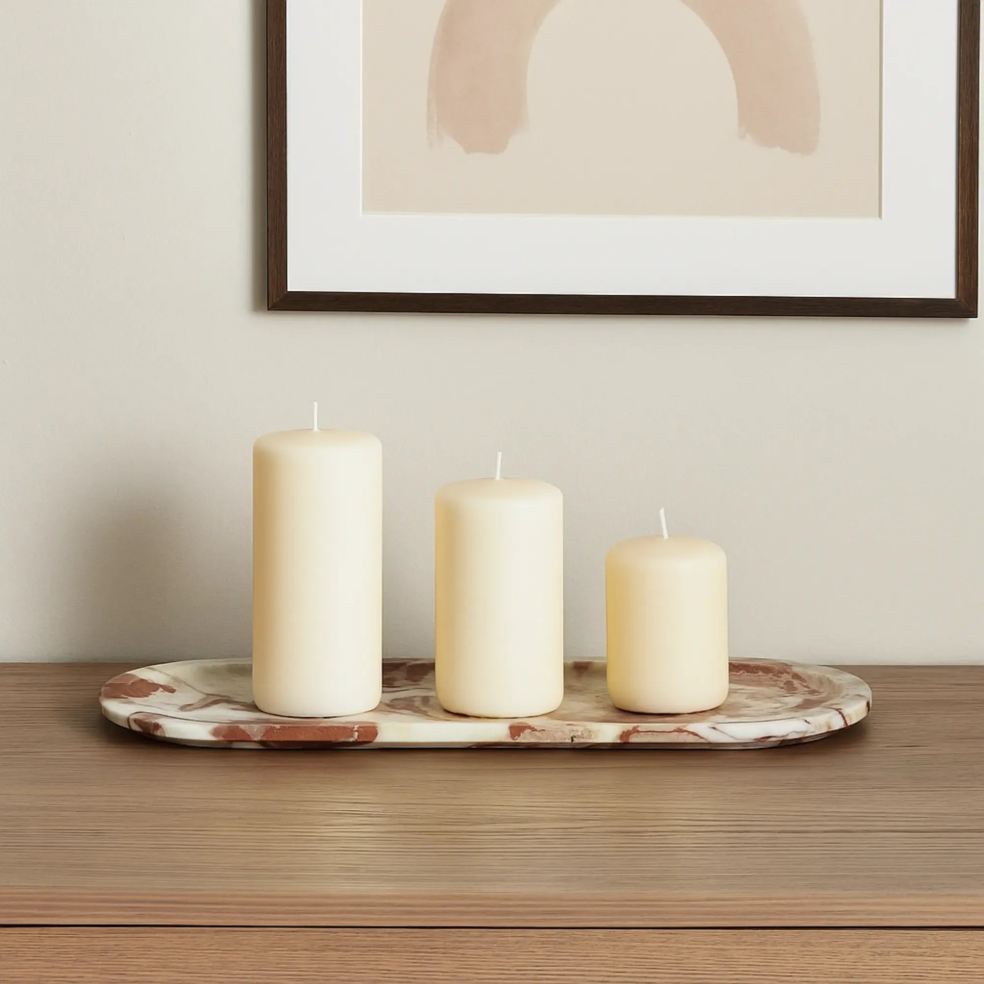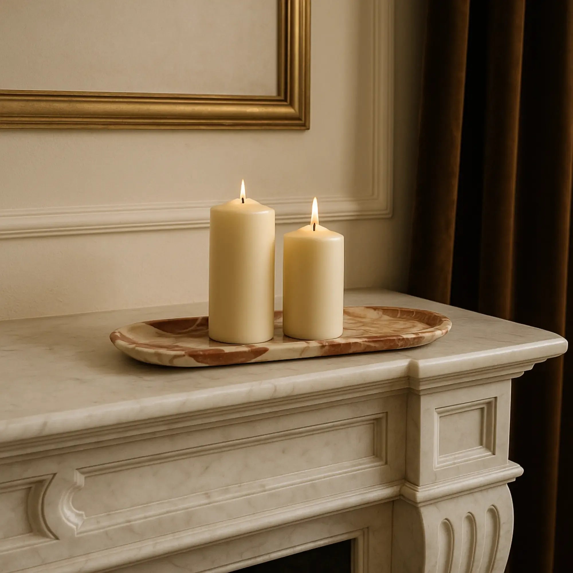 Dieses ovale Ablagetablett aus massivem Marmor vereint antike Materialwürde mit moderner Klarheit. Fein poliert, mit sanft gerundeten Kanten, zeigt es lebendige Aderungen: eine Variante in warmem Rosso mit cremefarbenen Linien, die andere in kühlem Bianco‑Grigio mit grafischem Verlauf. Handwerklich geschliffen wirkt es als dezentes Designobjekt, Skulptur und Bühne für kleine Kostbarkeiten. Jede Platte ist ein Unikat; Zeichnung und Ton variieren. Einzeln oder als Duo erhältlich, setzt das Naturstein‑Kunstobjekt ruhige, zeitlose Akzente.