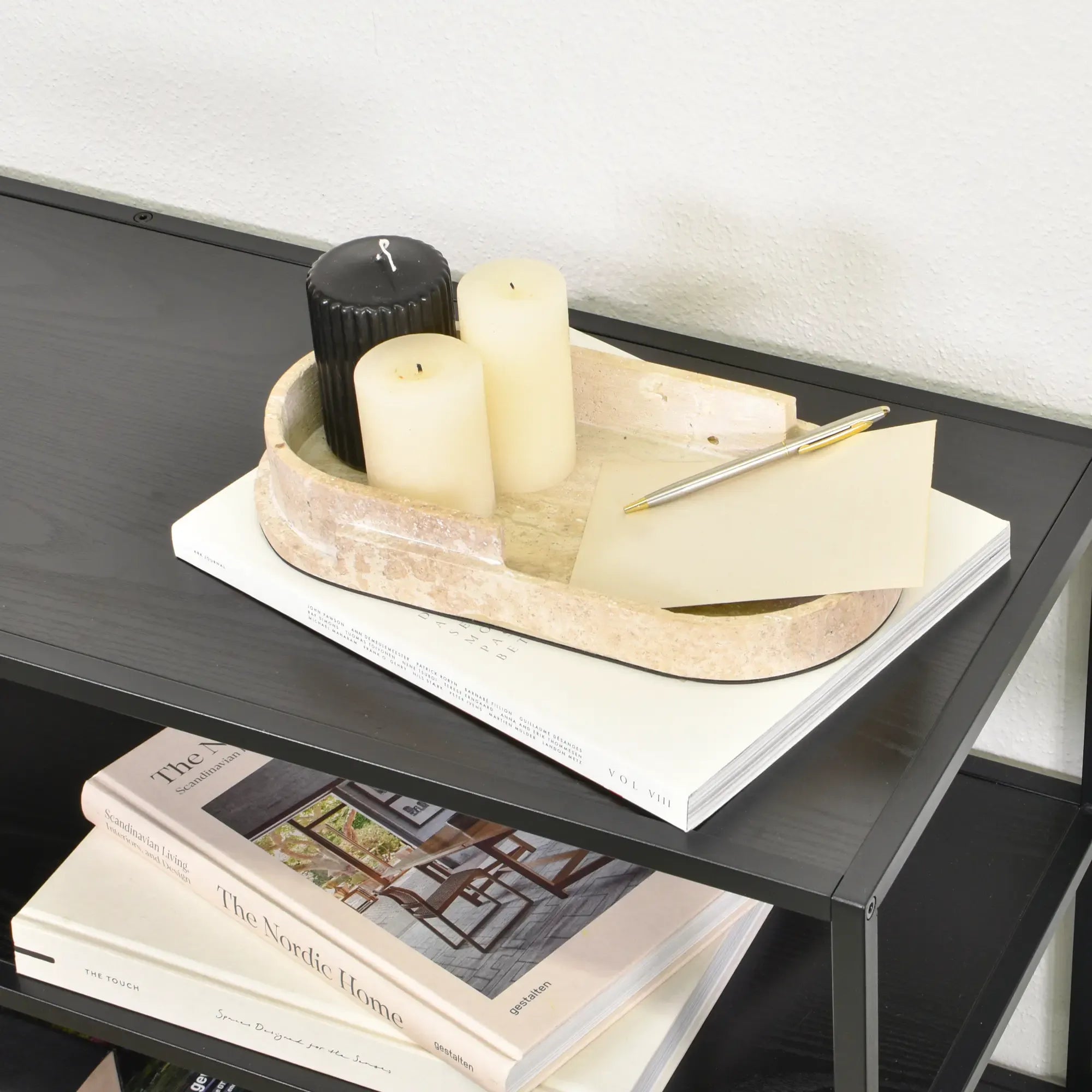 Dieses ovale Naturstein-Tableau verbindet archaische Materialität mit präziser Linienführung. Gefertigt aus massivem Travertin zeigt das Tablett eine seidenmatt geschliffene, feinporige Oberfläche; dezente Äderungen bleiben fühlbar. Der umlaufende Rand und ein integrierter Steg strukturieren die Fläche, schaffen Ordnung und rahmen Objekte wie auf einer stillen Bühne. Die Formensprache ist klar, von architektonischen Becken und minimalistischen Plateaus inspiriert: ausgewogene Proportionen, weiche Handkante, ruhige Masse. Ein funktionales Designobjekt, Dekoteller, Ablage und skulpturales Plateau in einem – reduziert, materiell, dauerhaft.