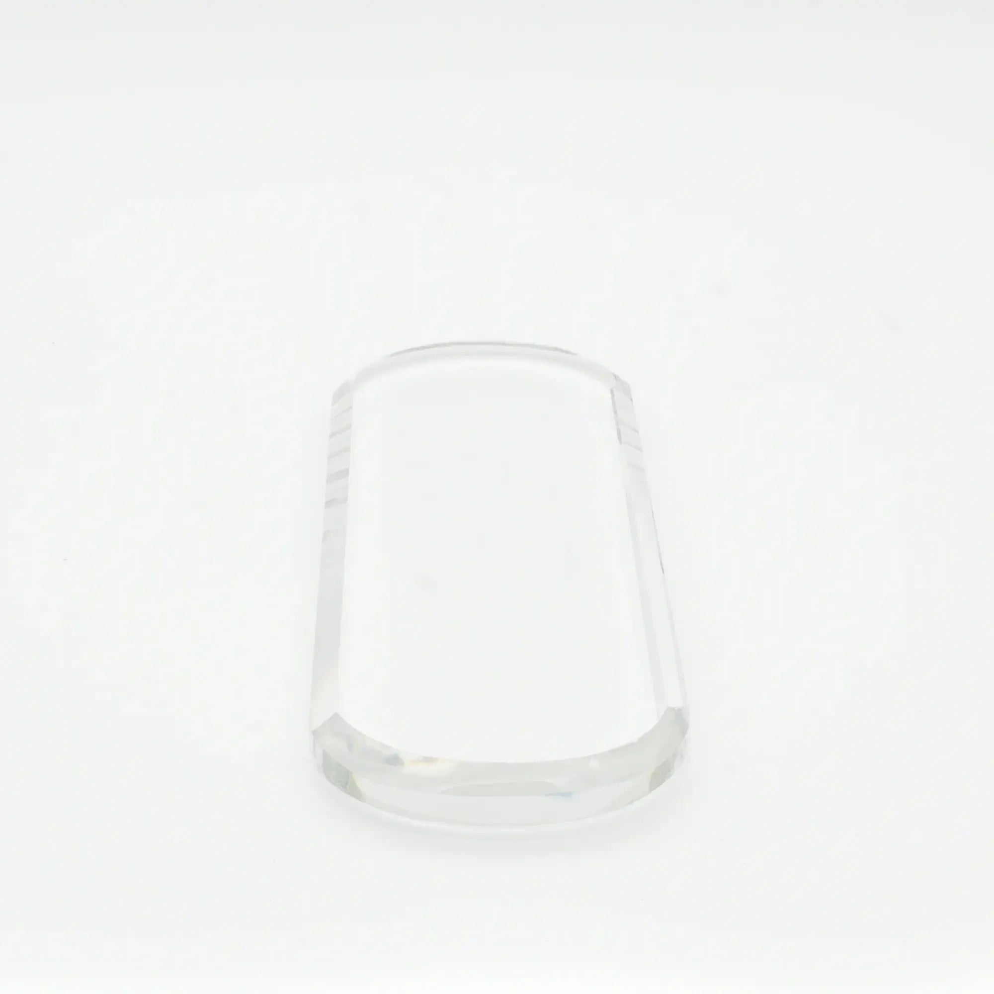 Fein geschliffener, klarer Kristall mit präzisen Kanten und funkelnder Lichtbrechung. Die glatte Oberfläche reflektiert das Licht in sanften Regenbogentönen und verleiht dem Material eine edle, luxuriöse Präsenz.