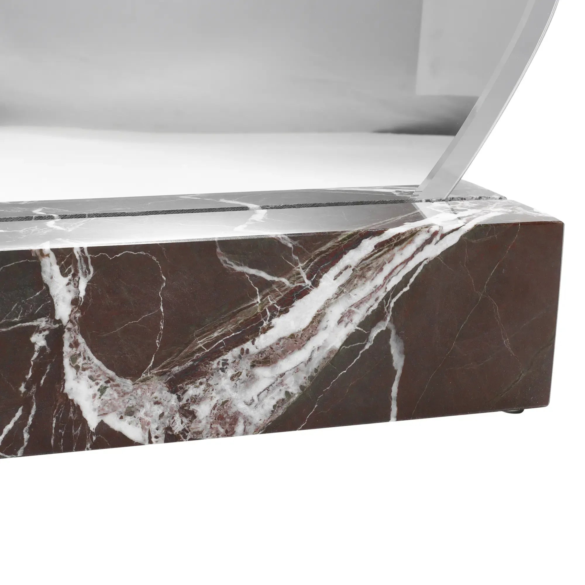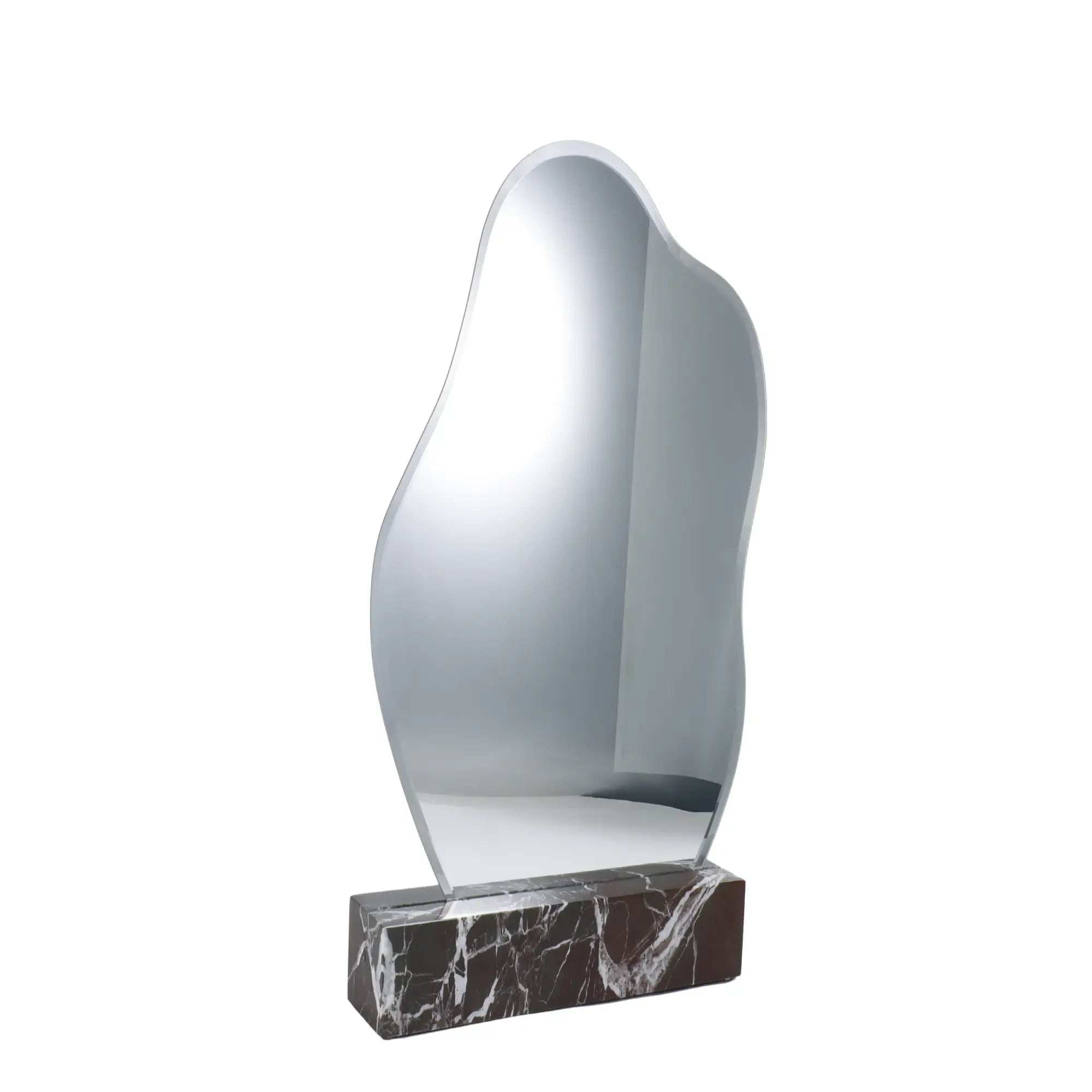 Hochwertiger, geschwungener Spiegel in eleganter Freiform trifft auf einen soliden roten Marmorsockel mit markanter Maserung. Die Verbindung von Glas und Naturstein verleiht dem Objekt Substanz und Exklusivität.
