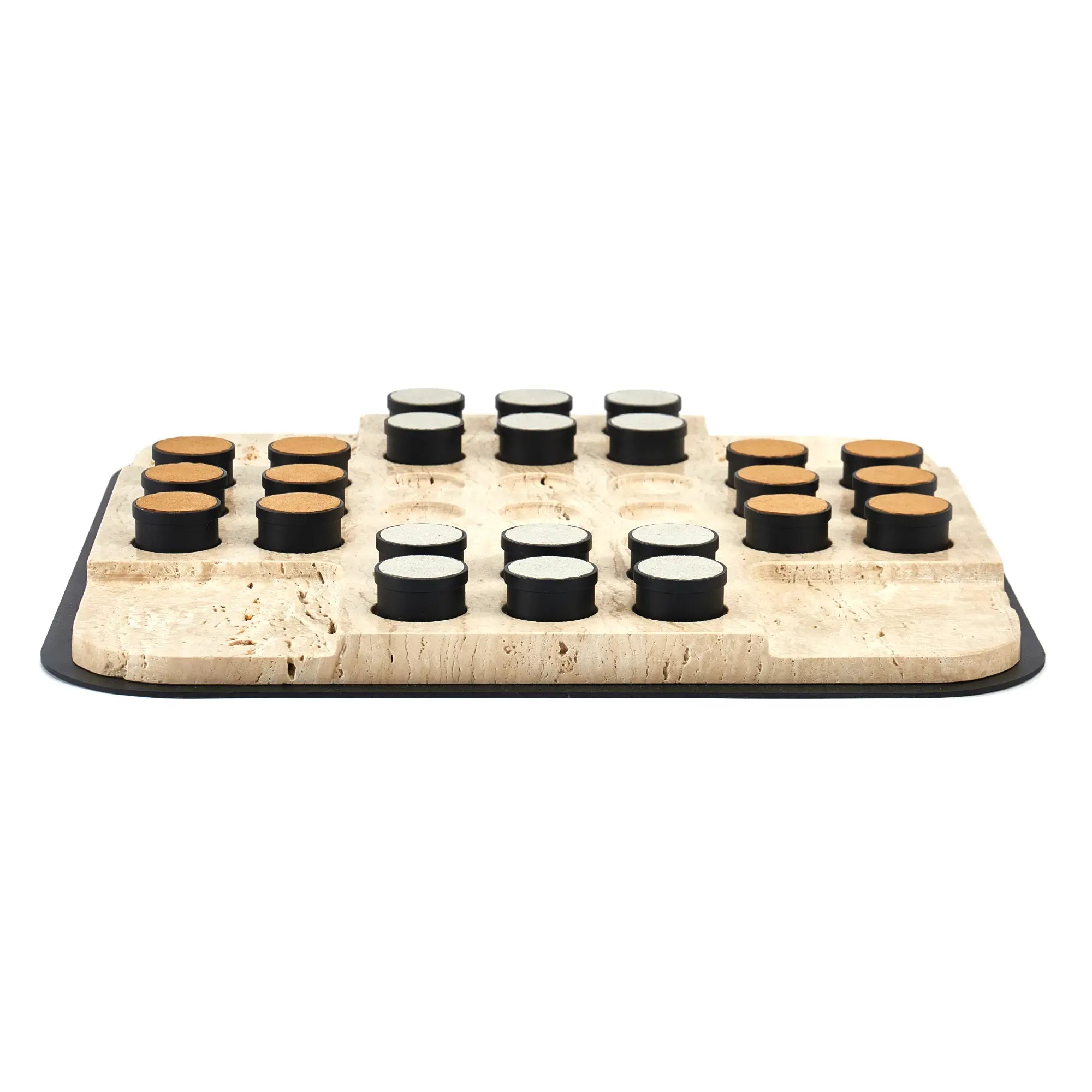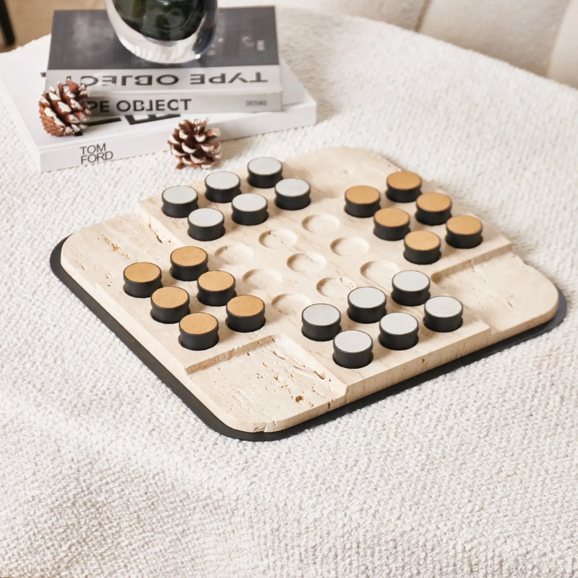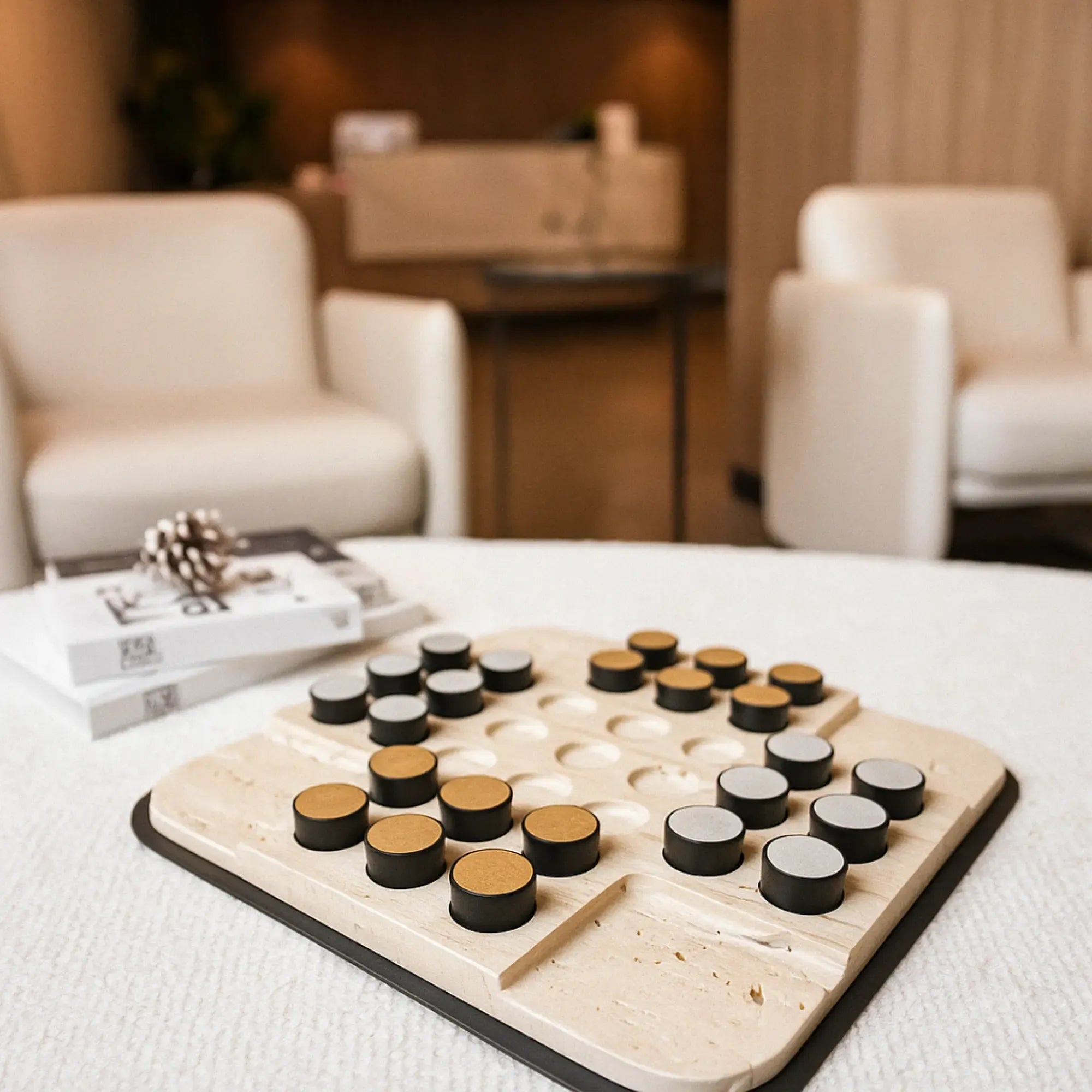 Luxuriöses Strategiespiel, Travertin-Deko, handgefertigtes Unikat, modernes Wohnaccessoire, edles Geschenk für Strategen & Designliebhaber, exklusives Tischobjekt mit zeitloser Eleganz.
