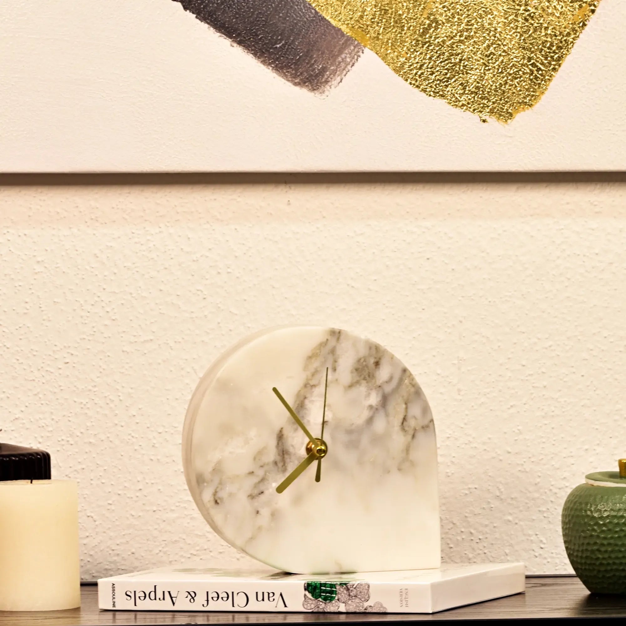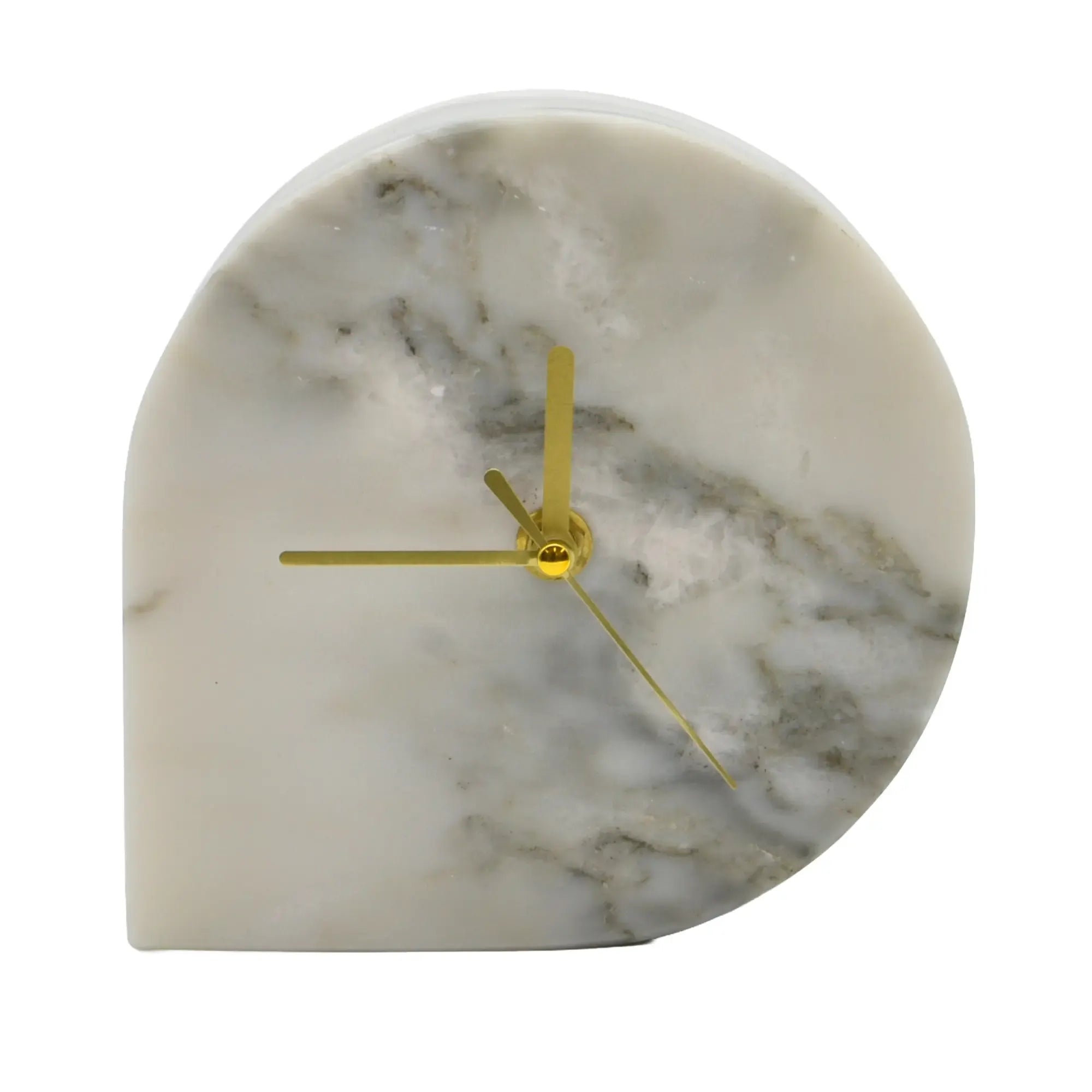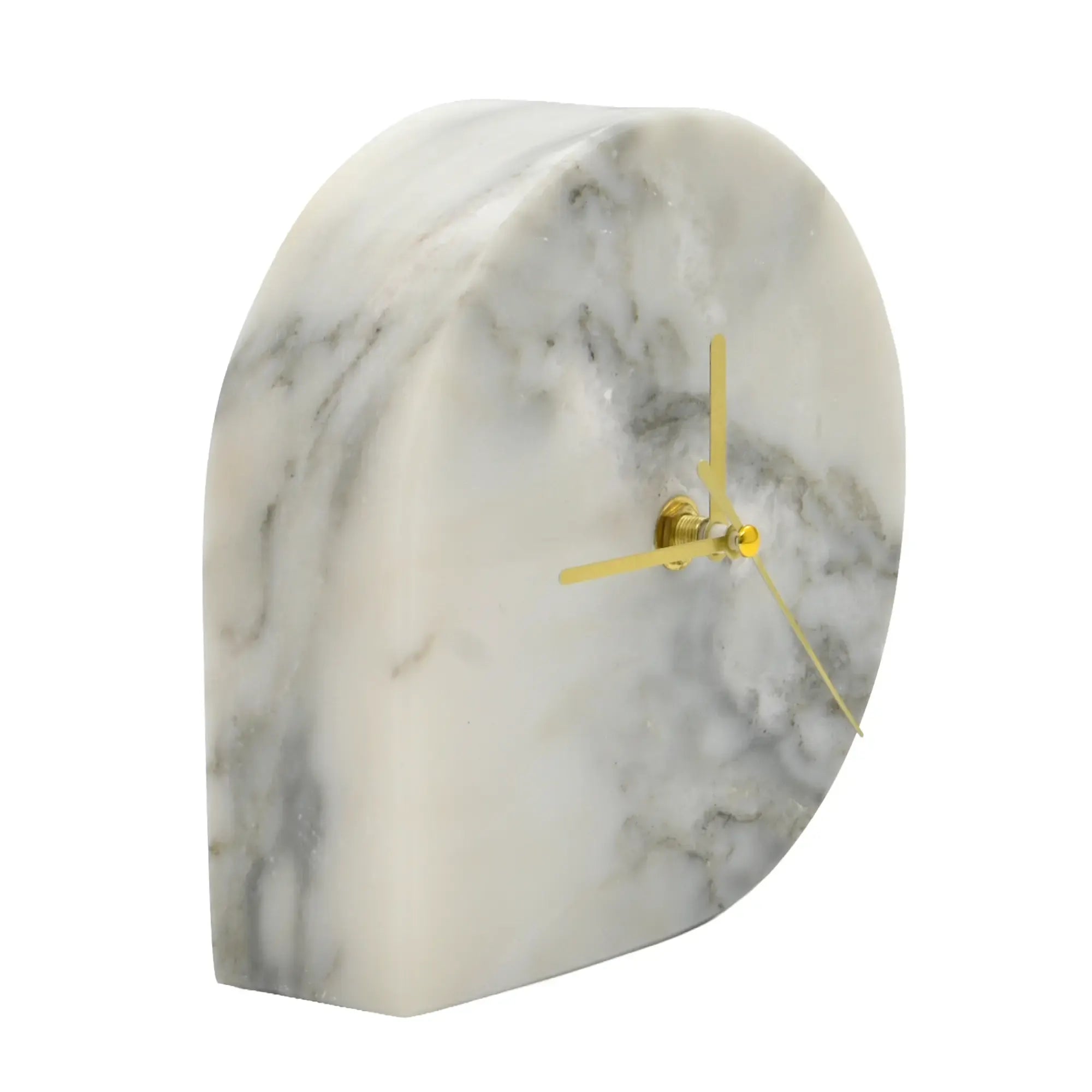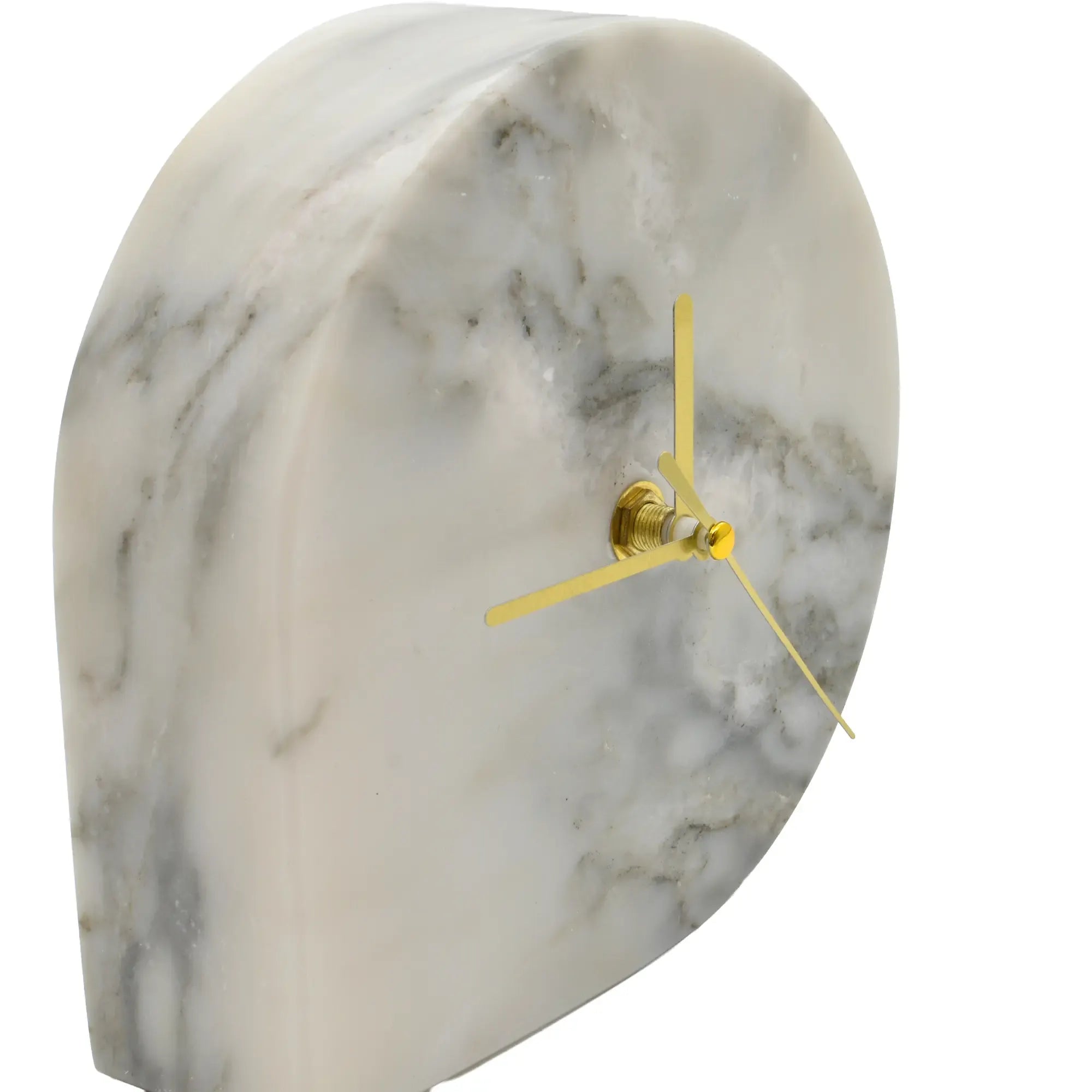 Reduzierte Eleganz mit skulpturaler Präsenz. Diese moderne Uhr verbindet Geometrie und Materialästhetik zu einem klaren Design-Statement. Der halbkreisförmige Korpus aus weißem Marmor ruht stabil auf der Fläche und setzt mit fein geschliffenen Kanten subtile 3D-Effekte. Schlanke, goldfarbene Zeiger schweben über der ruhigen Maserung – ein feiner Kontrast, der die Zeit beinahe schweigend sichtbar macht.