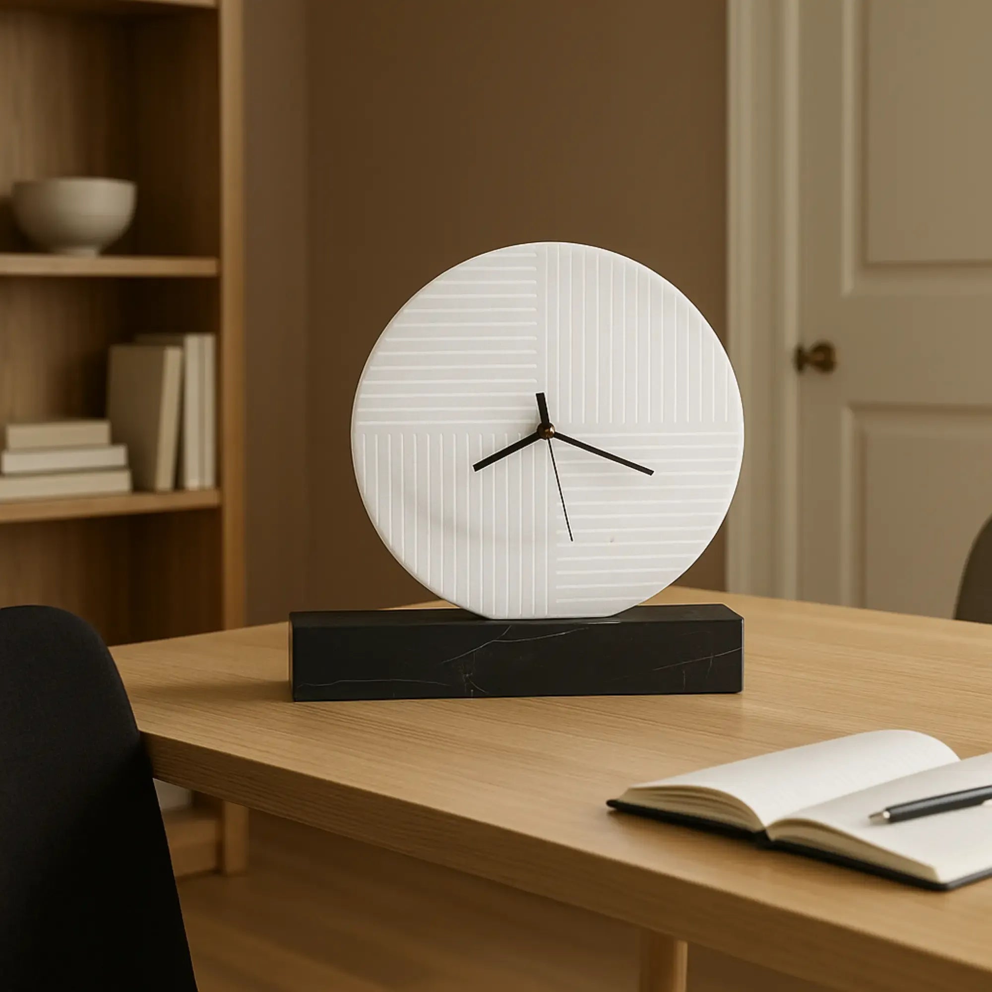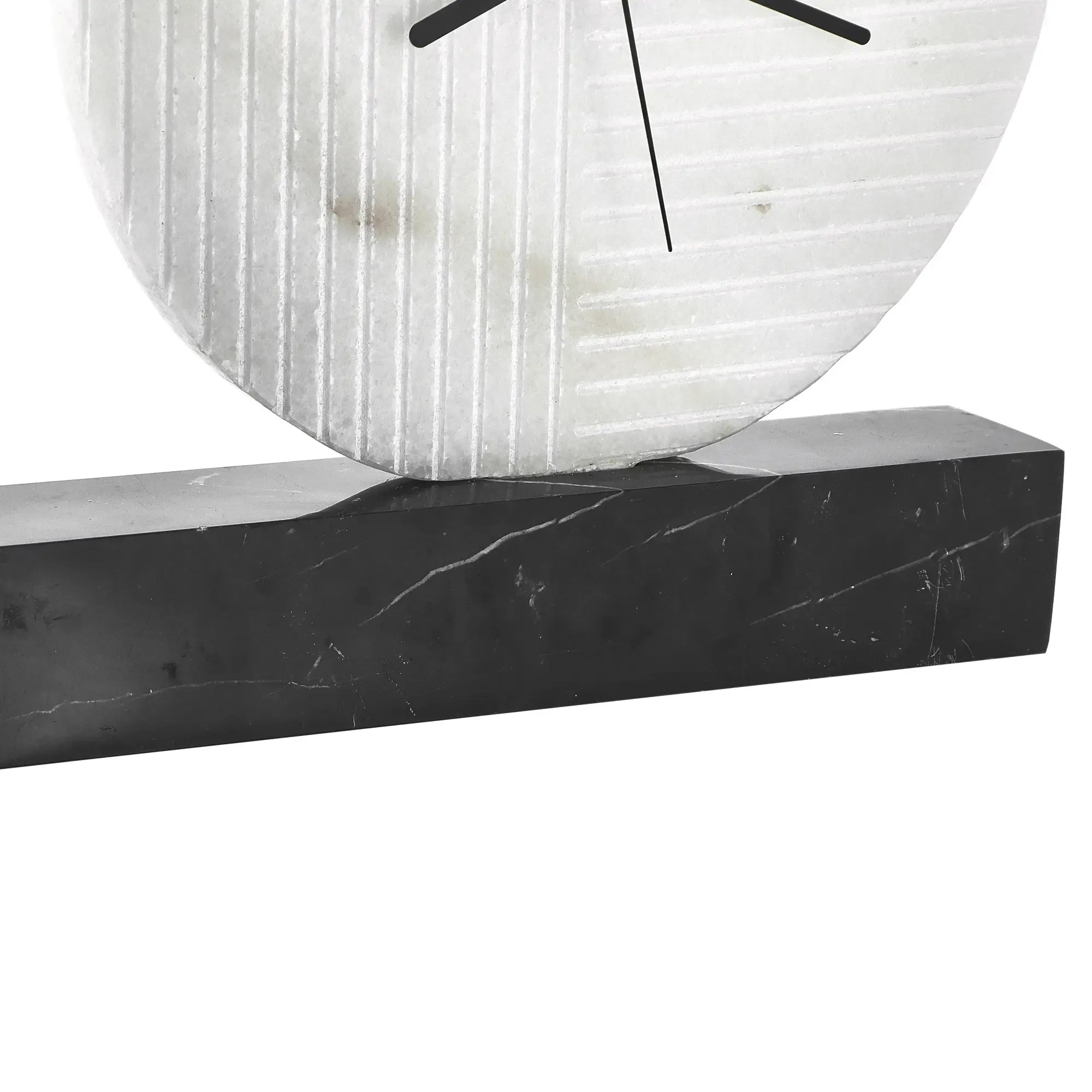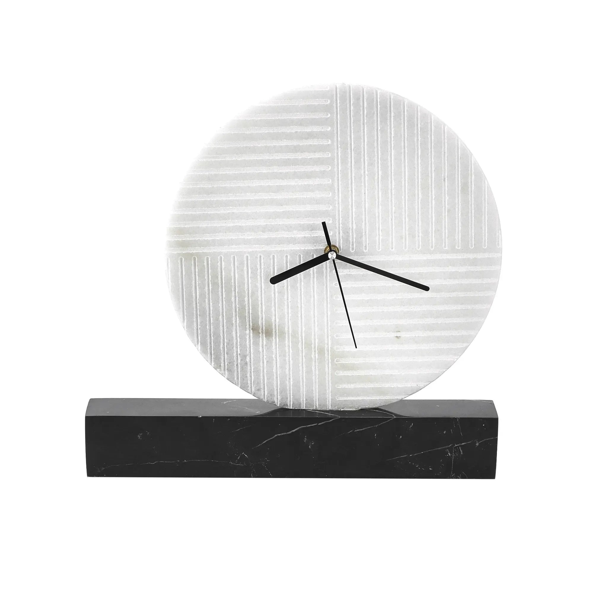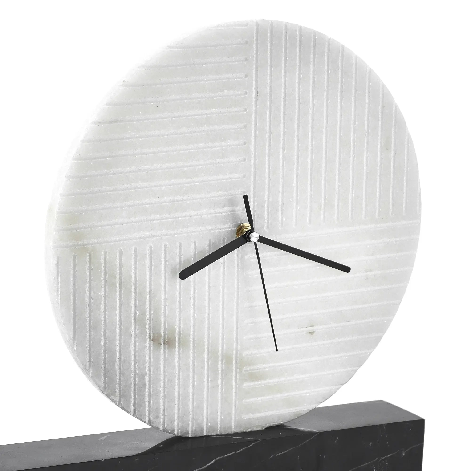 Gefertigt aus hochwertigem Naturmarmor: ein weißes Ziffernblatt mit feiner Struktur ruht auf einem massiven schwarzen Marmorsockel. Die natürliche Maserung macht jede Uhr zu einem handgefertigten Unikat mit architektonischem Charakter.