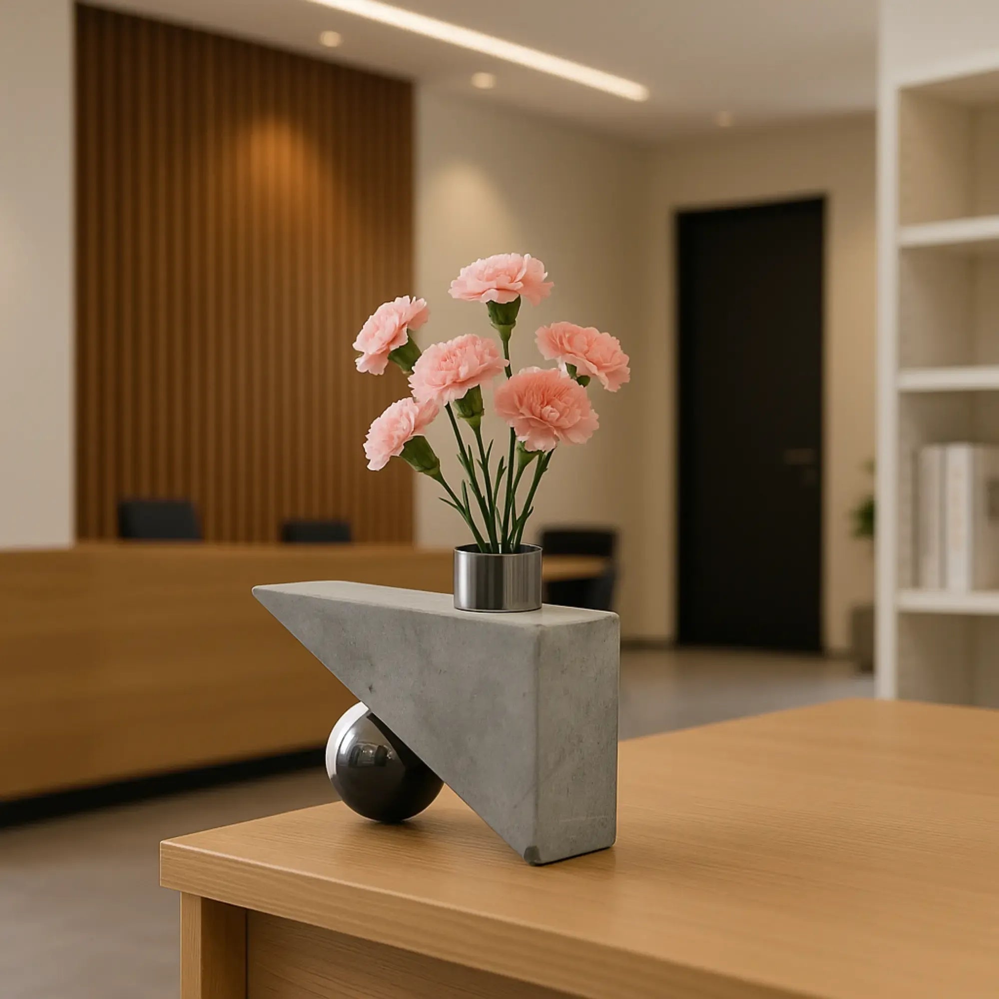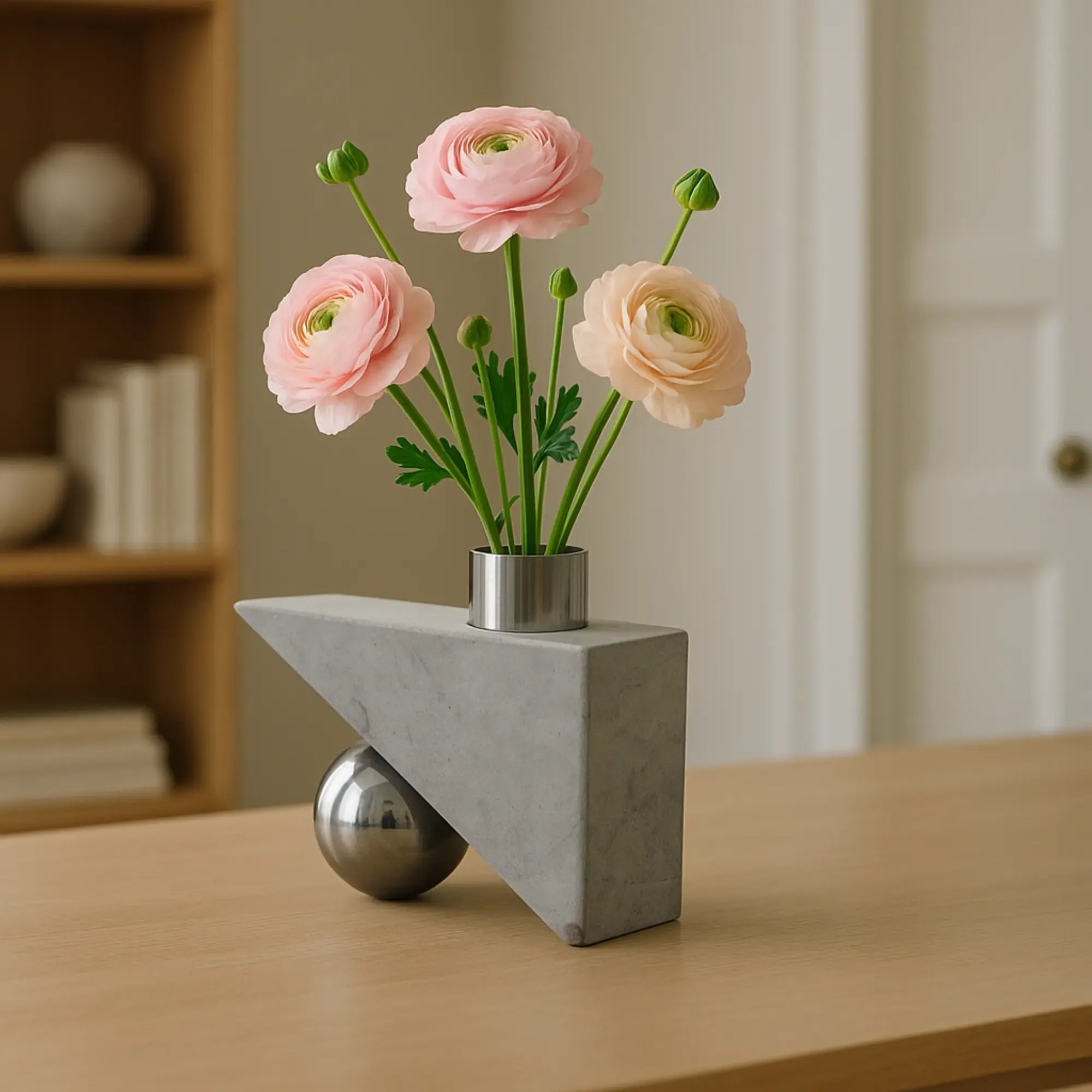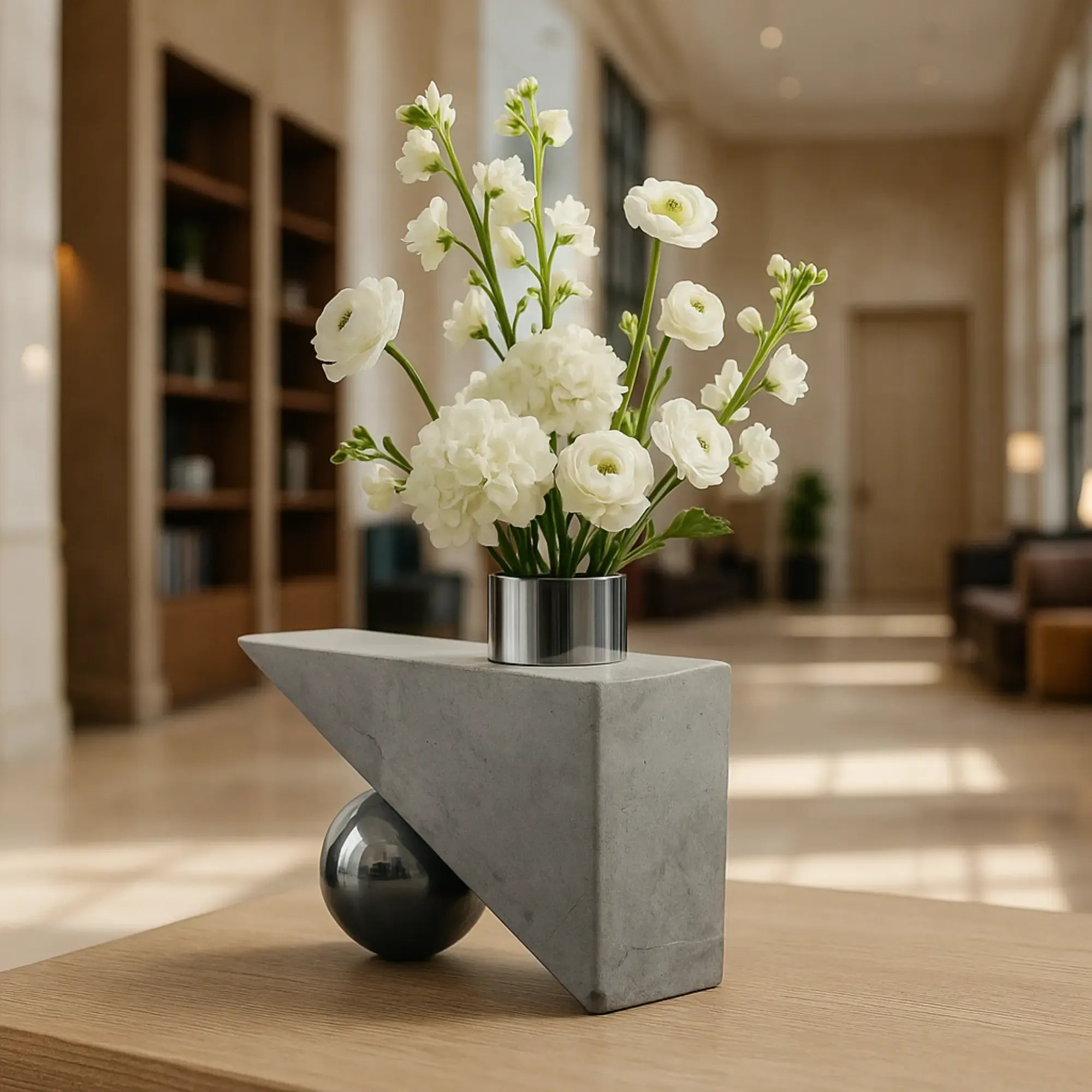 Architektonisch inspiriertes Design mit klaren Linien und kontrastreicher Formensprache – die minimalistische Edelstahlvase ruht auf einem skulpturalen Steinsockel.