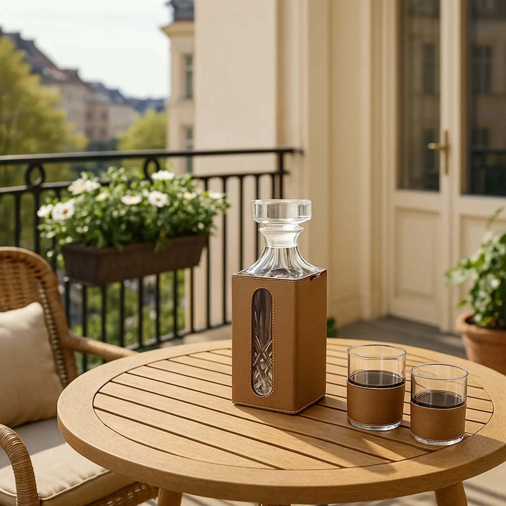 Das Whiskey Luxe Set ist die perfekte Kombination aus Design, Funktion und Luxus – ideal für anspruchsvolle Genießer und stilbewusste Whiskyliebhaber. Das Set besteht aus einer hochwertigen Kristallkaraffe 9cm Breite, 9cm Tiefe und 26cm Höhe, mit Lederummantelung sowie zwei passenden Whiskygläsern 8,5cm Durchmesser und 9cm Höhe mit Lederdetails, die durch ihre klare Form und das strukturierte Material überzeugen. Veredelt mit edlem, braunem, grauen oder cognac Kunstleder, vereint das Set modernes Barzubehör mit zeitloser Ästhetik. Ob für entspannte Abende oder besondere Anlässe – dieses Whisky Set mit Karaffe und Gläsern ist ein dekoratives Statement für Wohnräume, Bibliothek, Küche oder Homeoffice. Perfekt kombinierbar mit dem Plateau Doré, wird das Ensemble zum Blickfang auf Sideboards, Bartischen oder im Office. Auch in stilvollen Restaurants oder gehobenen Hotels sorgt das Whiskey Luxe Set für einen Hauch von Exklusivität und Eleganz. Als Geschenk zur Einweihung oder für Whiskyliebhaber ist dieses handveredelte Set ein echtes Highlight – stilvoll, hochwertig und außergewöhnlich.