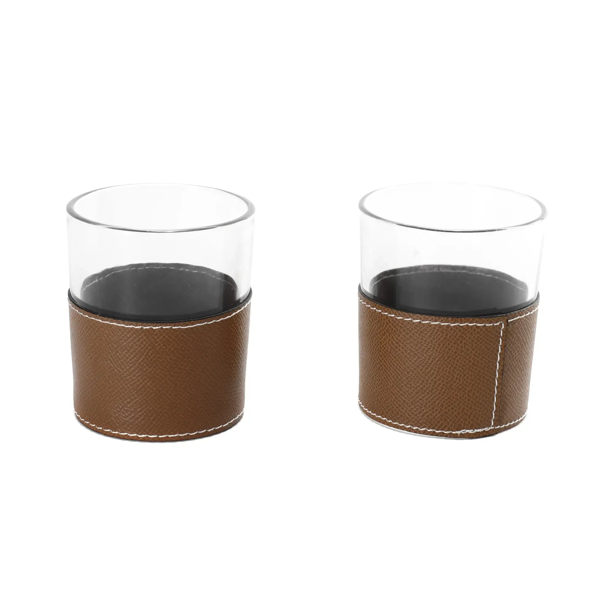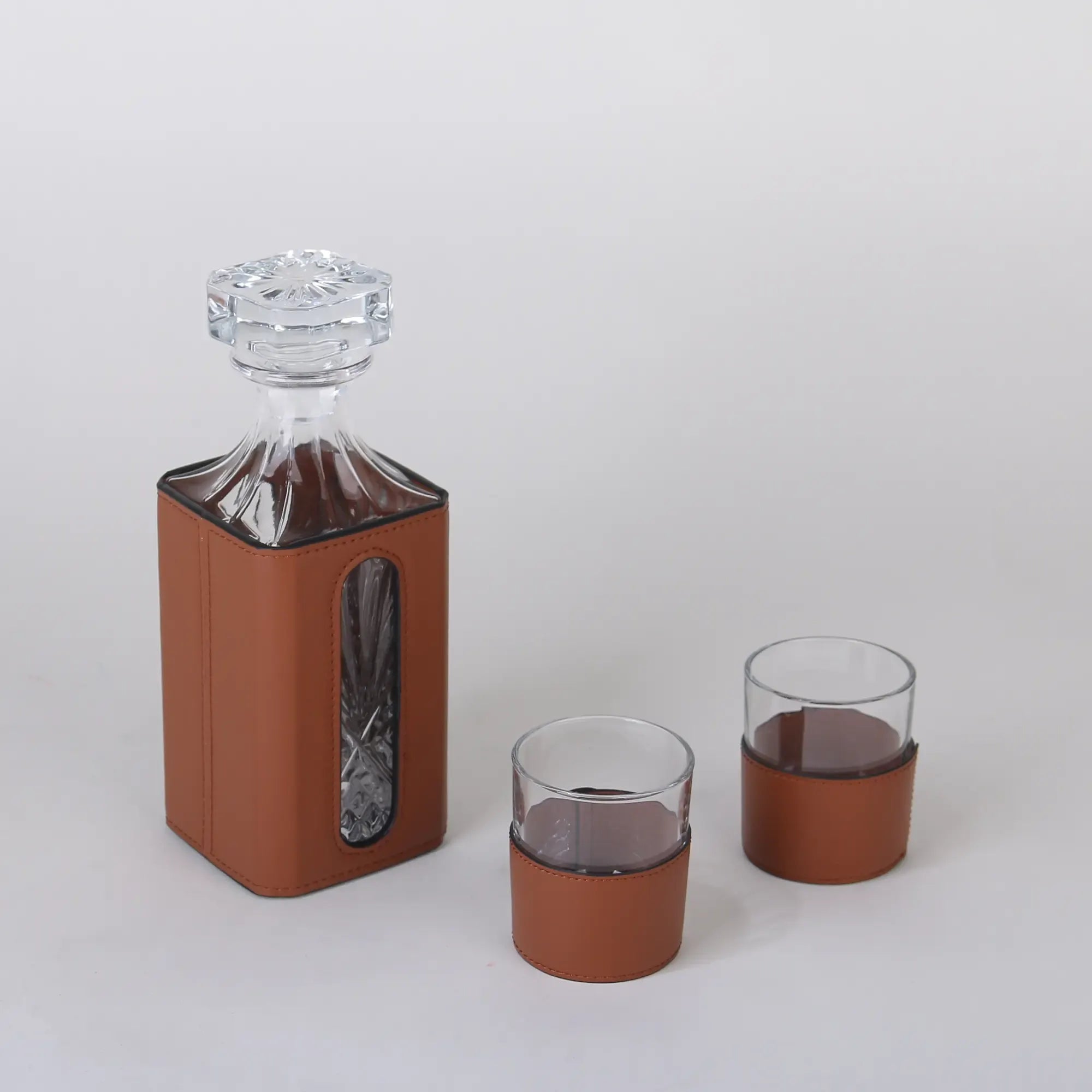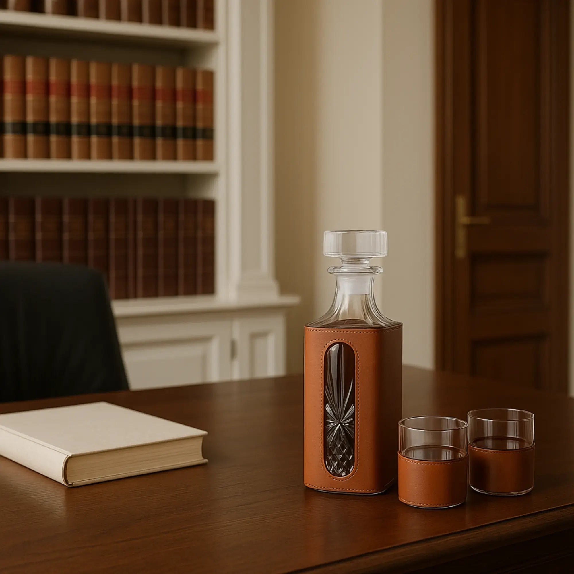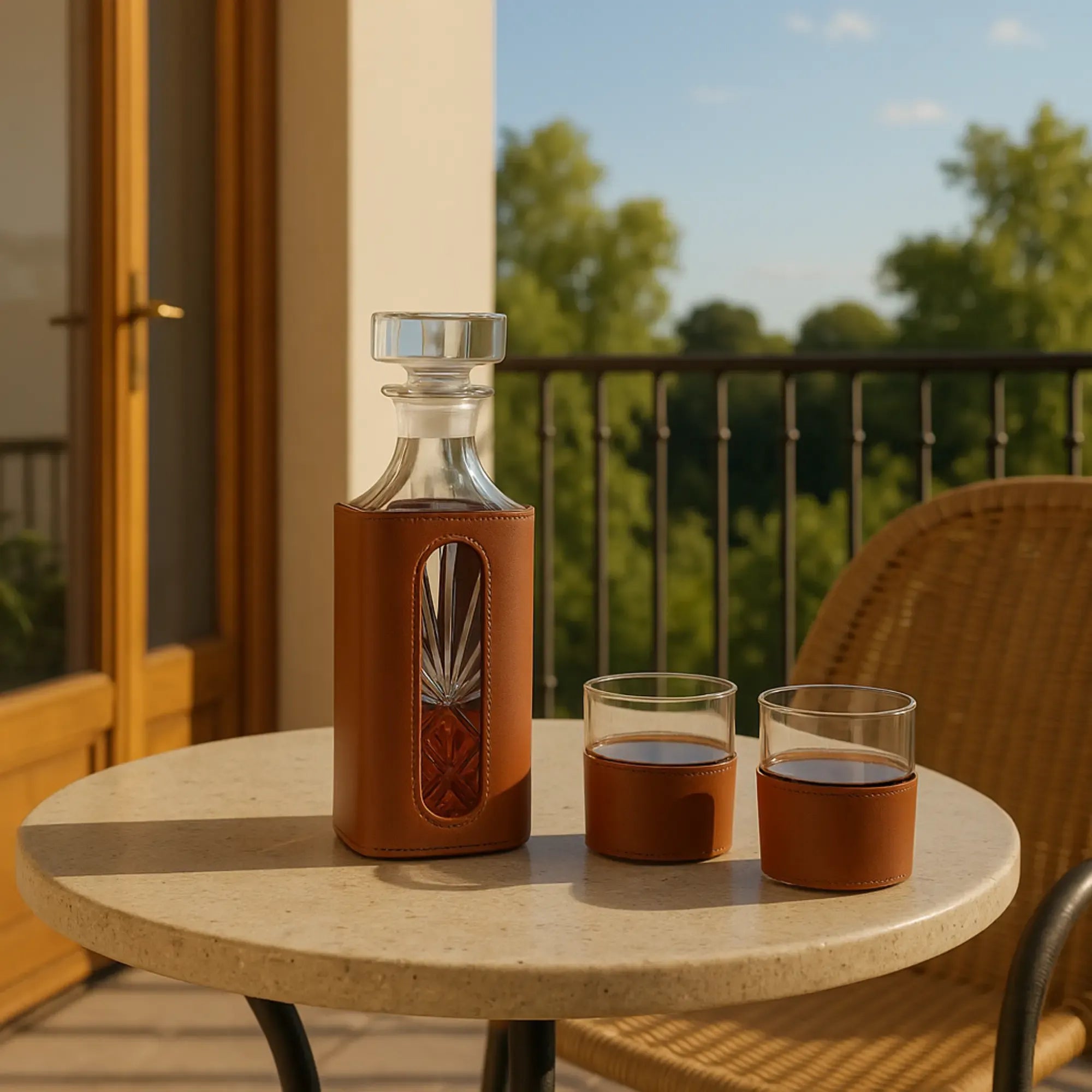 Set aus einer Karaffe und zwei Gläsern – ideal für Whiskey, Cognac oder andere hochwertige Getränke. Die Lederummantelung sorgt für sicheren Halt und stilvolle Präsentation.