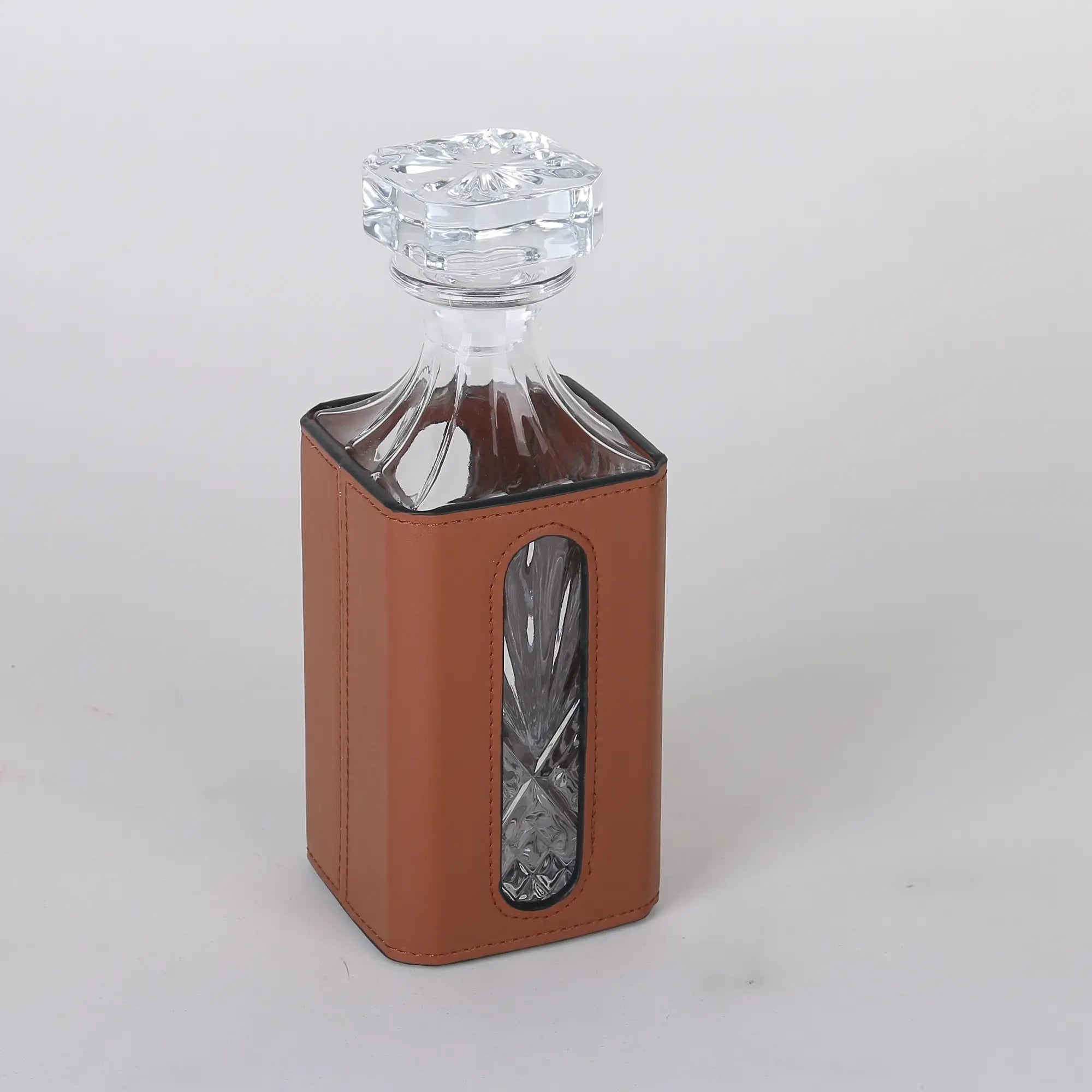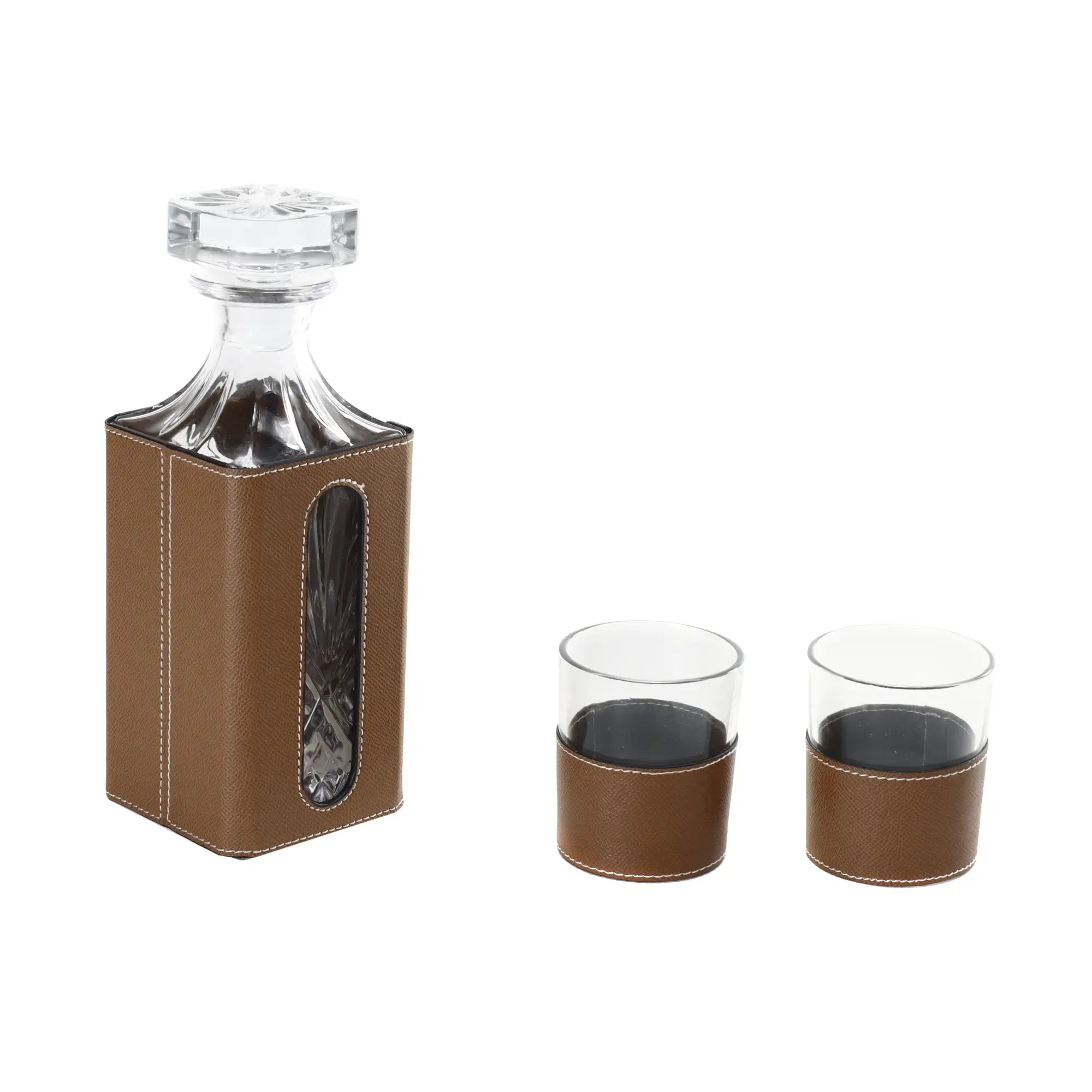 Whisky-Karaffen-Set - aus 3 Teilen mit Leder - Modernes Whiskyglas-Set Kunstlederumrandung Luxe Glas & Kunstleder, Braun, gross und robust, vom stil Elegant & Modern & Zeitlos